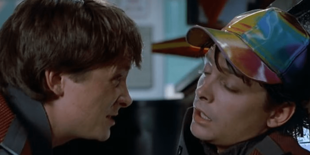 While on the subject of different perspectives, in this film we see Doc wearing a brown coat and hat while interacting with his younger self when he’s working on the “weather experiment.” It is said that if you go back to the scene in the original movie, a man with a brown coat and hat can be seen in the background. This is all one big coincidence, BUT one could argue that we saw Doc Brown from 1985 there in the original movie, meaning that the time travel rules go back to Novikov’s Self-Consistency Principle which contradicts everything in the movie.