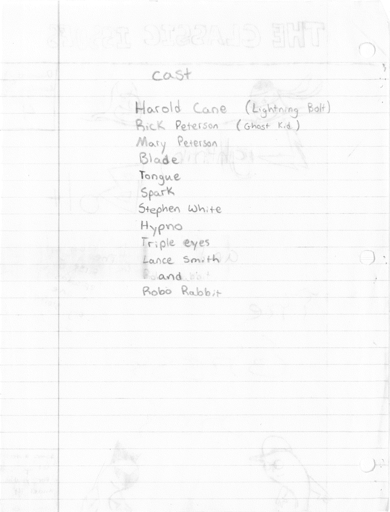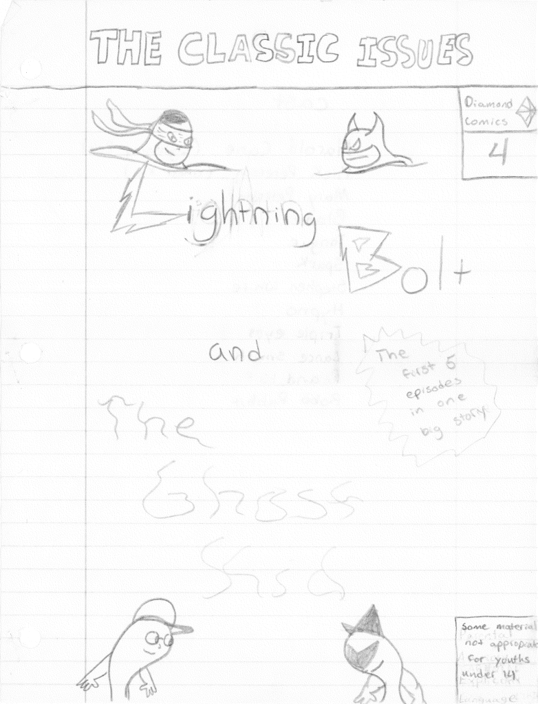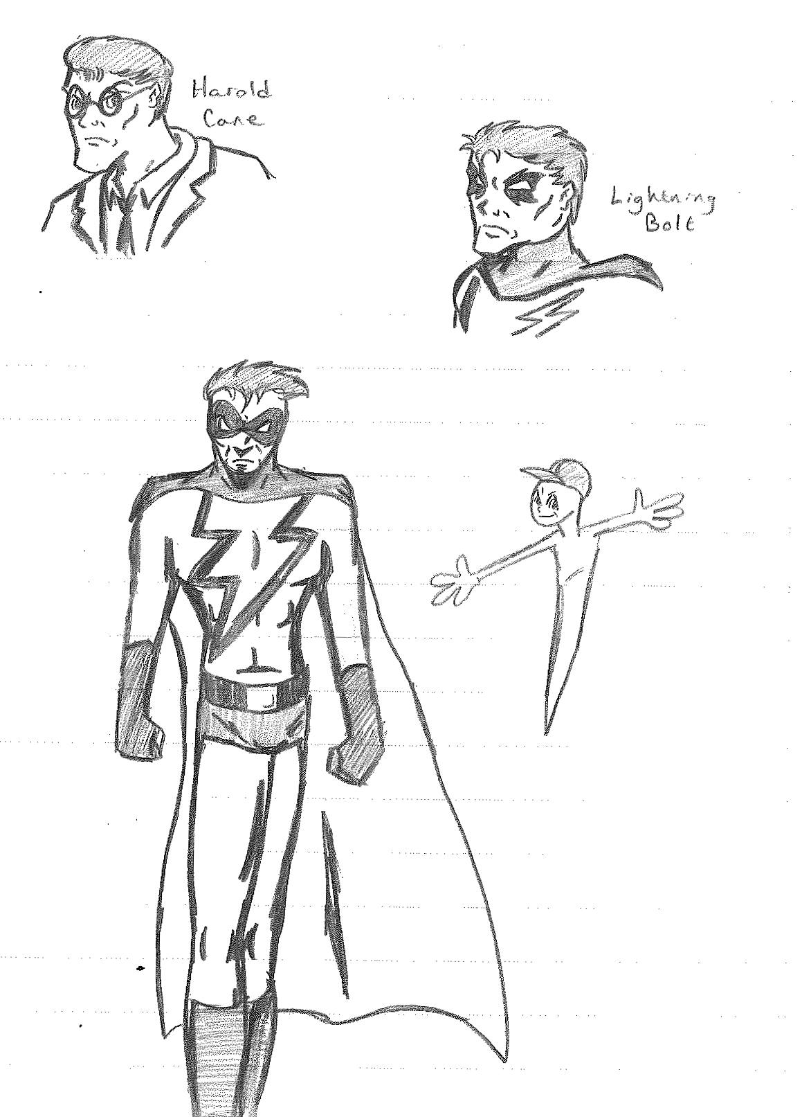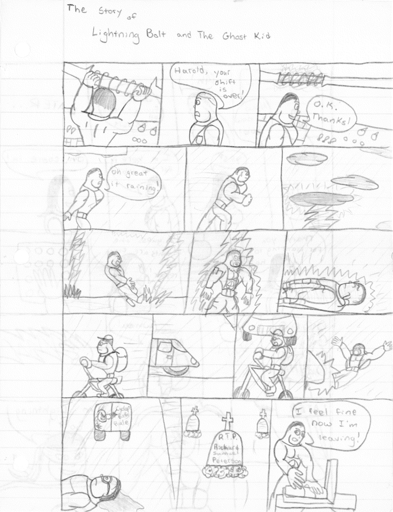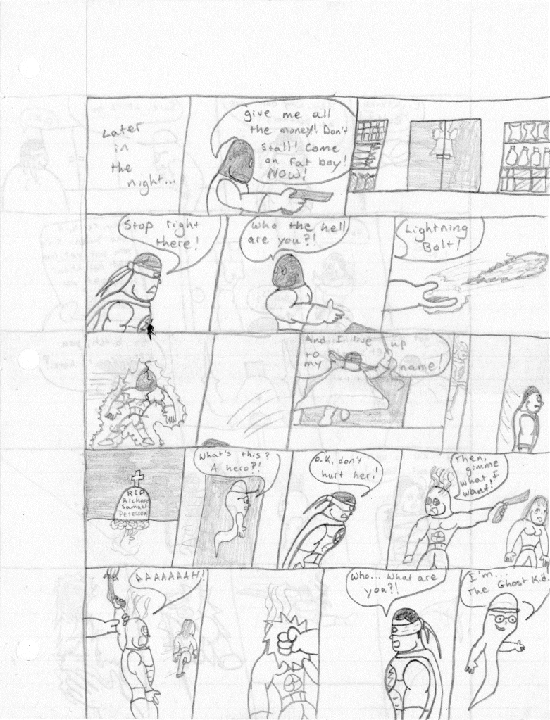 Lightning Bolt and the Ghost Kid are among my favorite creations for several different reasons. First off, they were born from ridiculous origins. From within the pages of My Book of Drawings 2 came Shnono Man and Boo Boy. These were two characters who were meant to be parody of superheroes, utilizing a facial expression used by myself and my best friend Jamin Sponaugle. Nothing about this was meant to be serious. It was just a silly drawing I did to amuse myself. I wish I could explain the names, but to my recollection, “shnono” was some goofy word we came up with.