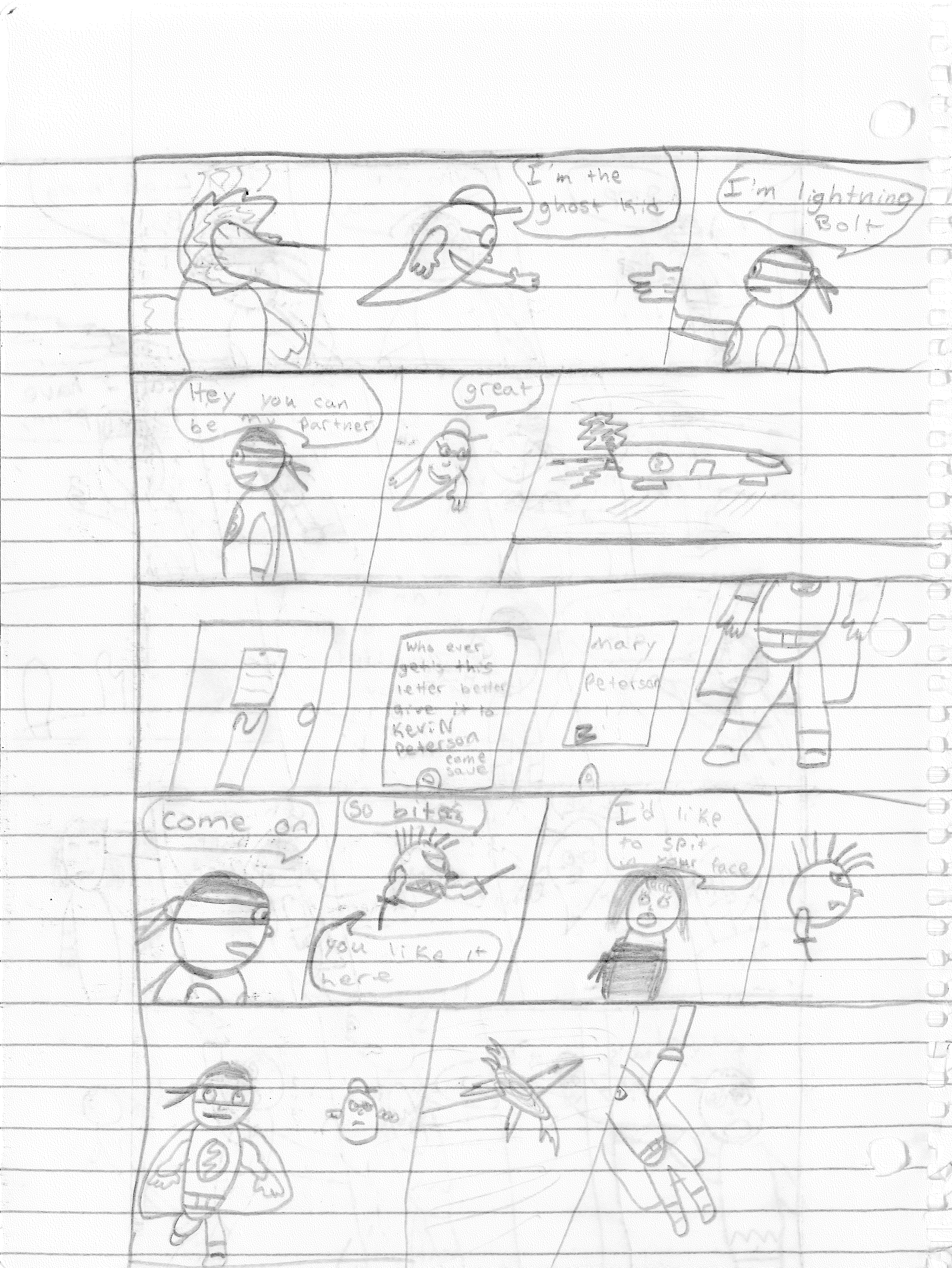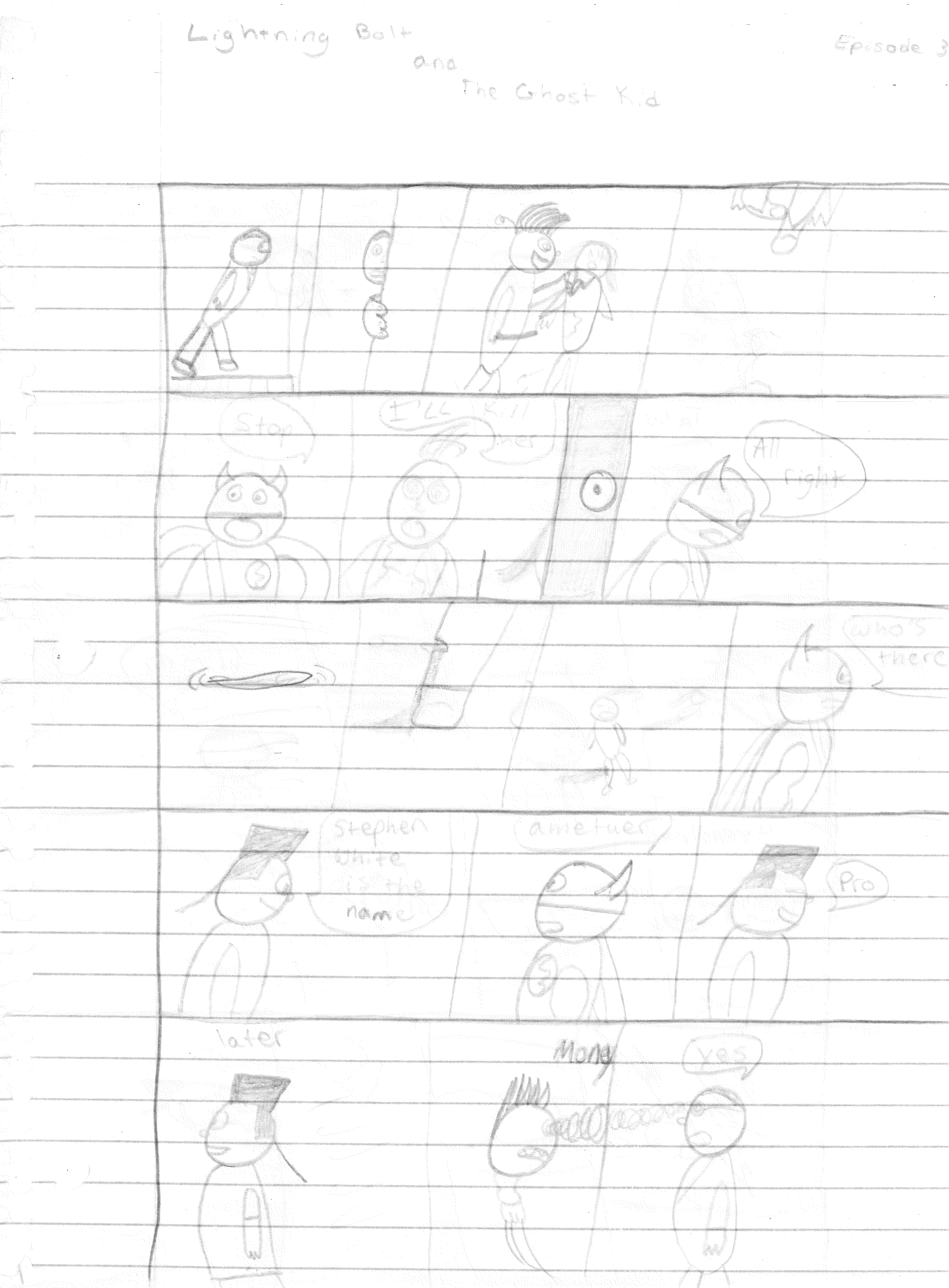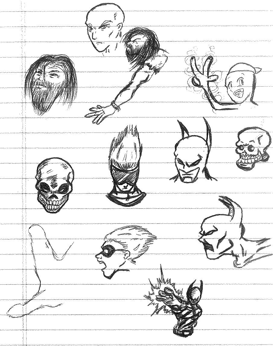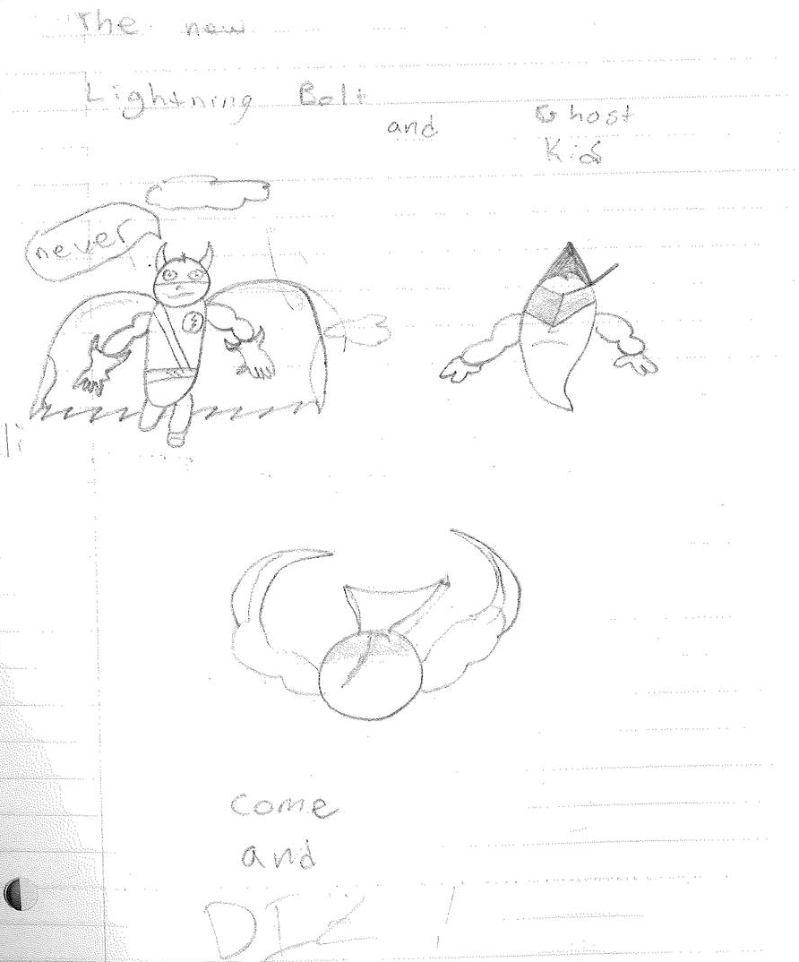 Lightning Bolt and the Ghost Kid are among my favorite creations for several different reasons. First off, they were born from ridiculous origins. From within the pages of My Book of Drawings 2 came Shnono Man and Boo Boy. These were two characters who were meant to be parody of superheroes, utilizing a facial expression used by myself and my best friend Jamin Sponaugle. Nothing about this was meant to be serious. It was just a silly drawing I did to amuse myself. I wish I could explain the names, but to my recollection, “shnono” was some goofy word we came up with.