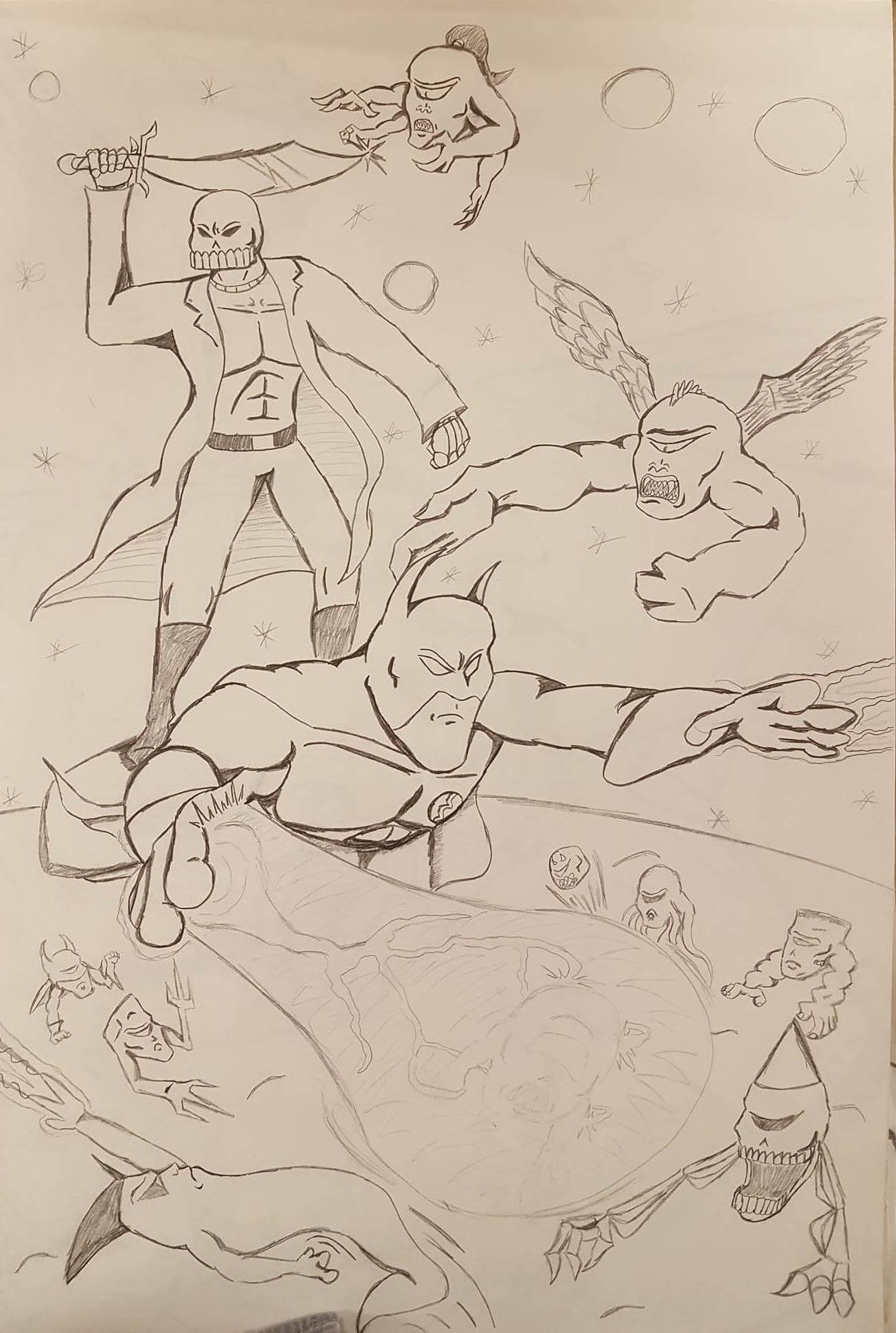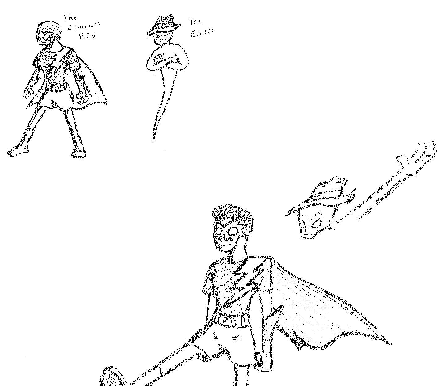 Since Lightning Bolt and the Ghost Kid had primarily fought aliens, I thought it could be fun to mix things up with an interdimensional threat. I sketched out basic shapes with a glow surrounding them that could then transform into a monstrous version of the person they copied. I feel like this idea came to me when I was writing the Overturn story of The Alien Knights Saga. When he transforms into each character, the designs are very similar, if not identical, to these new villains. Regardless, I developed a story where these interdimensional beings would ruin the reputation of our heroes. While I probably did not succeed, The Dimension Twins arc proved to me that there were more stories to be told with these characters.