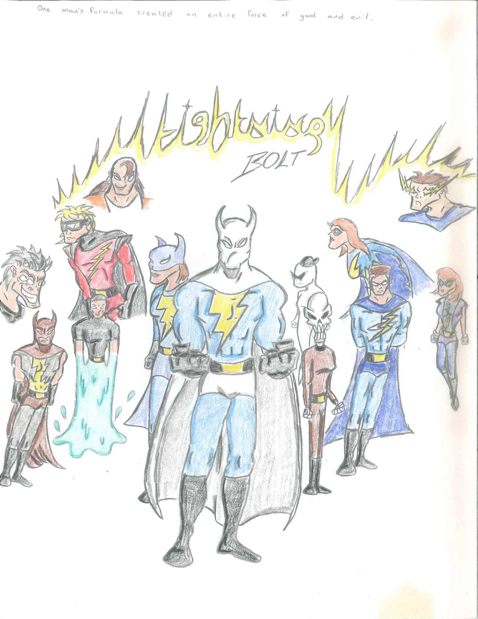 At the Weatherman’s lab, we find that the Weatherman is no longer in jail. He activates a machine that fires a beam at him, seemingly changing him. The Ghost Kid receives a report that more weather anomalies are occurring. So, Bolt and Kid decide to go check it out. Upon arriving at the lab, they notice the gaping hole in the ceiling. They fly down into the lab where they are immediately attacked by the Weatherman. The Weatherman gives them no chance to recover, and continues to pummel them. Suddenly, Thunder randomly appears with a number of other characters ready to put a beatdown of the Weatherman. One by one, they each take their turn. He is burned, bombed, stabbed, frozen, shattered, and dropped from the sky. One might assume he’s dead, but I think he was meant to live. In the end, Bolt and Kid wonder why some other super-powered people came to help. Bolt thinks that they too got fed up with the weather changing. So, the Kid responds that now they have frenemies which Bolt doesn’t understand. THE END