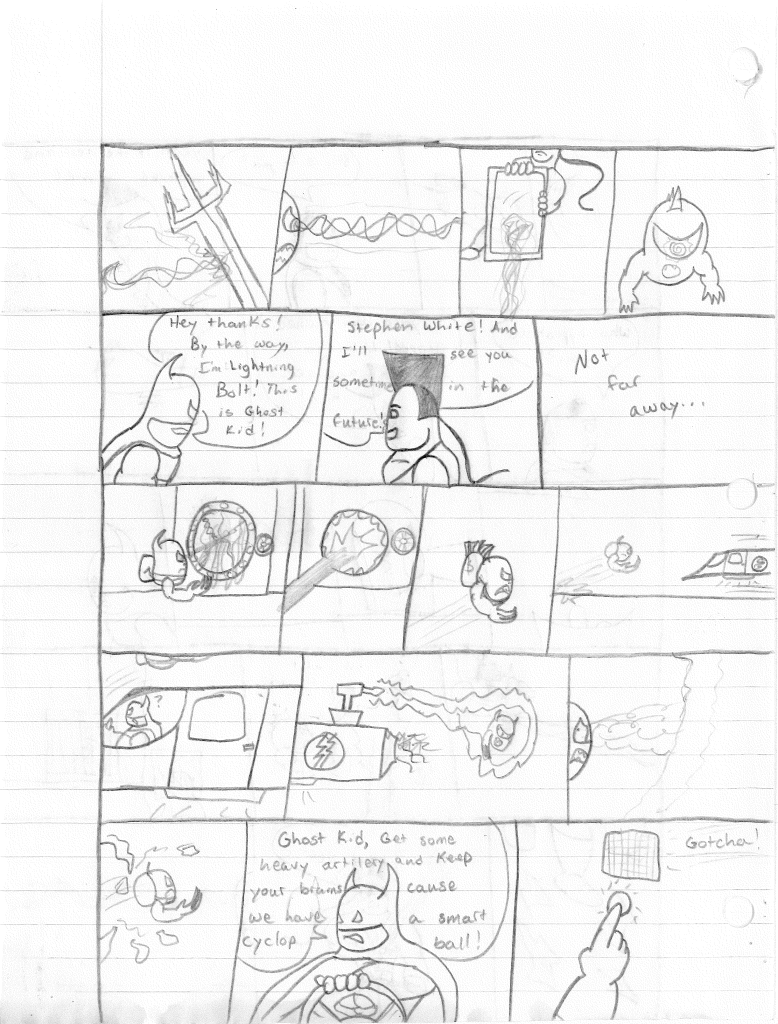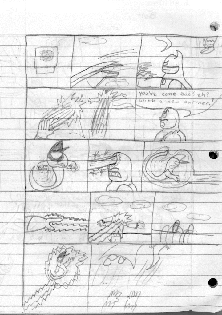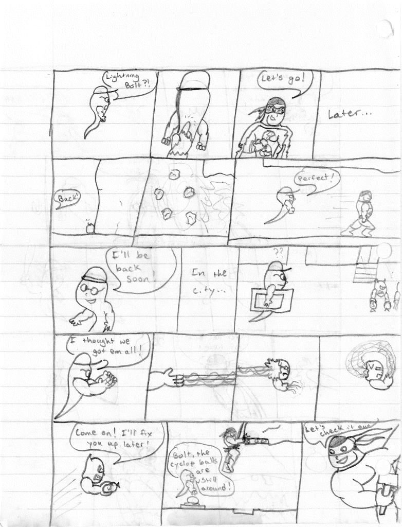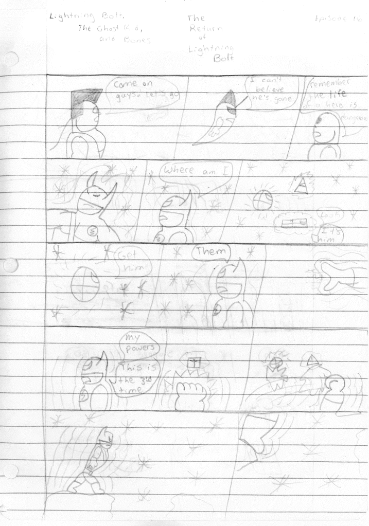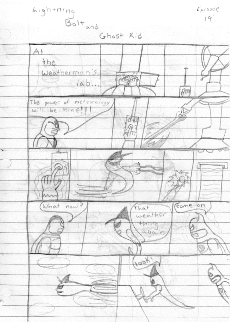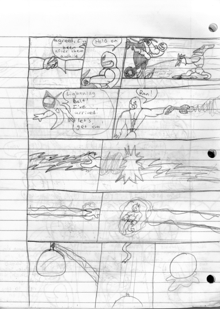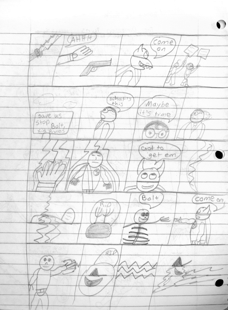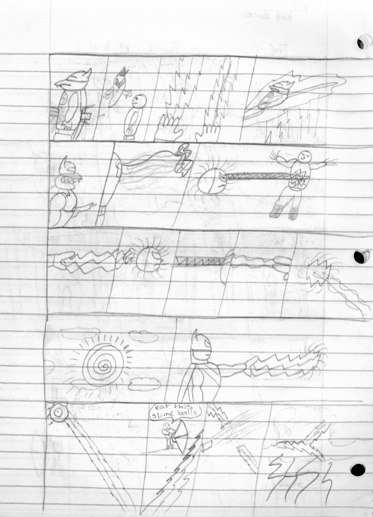 So the end of the last story was not just a clever preview but a panel to kickstart the next story. Lightning Bolt and Twin Bolt clash their powers. Bolt gets a quick shot in, hitting Twin Bolt. The Ghost Kid attempts to escape this electric prison Twin Bolt had made, but unfortunately he made it ghost-proof. Yet somehow, Bones is able to use his scimitar to “cut” through the electric bars and allow them to escape. Kid and Bones observe Bolt fighting. Bones takes an opportunity to help and throws his scimitar. [SIDE NOTE: You may notice that I drew Bones throwing his sword at the camera twice on one page. I had recently learned that trick and wanted to show it off.] The scimitar pierces Twin Bolt’s body. Bolt then hit Twin Bolt with a massive shock, effectively reverting the Twin back to its original form.