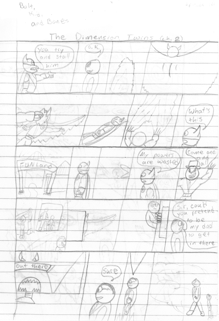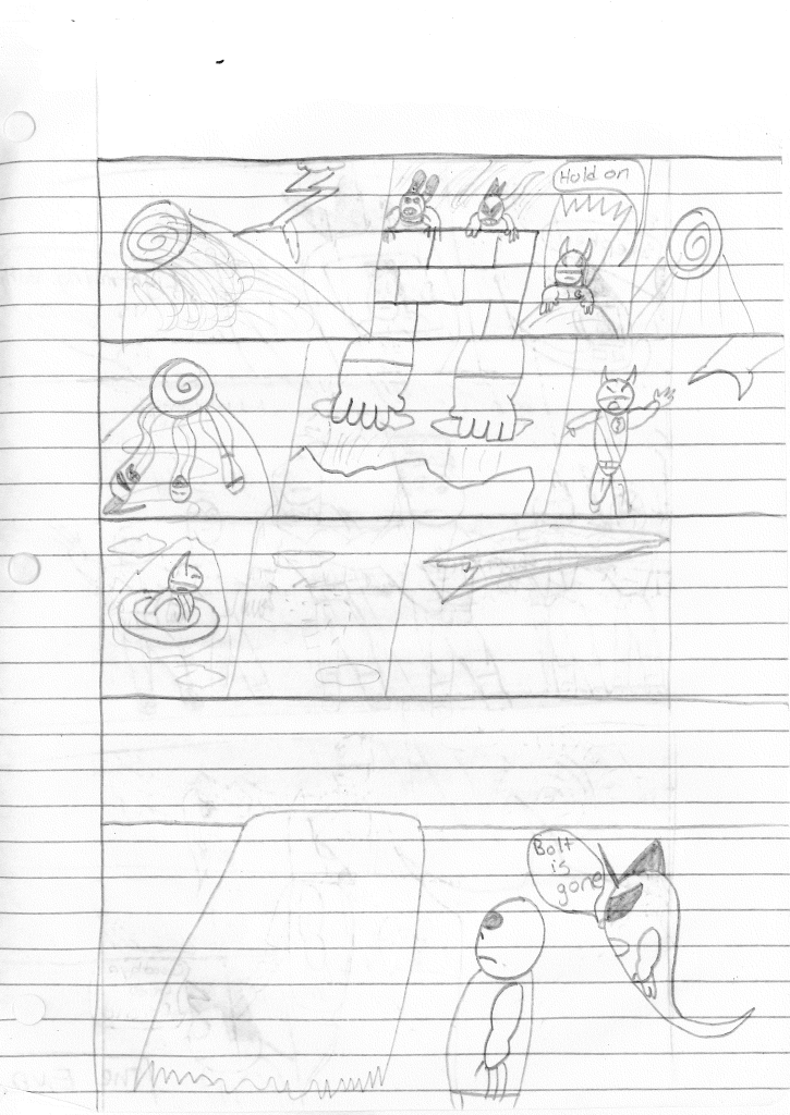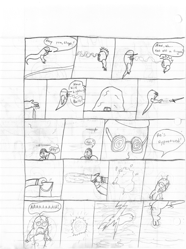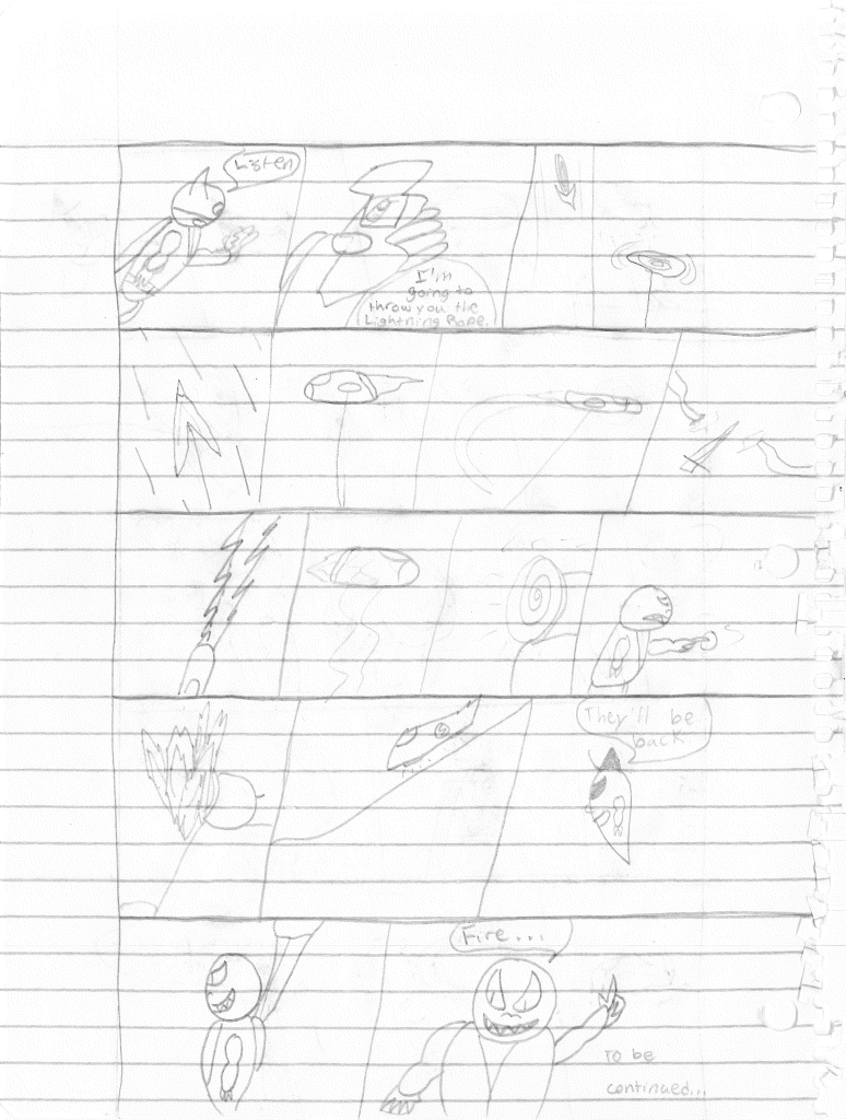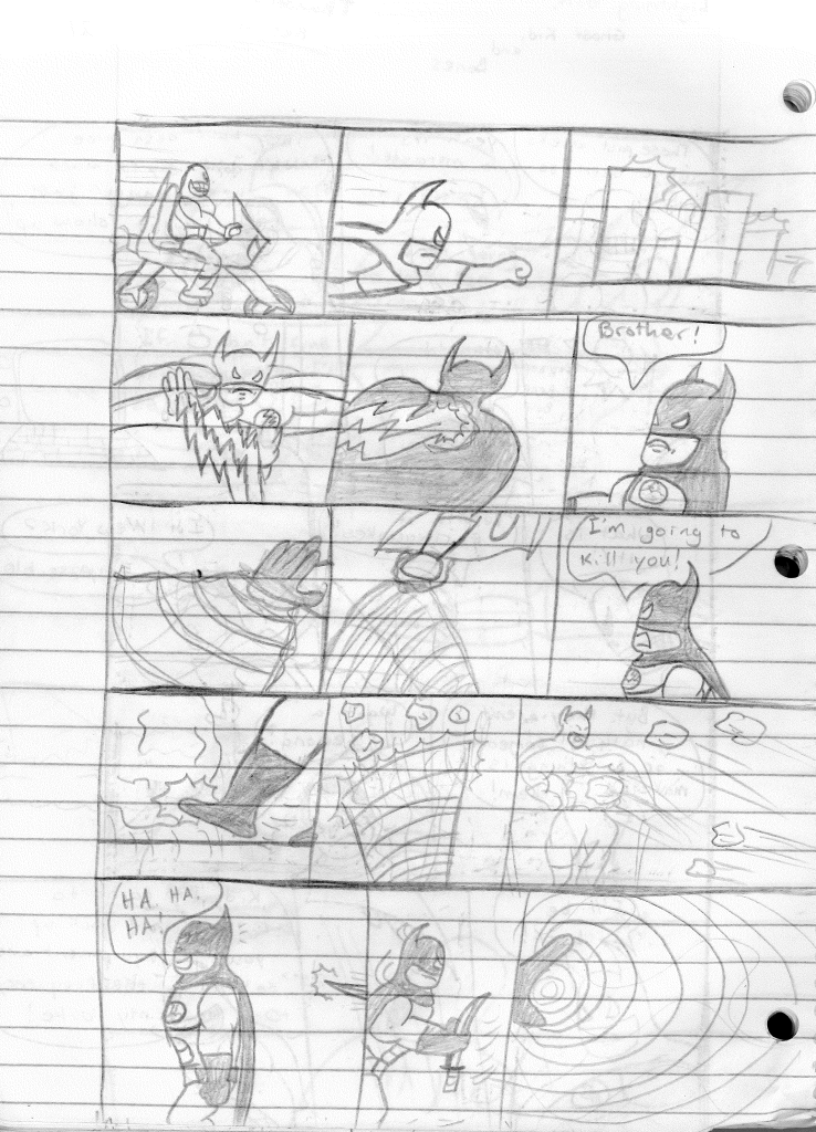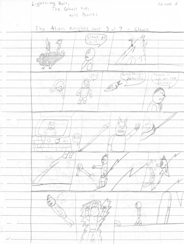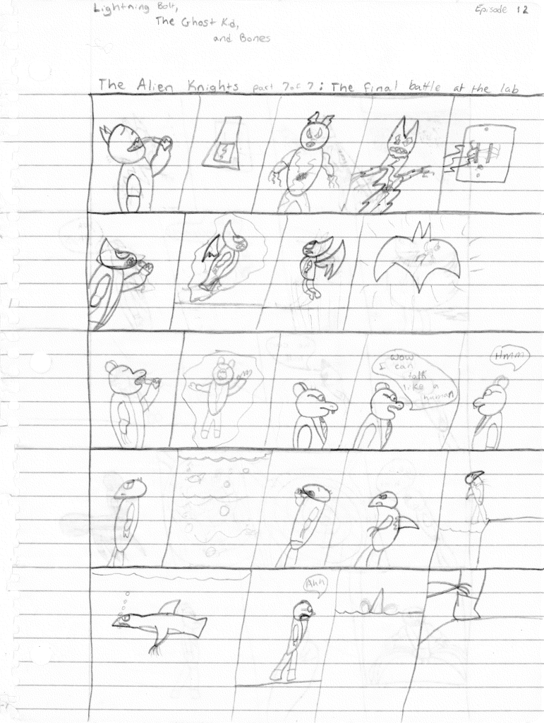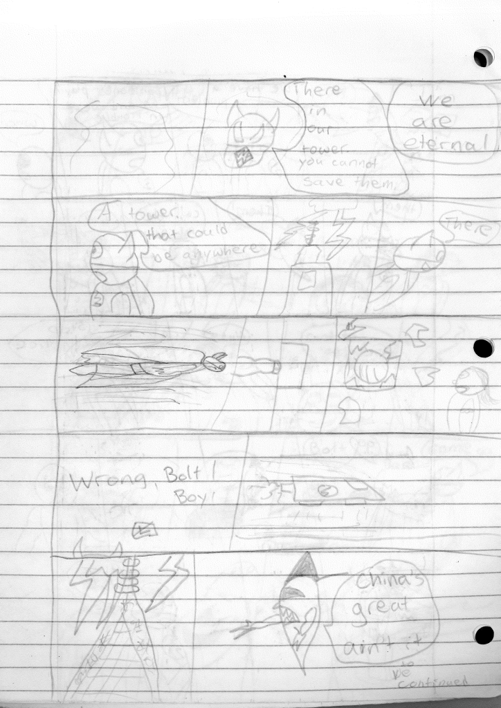 So the end of the last story was not just a clever preview but a panel to kickstart the next story. Lightning Bolt and Twin Bolt clash their powers. Bolt gets a quick shot in, hitting Twin Bolt. The Ghost Kid attempts to escape this electric prison Twin Bolt had made, but unfortunately he made it ghost-proof. Yet somehow, Bones is able to use his scimitar to “cut” through the electric bars and allow them to escape. Kid and Bones observe Bolt fighting. Bones takes an opportunity to help and throws his scimitar. [SIDE NOTE: You may notice that I drew Bones throwing his sword at the camera twice on one page. I had recently learned that trick and wanted to show it off.] The scimitar pierces Twin Bolt’s body. Bolt then hit Twin Bolt with a massive shock, effectively reverting the Twin back to its original form.