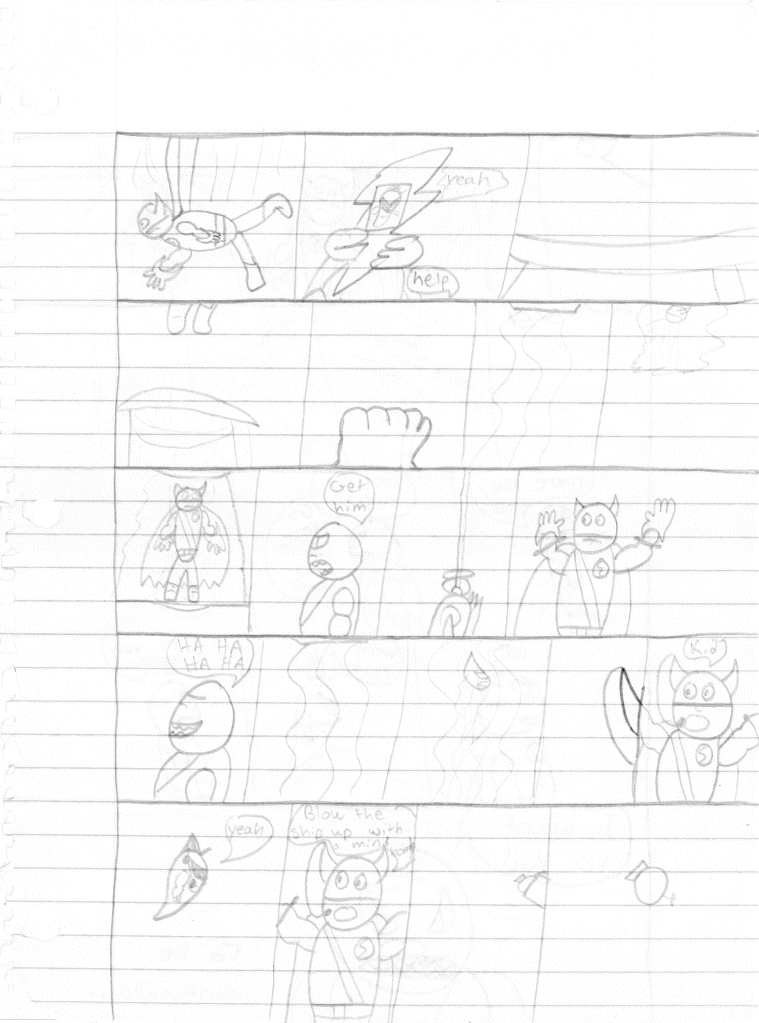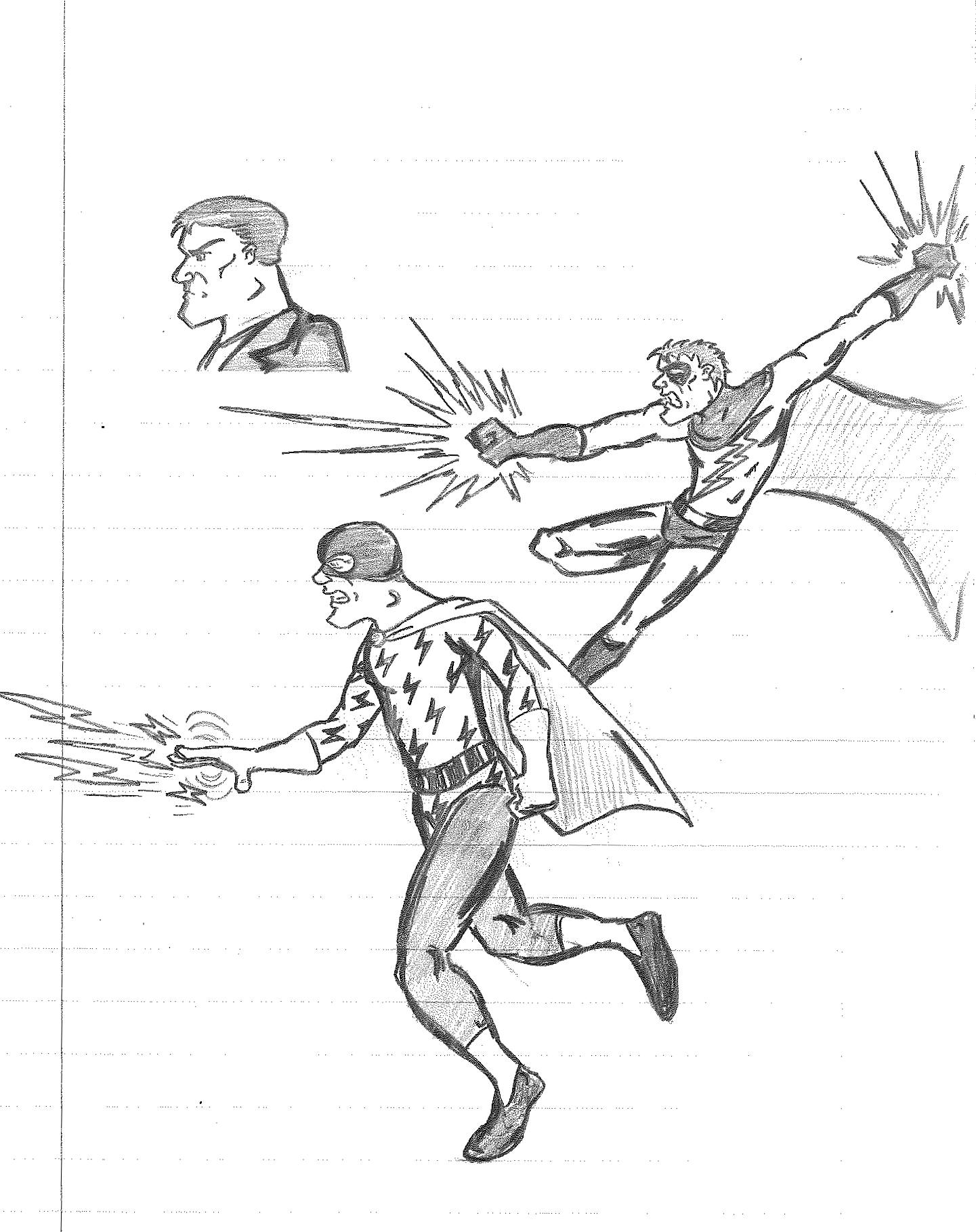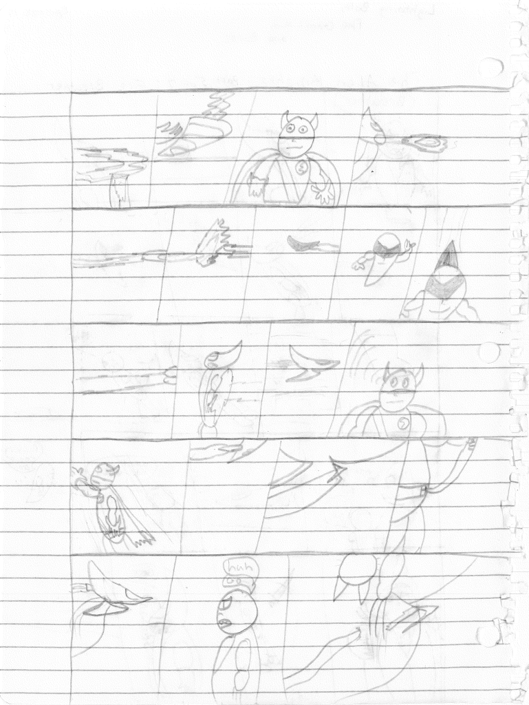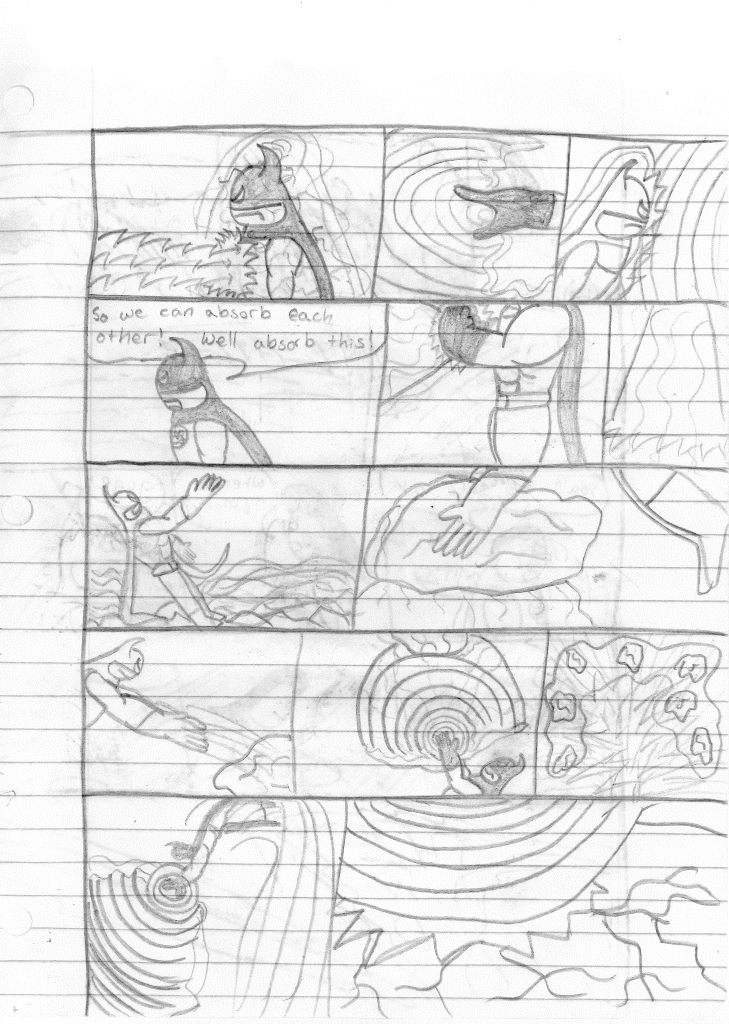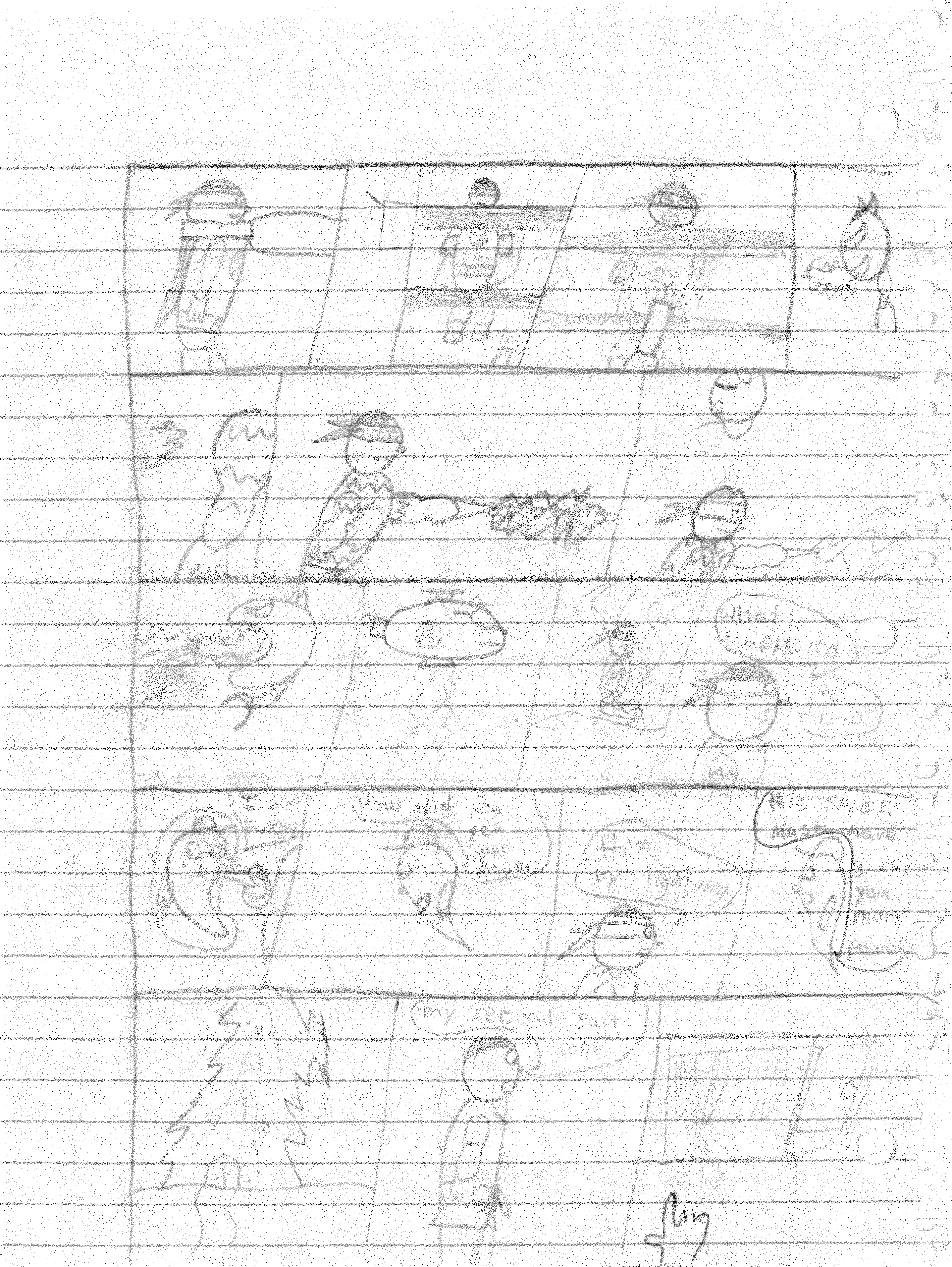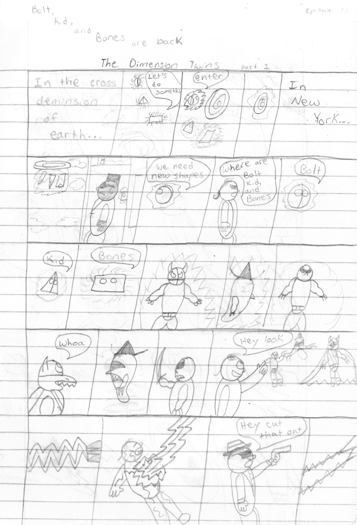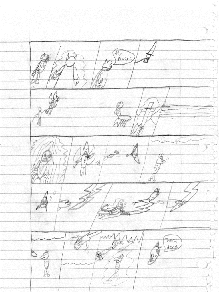 So the end of the last story was not just a clever preview but a panel to kickstart the next story. Lightning Bolt and Twin Bolt clash their powers. Bolt gets a quick shot in, hitting Twin Bolt. The Ghost Kid attempts to escape this electric prison Twin Bolt had made, but unfortunately he made it ghost-proof. Yet somehow, Bones is able to use his scimitar to “cut” through the electric bars and allow them to escape. Kid and Bones observe Bolt fighting. Bones takes an opportunity to help and throws his scimitar. [SIDE NOTE: You may notice that I drew Bones throwing his sword at the camera twice on one page. I had recently learned that trick and wanted to show it off.] The scimitar pierces Twin Bolt’s body. Bolt then hit Twin Bolt with a massive shock, effectively reverting the Twin back to its original form.