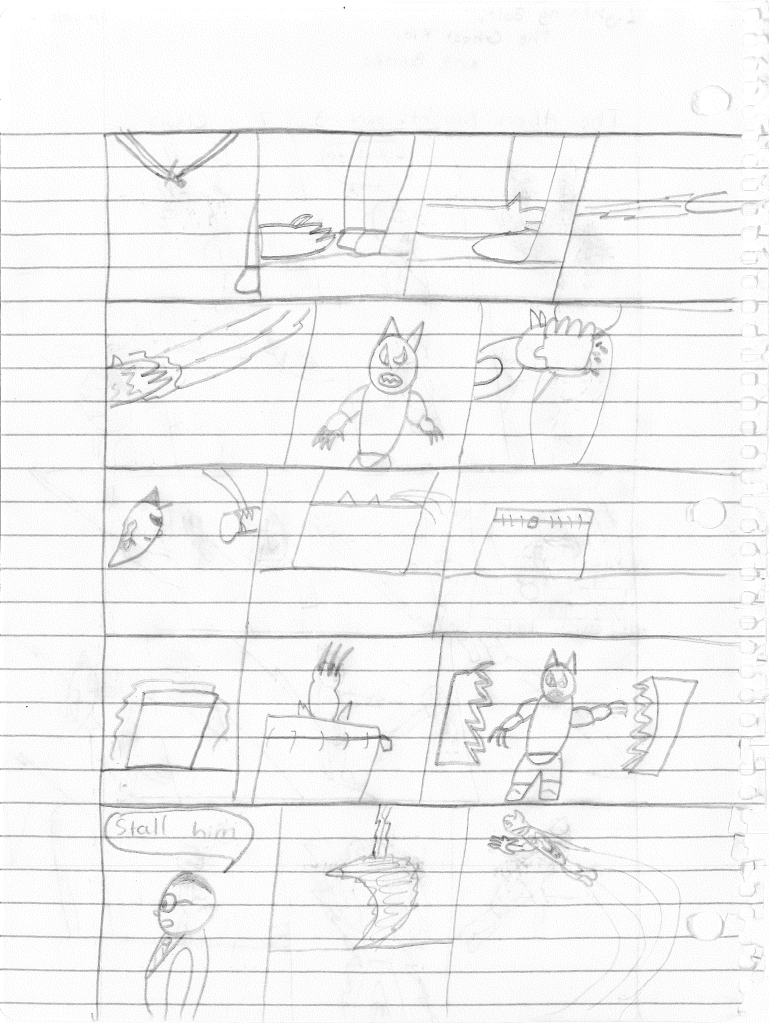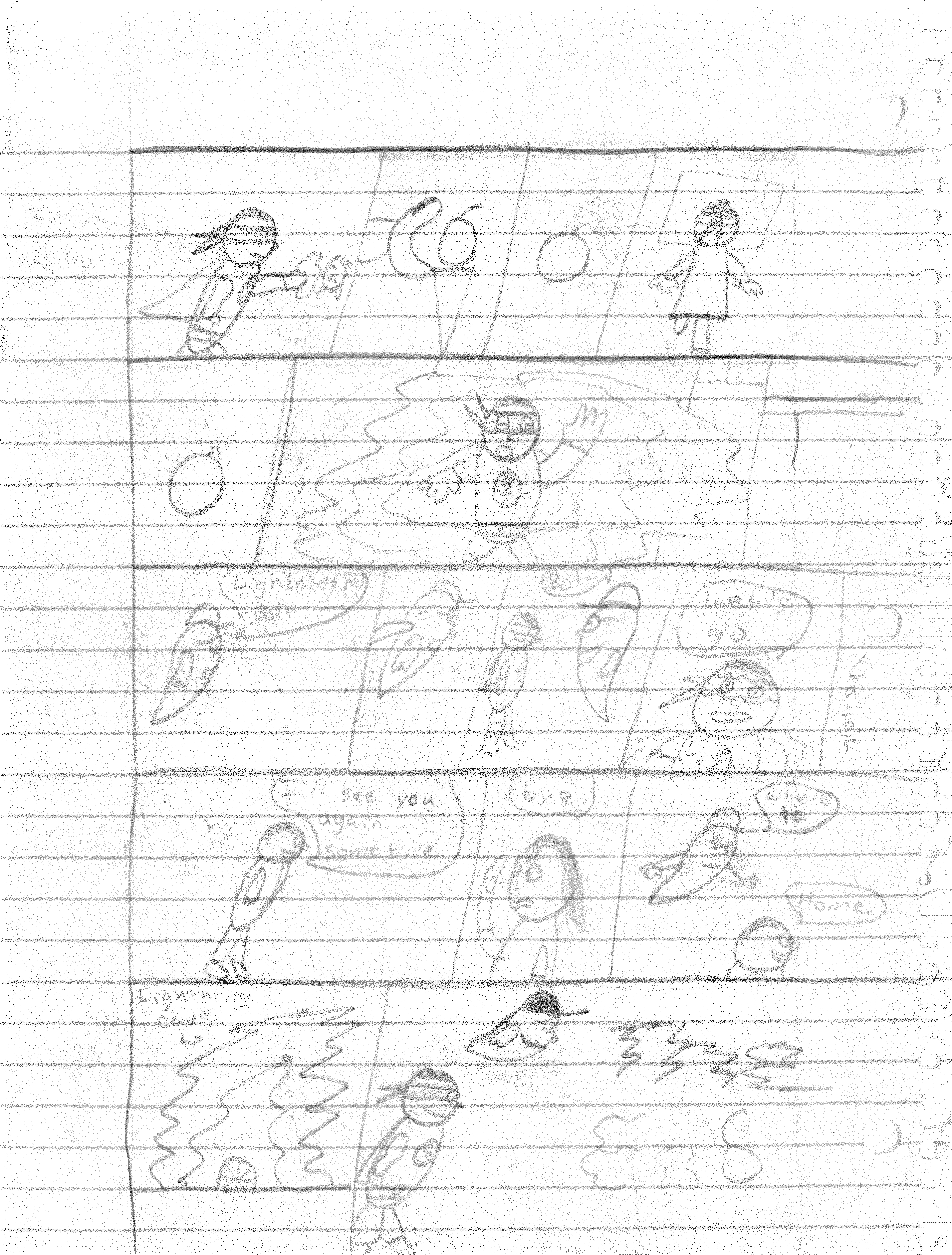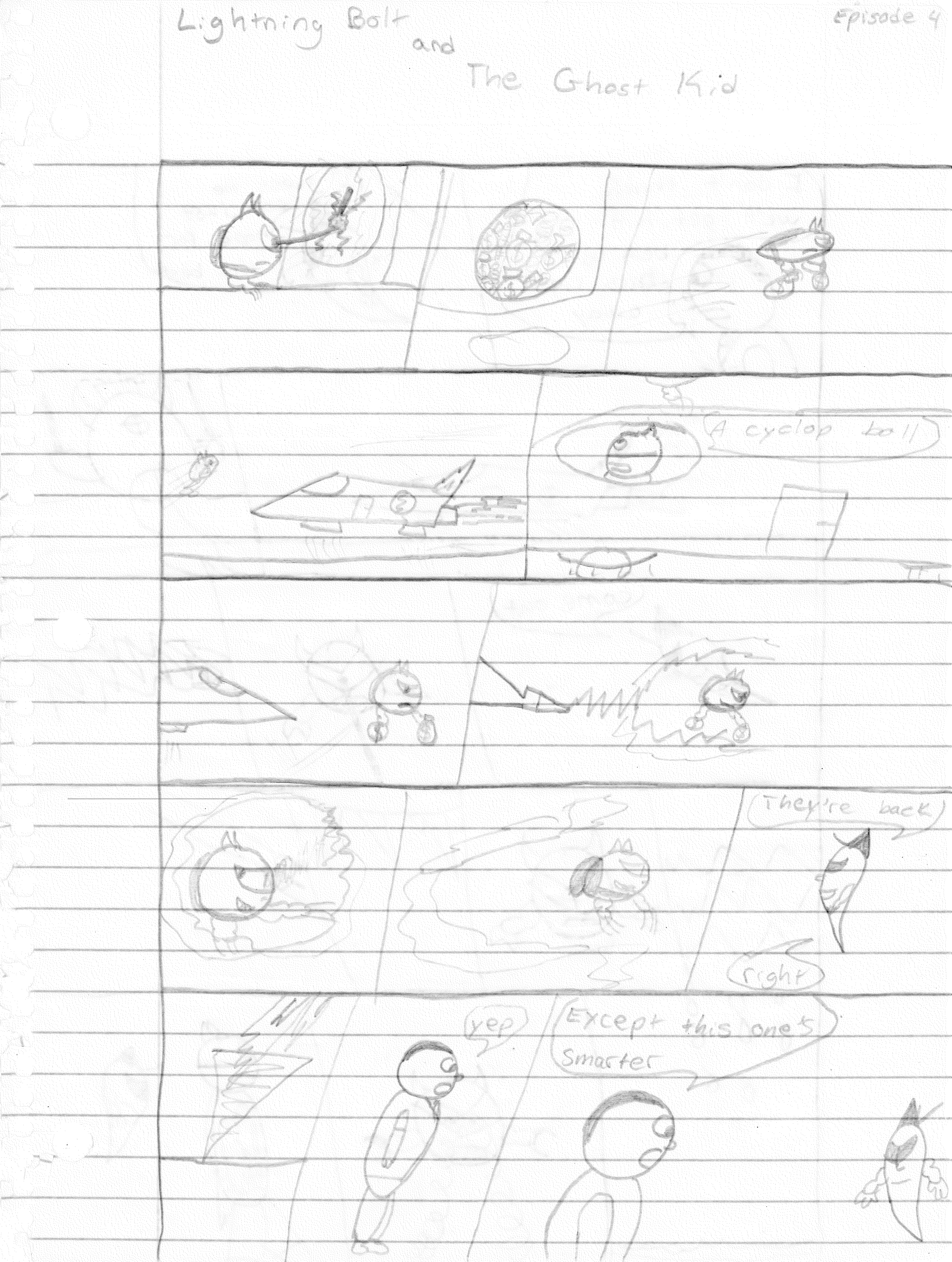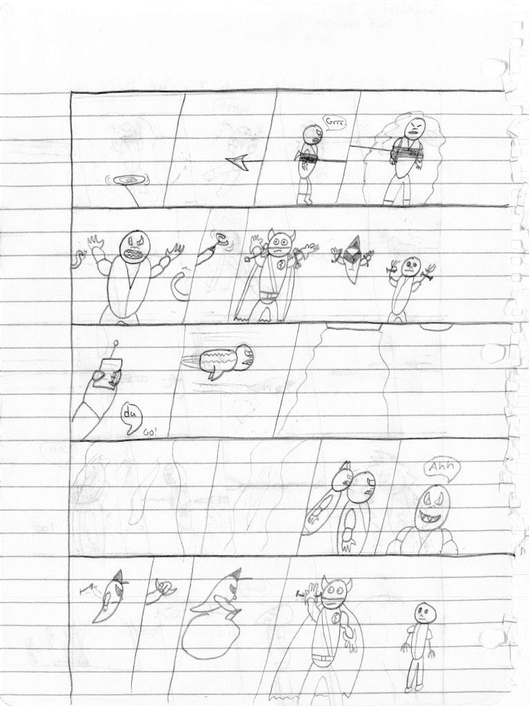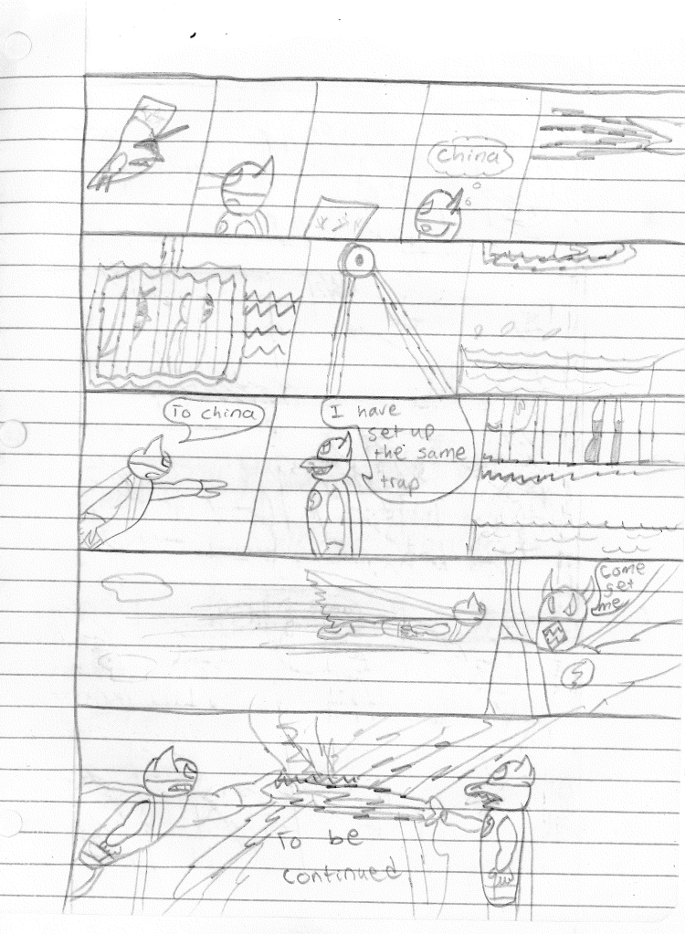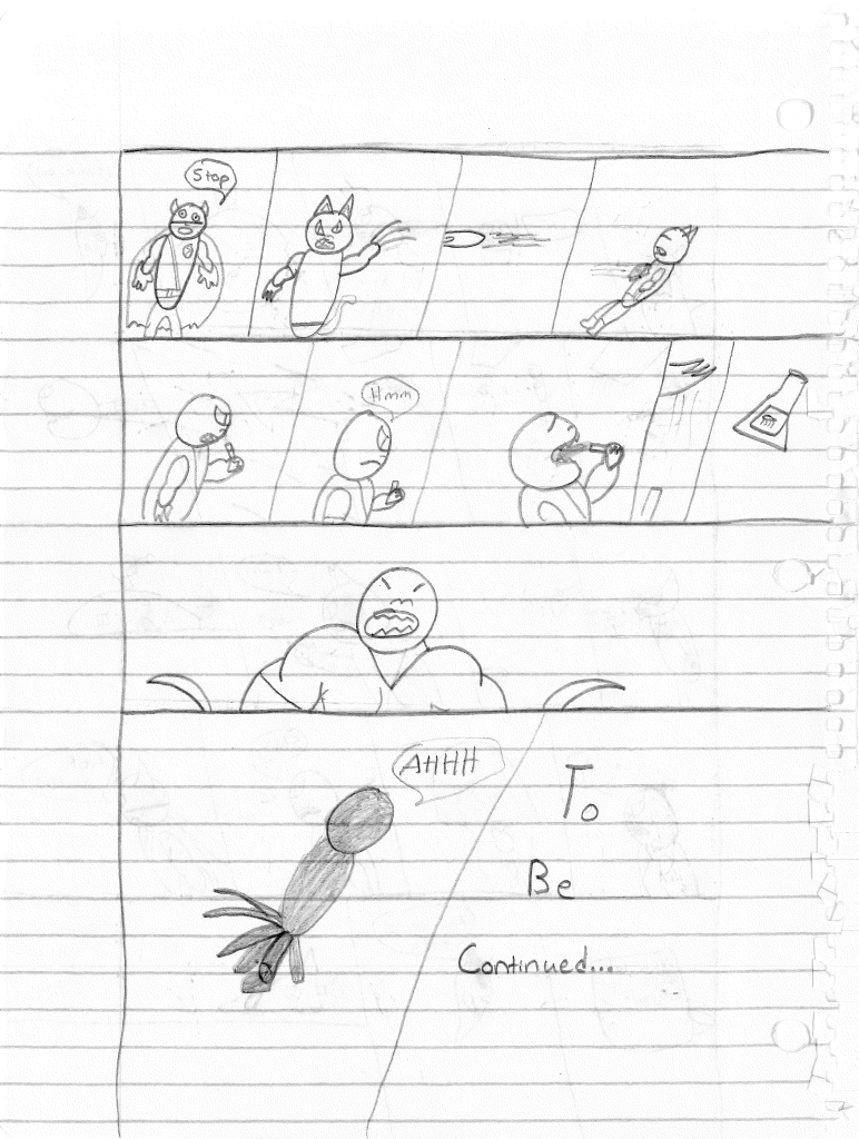 So the end of the last story was not just a clever preview but a panel to kickstart the next story. Lightning Bolt and Twin Bolt clash their powers. Bolt gets a quick shot in, hitting Twin Bolt. The Ghost Kid attempts to escape this electric prison Twin Bolt had made, but unfortunately he made it ghost-proof. Yet somehow, Bones is able to use his scimitar to “cut” through the electric bars and allow them to escape. Kid and Bones observe Bolt fighting. Bones takes an opportunity to help and throws his scimitar. [SIDE NOTE: You may notice that I drew Bones throwing his sword at the camera twice on one page. I had recently learned that trick and wanted to show it off.] The scimitar pierces Twin Bolt’s body. Bolt then hit Twin Bolt with a massive shock, effectively reverting the Twin back to its original form.
