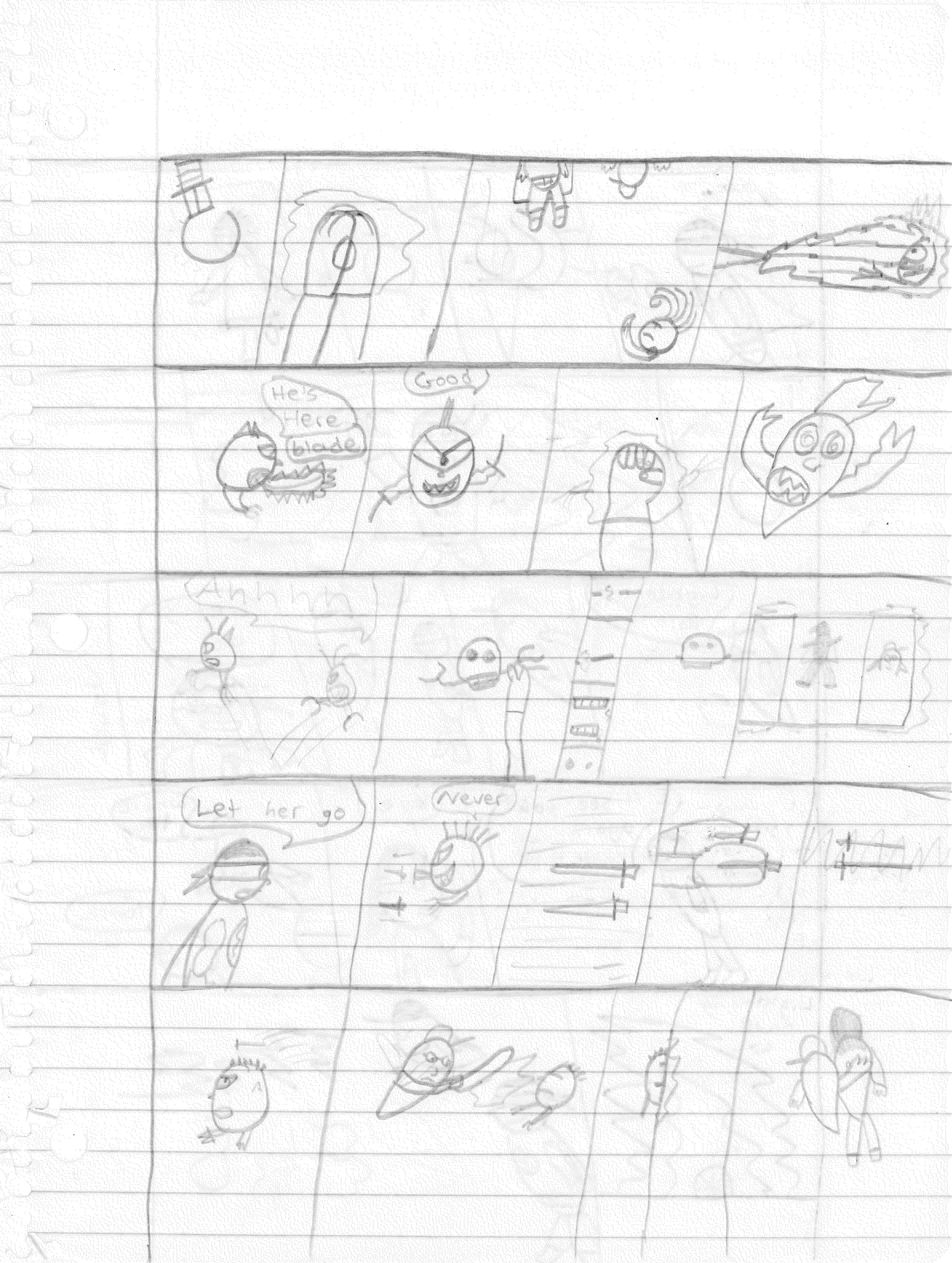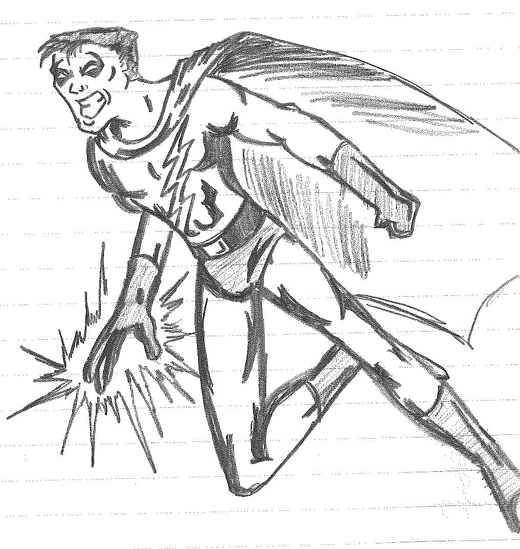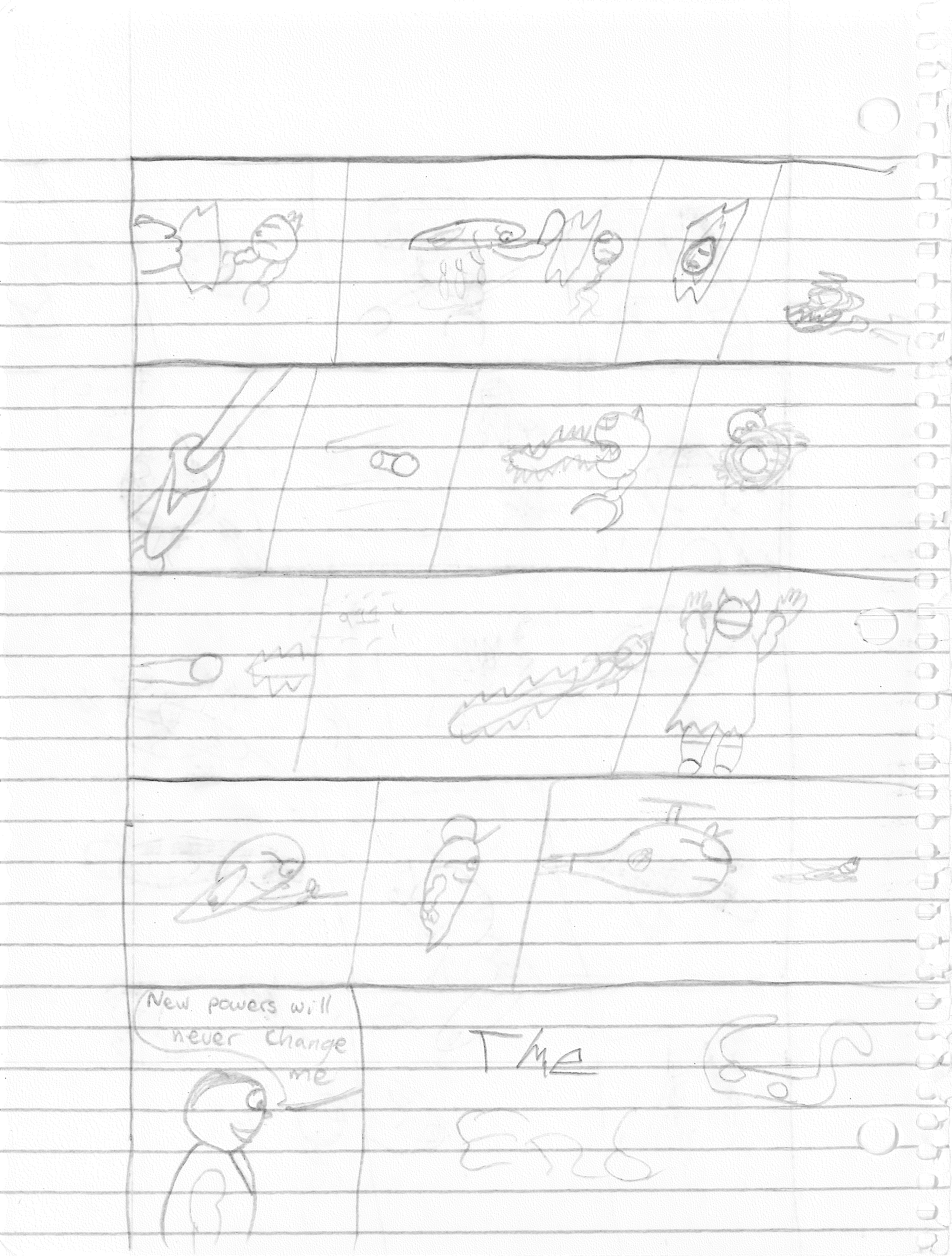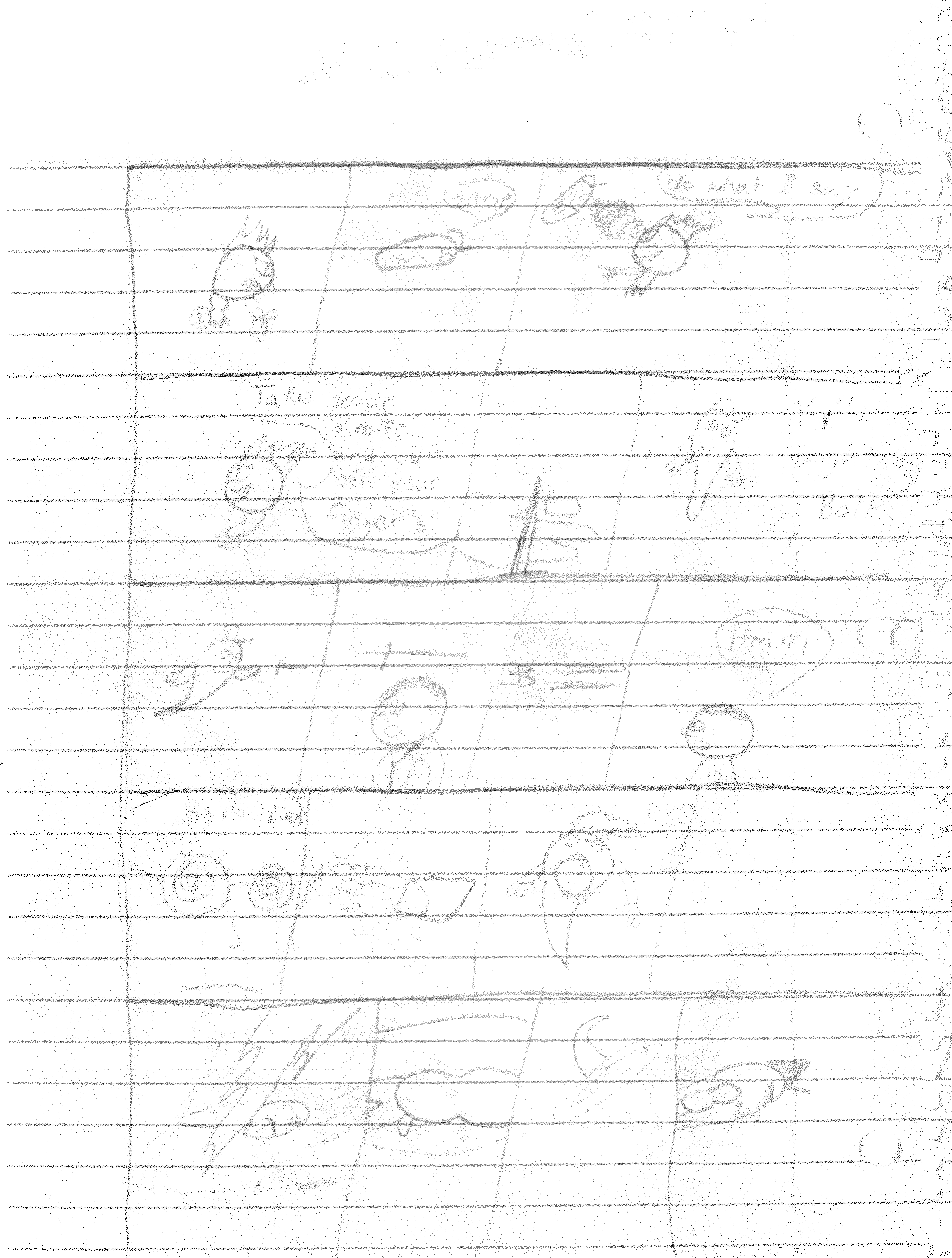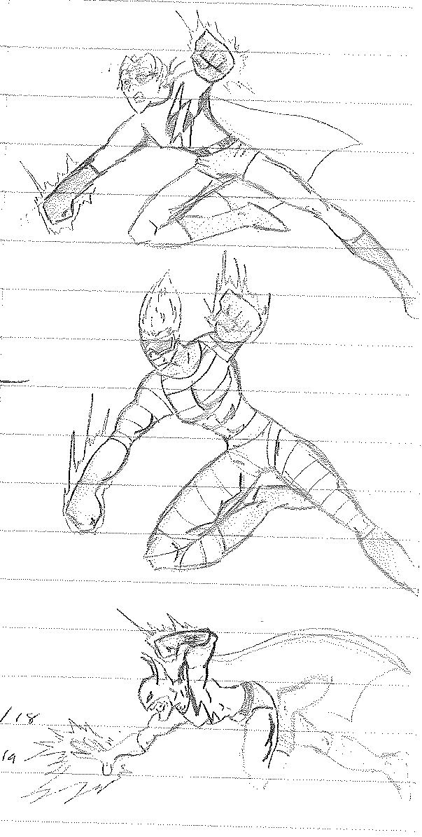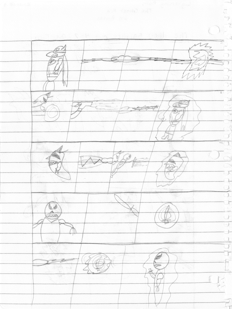So the end of the last story was not just a clever preview but a panel to kickstart the next story. Lightning Bolt and Twin Bolt clash their powers. Bolt gets a quick shot in, hitting Twin Bolt. The Ghost Kid attempts to escape this electric prison Twin Bolt had made, but unfortunately he made it ghost-proof. Yet somehow, Bones is able to use his scimitar to “cut” through the electric bars and allow them to escape. Kid and Bones observe Bolt fighting. Bones takes an opportunity to help and throws his scimitar. [SIDE NOTE: You may notice that I drew Bones throwing his sword at the camera twice on one page. I had recently learned that trick and wanted to show it off.] The scimitar pierces Twin Bolt’s body. Bolt then hit Twin Bolt with a massive shock, effectively reverting the Twin back to its original form.