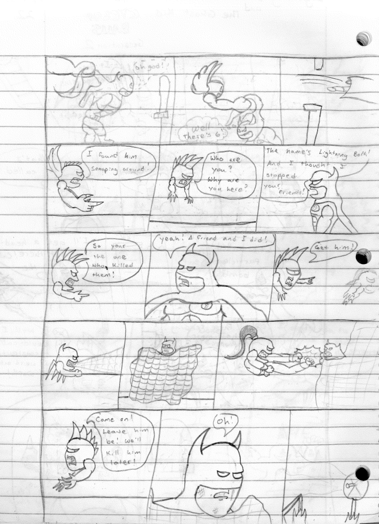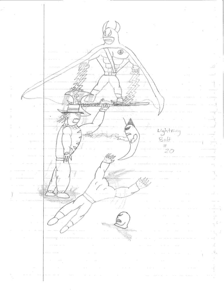 I would assume since I didn’t follow through with that idea is why I chose instead to bring back one of the bigger threats. Even though they were much less of a threat this time around. I also realized that Bones had been absent since the end of the Dimension Twins arc. Not sure why I did that but his appearance did change between stories. I also love the addition of Lightning Bolt cowl radio. Now, follow my teen logic here. Cellphones were not a things. Radio communication requires towers and signals. So, for Lightning Bolt to communicate back to the cave, he needs a dedicated satellite. I envisioned this small, portable satellite coming out of his horn, along with a microphone. Never once thinking in a realm of fantasy and advanced technology. No, this had to be the thing that had to remain realistic. Not sure why I had this need to base something in reality when pure fiction gives you so much more freedom.