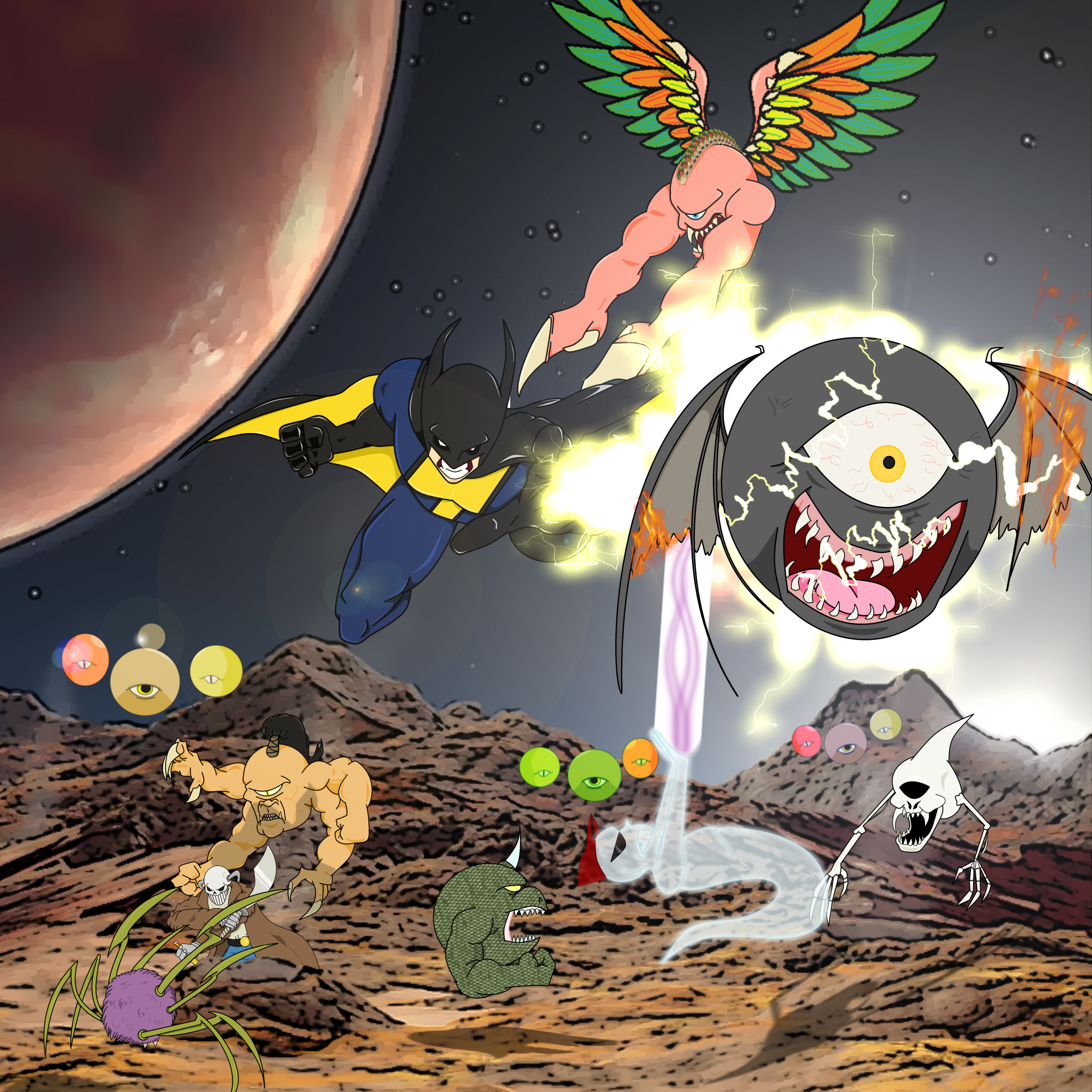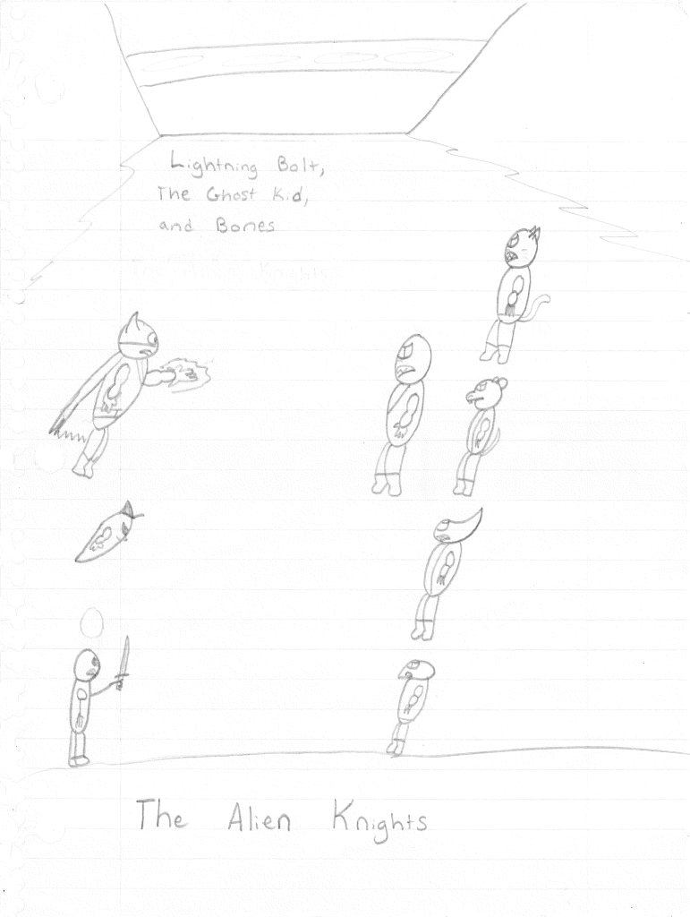 The Solar Stalker agrees, and they head off to confront them. Lightning Bolt and the Ghost Kid already engaged the Alien Knights. The Ghost Kid crushes Cattytwo using a nearby wrecking ball. Lightning Bolt fries Shark, officially making him the most useless added character. Rattytwo hold Lightning Bolt at gunpoint, but is quickly dispatched by Bones via a scimitar to the head. Lightning Bolt then fries Fire Breathertwo. Ghost Kid lobotomizes Overturntwo. And finally the Solar Stalker kills the Leader too. Afterwards, the Solar Stalker decides he needs to keep searching, but the Ghost Kid believes he will return. THE END