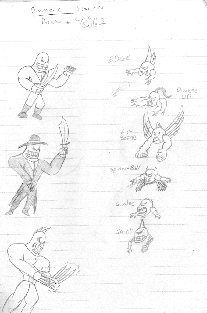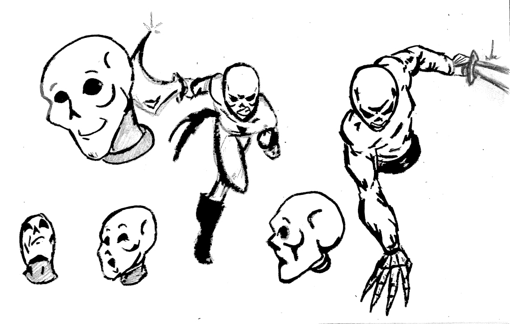 Looking back on the original parody, I would guess I landed on the name ‘Lightning Bolt’ due to the symbol on Shnono Man’s chest looking like a bolt of lightning. The Ghost Kid is obvious. Looking at the original drawing, which was also created in My Book of Drawings 3 I don’t think I had any ideas on a story. It was just a serious take on a silly drawing. Also, in the original drawing, I drew some villainous character lurking in a sub under the water since (for some reason) Shnono Man was running on a dock. A similar (if not the same) character appears in the “NEW” version as well. I wish I could remember why this became my villain of choice, but whatever it was, I committed to it with Bolt and Kid. When I considered rebooting the characters, I had created a new collection of criminals, reminiscent of these “cyclops balls.”