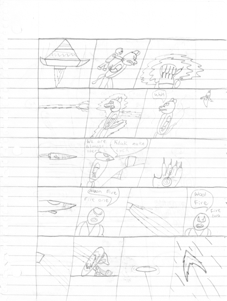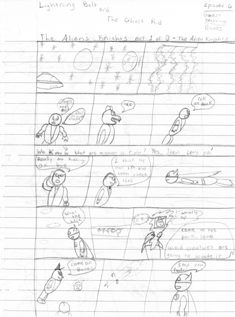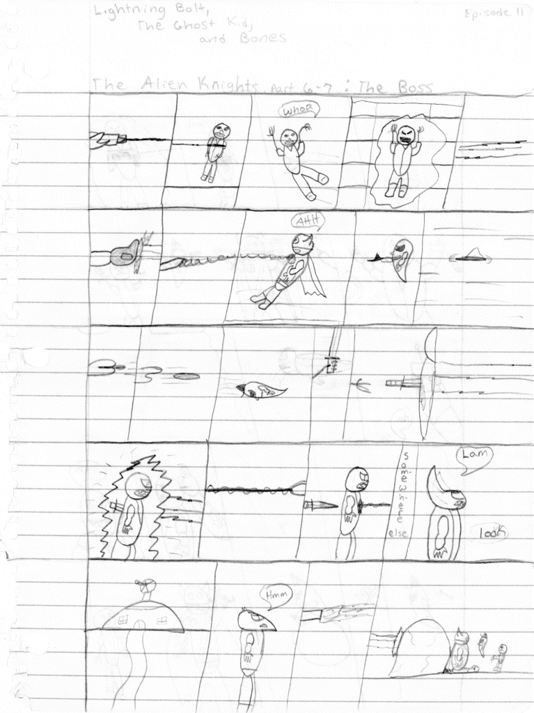 Upon arriving, the Leader orders them to open fire on the trio. Lightning Bolt throws his grappling hook at the spacecraft that has changed form between panels. The Alien Knights beam down but also cut the grappling rope on their way (??). The spacecraft explodes into the side of a mountain (?). The Ghost Kid see that the Knight have escaped. The Leader points his non-alien looking gun at Bones who distracts him and the other Knights while Lightning Bolt and the Ghost Kid chuck a large boulder onto them. Boulders got a lot of play in my stories. Our heroes drive away, but the Alien Knights survive once again. Thanks in no small part to the massive hole they were able to hide in that wasn’t there when the boulder dropped.