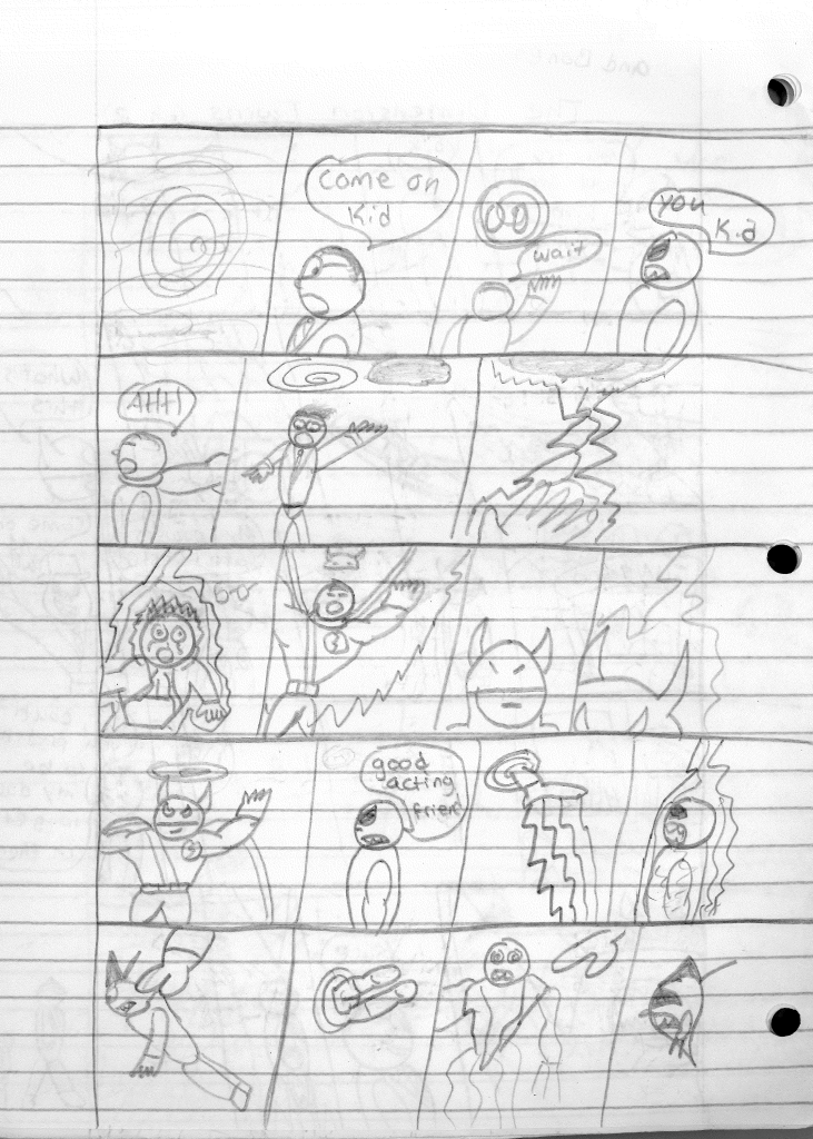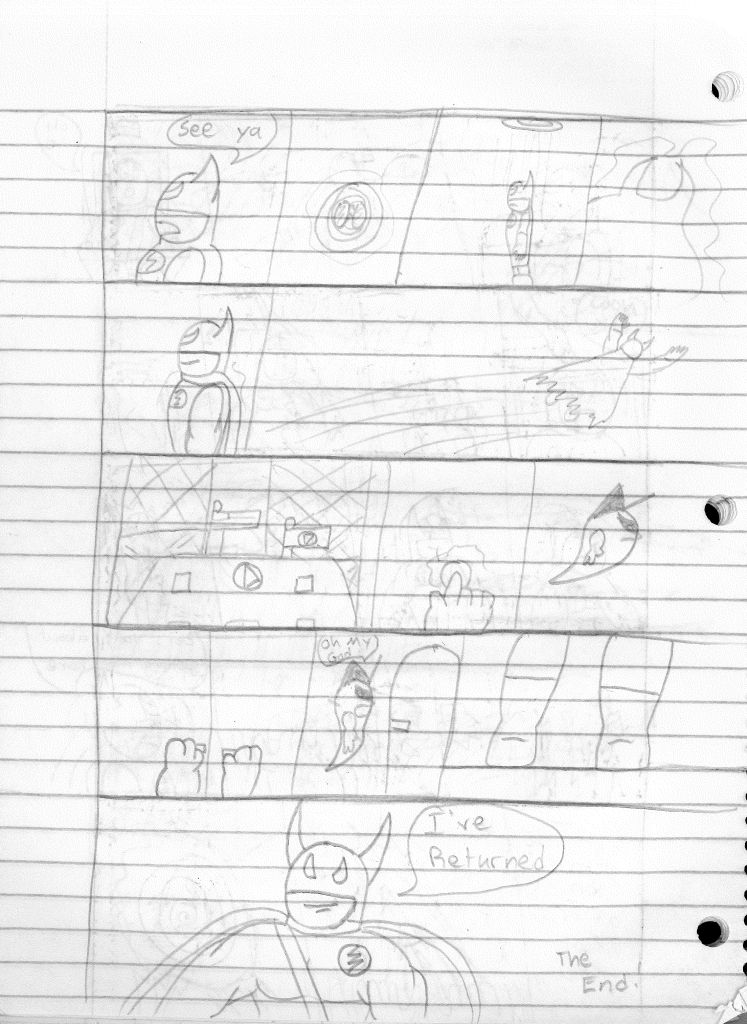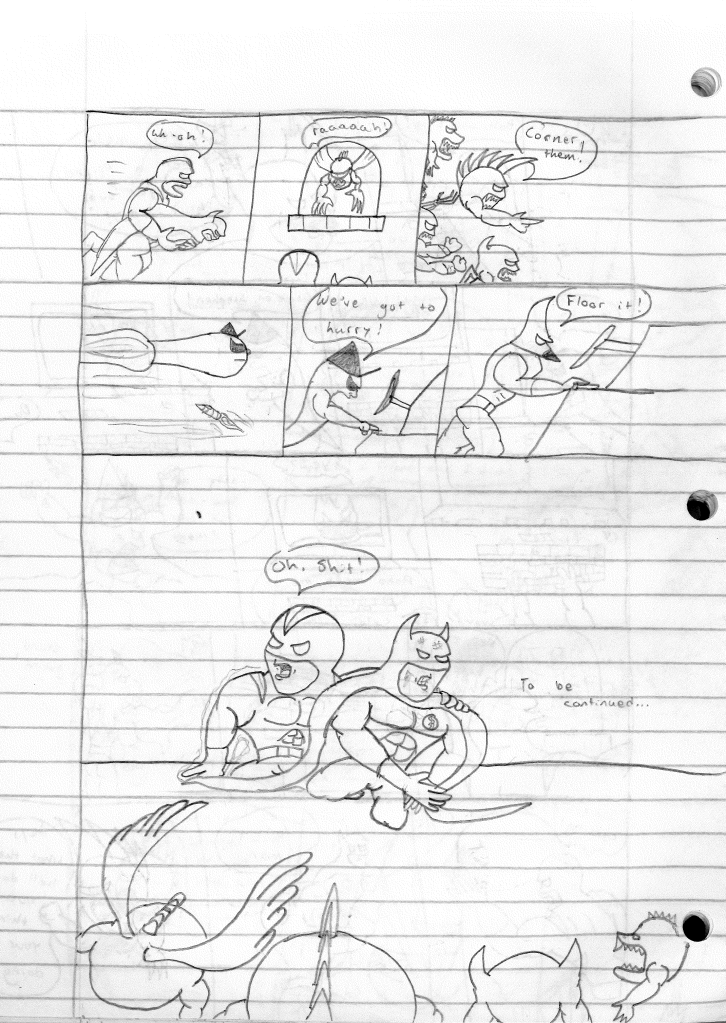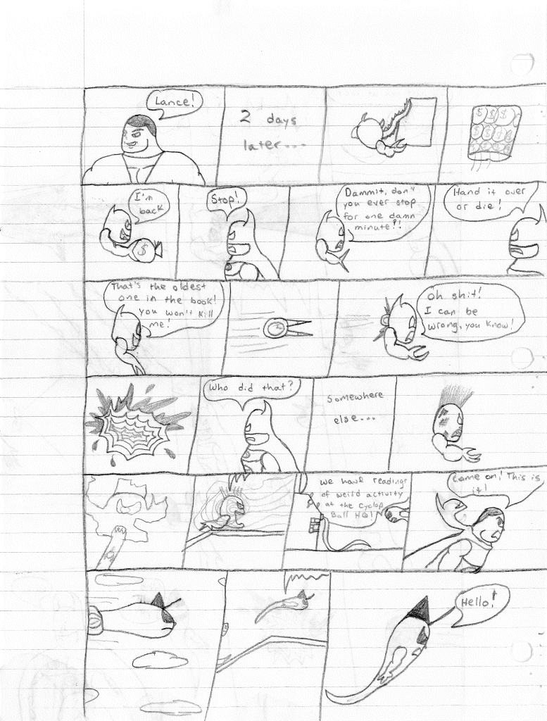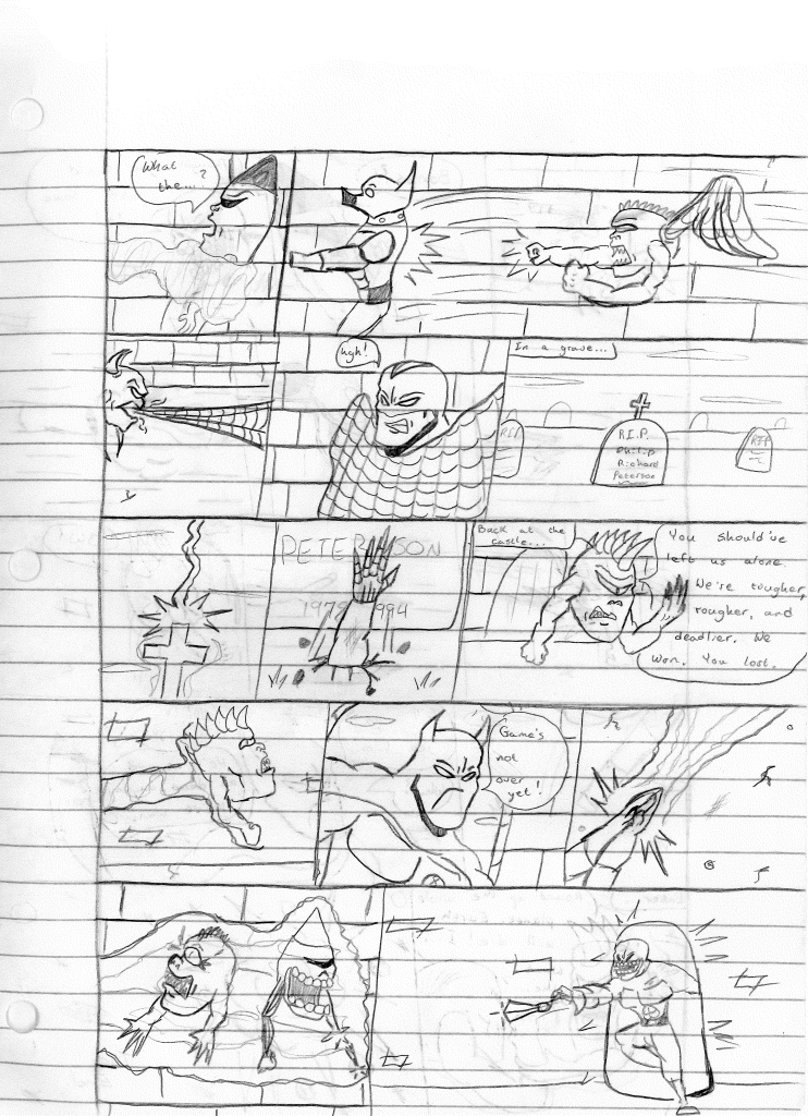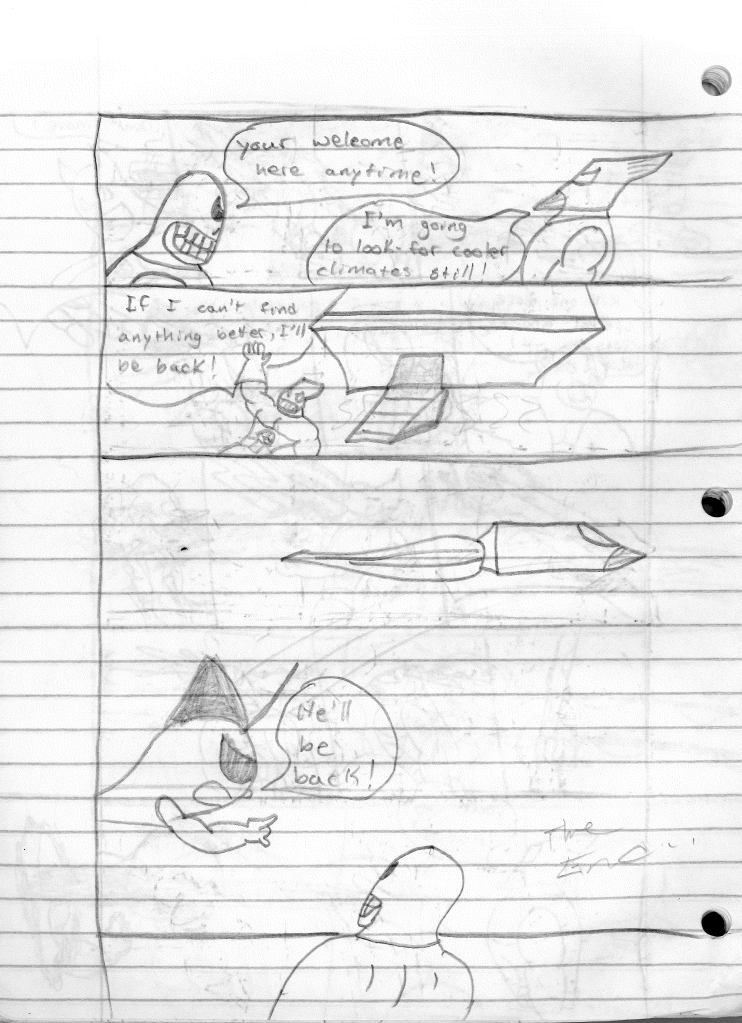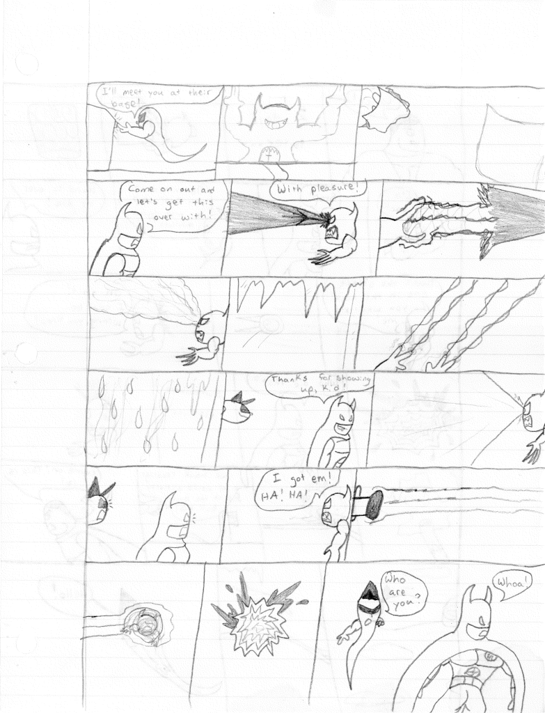 I’m surprised that I incorrectly misnumbered these issues. I think that proves even more to me that I stepped away for an extended break during the writing of the previous comic. Furthermore, I would even say that I took a break during the writing of this comic as well, as the art style shifts again on the second page, becoming more refined. Plus, it looks like I sharpened my pencil for the rest of the comic, so that was nice.