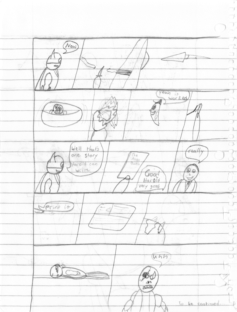 Thinking everything is taken care of, Lightning Bolt comments that this is a story for Harold to write. I guess Harold decided to be a reporter at some point. He writes the story and gets praise from his editor. But unfortunately, the alien threat still lives.