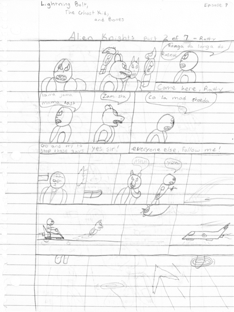 Meanwhile, the Alien Knights come across a lab. I thought they were supposed to be going to a base. Anyway, back to the fight it seems the Leader got the advantage at some point and has our heroes pinned down behind a well-placed boulder. Bolt tries the trusty Lightning Rope, but to no avail. The Leader captures the trio and calls for extraction. They are all beamed aboard. Claws whispers something interesting to the Leader. The Ghost Kid, being a ghost and all, phases out of his shackles and works on freeing his partners. The Alien Knights detach themselves from the back portion of the ship to escape, leaving our trio to die in a crash. Just like the Knights were supposed to do several times before. But Bolt, Kid, and Bones escape before meeting a fiery end.
