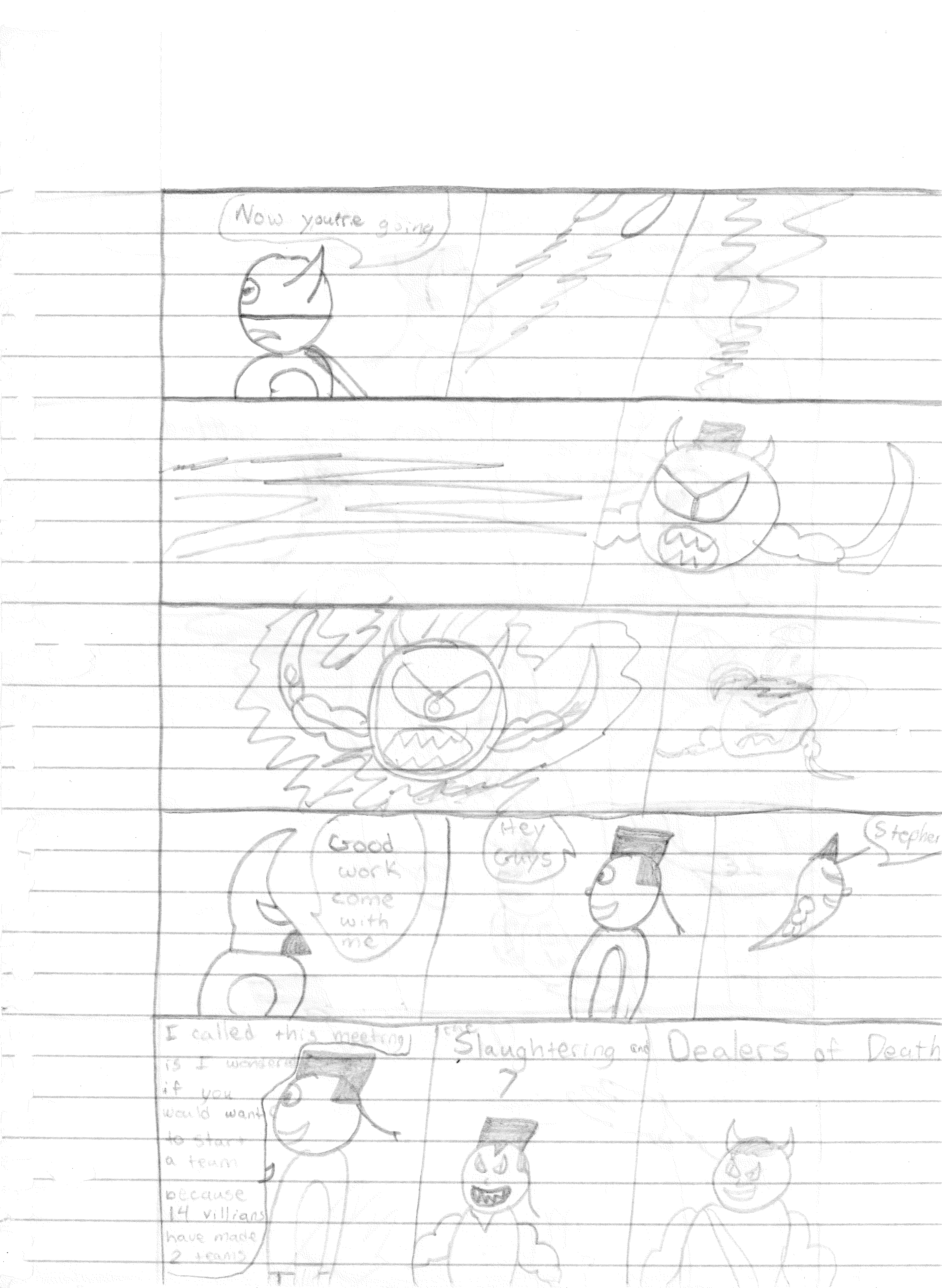 Lightning Bolt, the Ghost Kid, and Robo-Rabbit meet up with Stephen and Lance. Stephen (using more poor grammar) suggests forming a team, mainly because fourteen other villains have done the same thing. Everyone is seemingly onboard. But the big question is what they would call themselves. Both of the villain teams have names: The Slaughtering Seven and the Dealers of Death. Two very evil sounding names. Luckily, Stephen has the very heroic sounding name “The Destructors” ready to go, and Ghost Kid agrees it’s great. At that moment, The Destructors were born.