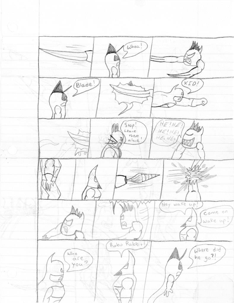 Once Robo-Rabbit locates Blade, the trio exit their flying contraptions to then fly after their adversary… Anyway, Robo-Rabbit attacks with a needle. Blade breathes fire at the Ghost Kid, turning the ghostly apparition black… as if he burned the ghost… He then shoots a claw from his left arm, leading me to believe he could easily regrow his right claw. Robo-Rabbit grabs the claw. At this point, Lightning Bolt has had enough and declares, “Now you’re going.” I feel like there should have been more to that. Anyway, I guess all three heroes unload their energy beams onto Blade, frying his brain (?). Once Blade is dead, Robo-Rabbit commands Bolt and Kid to come with him.