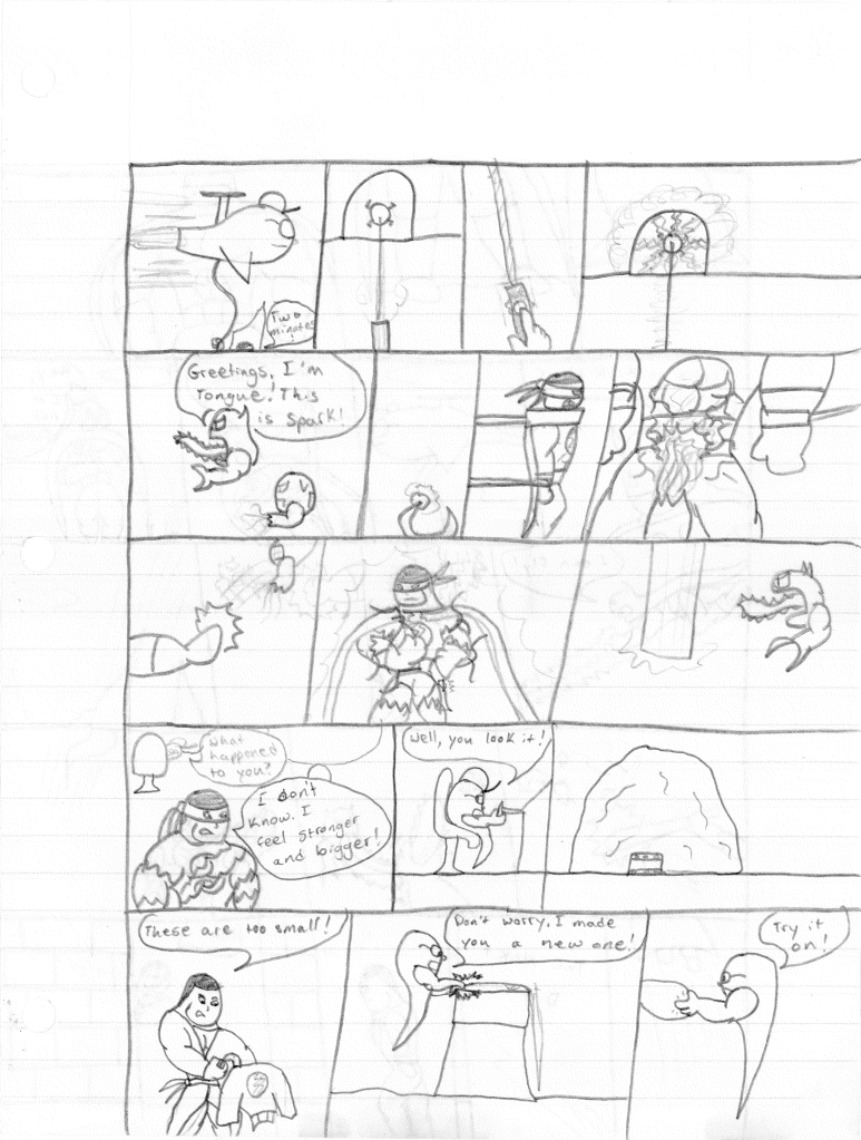 I also want to note the change in art style. While I can’t say for 100% certainty, I would almost bet that I stopped writing this story during my transition to a new style, and then came back to it to finish. Why I stopped is unclear, but I would say that I came down with a case of writer’s block.