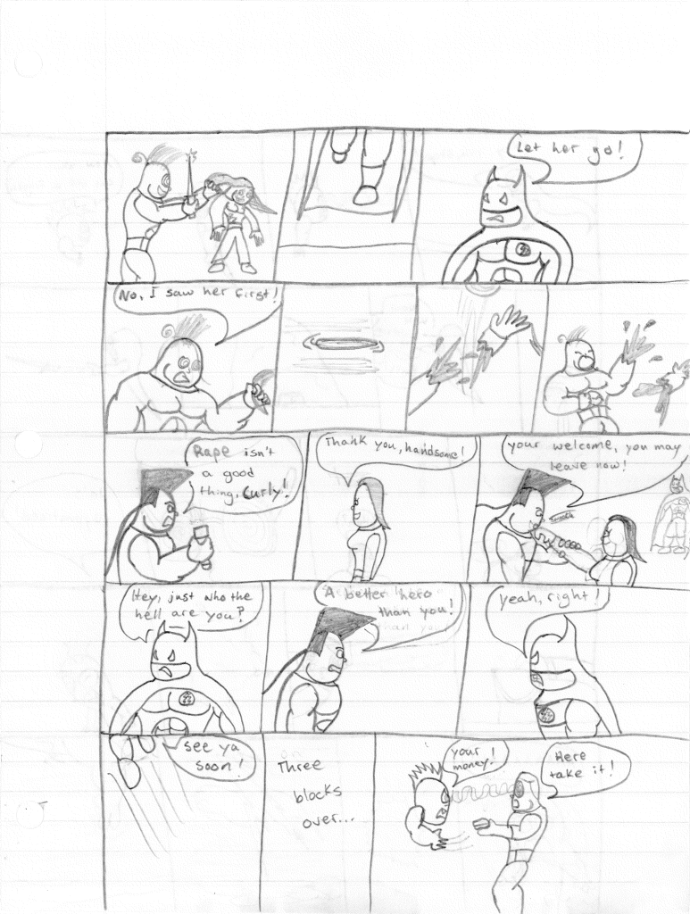 I’m surprised how quickly I went back to the Weatherman to be the story’s foil. I would imagine it was because I had the “clever” idea to make him control the weather naturally, as opposed to it being a machine. Why I felt this to be necessary for the character is unclear to me. I also do not understand why I chose to have a random selection of heroes and villains just cameo for no other reason than to beat the shit out of the Weatherman. I also feel like the comical exchange at the end was rooted in a real conversation. Just another bizarre entry.