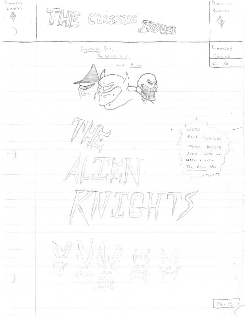 It seems as though I had plans to give the next series arc, The Alien Knights, the “Classic Issues” treatment, as evidenced by some cover art I found. You can tell that my art style had evolved yet again, so I wonder if the extra detail was starting to be too much work. I really wish I had finished this one, just out of curiosity.