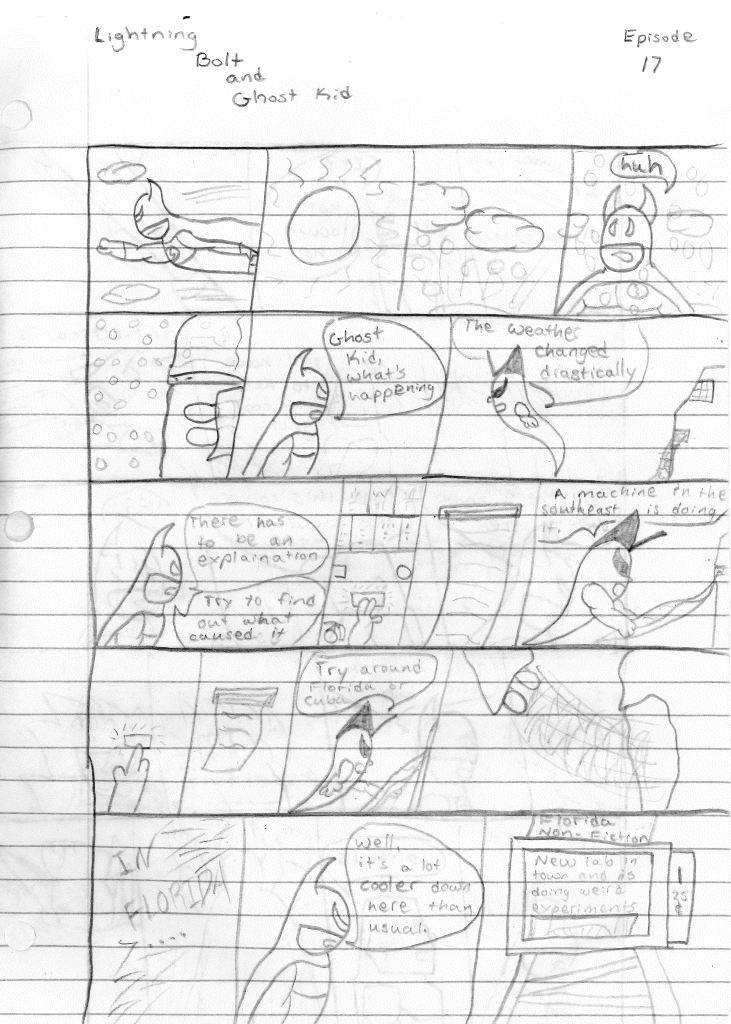 Lightning Bolt is flying around the city when it suddenly starts snowing in the middle of summer. He flies back to the “Lightning Cave” and asks the Ghost Kid what is going on. Kid states the obvious by saying the weather changed drastically, so Harold clarifies if he had been able to track down the source of this phenomenon. Using his fancy computer, he tracks a signal somewhere in the southeast section of the country. More specifically, somewhere between Florida and Cuba. What a way to narrow it down. Lightning Bolt flies to Florida and notices a dramatic shift in the climate. Meanwhile in Antarctica, a man made of ice is attempting to manage the climate using his ice powers as the polar ice caps melt. Lightning Bolt arrives in Antarctica and observes the ice melting. He then shouts to the unnamed ice man to accompany him. The ice man agrees upon learning it was in regards to the ice melting. Soon after, Lightning Bolt and Polar, the unnamed ice man, arrive at the secret lab where the weather experiments are taking place. They look around the place until they hear a noise coming from above them. Lightning Bolt flies up and smashed through the floor, finding the culprit.