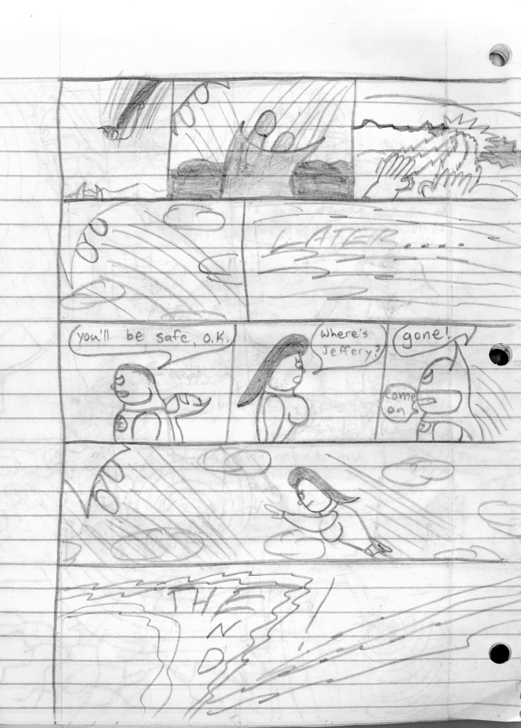 We should also address how Jeffrey and Lisa even have powers. Well, if you recall WAY back in issue #1, Harold was just struck by lightning and he had powers. At one point in time when I couldn’t come up with great origins, I just went with the most basic idea. Like Peter Parker being bit by a radioactive spider. Or Hal Jordan being given a powerful space ring. Here, a special lightning bolt gave Harold Cane powers, and he chose to use them as a superhero. So, a similar lightning bolt strikes near Jeffrey, imbuing him with similar powers. That was my rationale. I guess Lisa was just infected by the energy when Jeffrey rescued her.