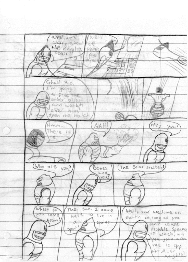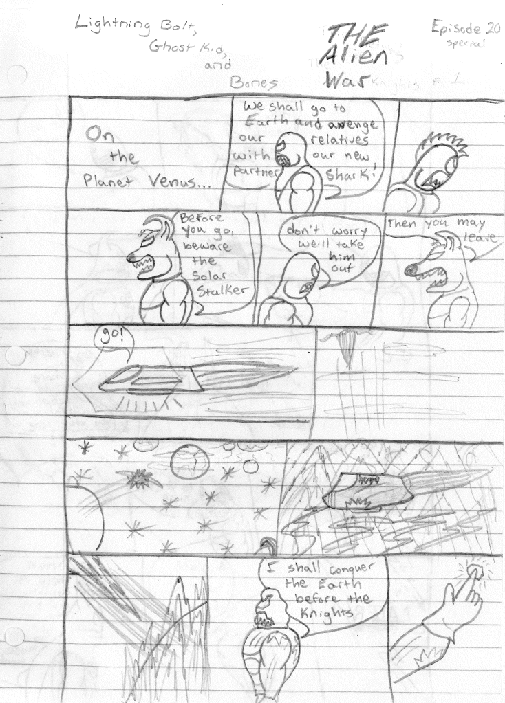 On the planet Venus, the descendants of the original Alien Knights are planning their revenge. They have added a new member to the team, and believe that will be the thing to turn the tide. The dog-faced leader warns them to beware the Solar Stalker, but the lead Knight isn’t concerned. They take off in their spaceship and head towards Earth. Meanwhile, on the sun, another being is attempting to race the Alien Knights to Earth to conquer first. Bones is alerted to alien activity, so he informs the Ghost Kid. Lightning Bolt goes to check it out. Ghost Kid gets reports of two separate sightings, leading Bolt to believe they brought backup. Bolt heads off to one of the reported sights where he finds the Solar Stalker observing his surroundings. Since he is not actively causing chaos, Bolt decides to move on. Bones, however, decides that he wants to keep an eye on that other alien. So, he hops on his all-new motorcycle and confronts the Solar Stalker. After a quick introduction, Bones learns that the Solar Stalker is looking for a new home, since the sun is so goddamn hot. So, Bones tells him its cool if he stays as long as he doesn’t cause trouble. Oh and if he could help with the Alien Knights, that would be awesome.