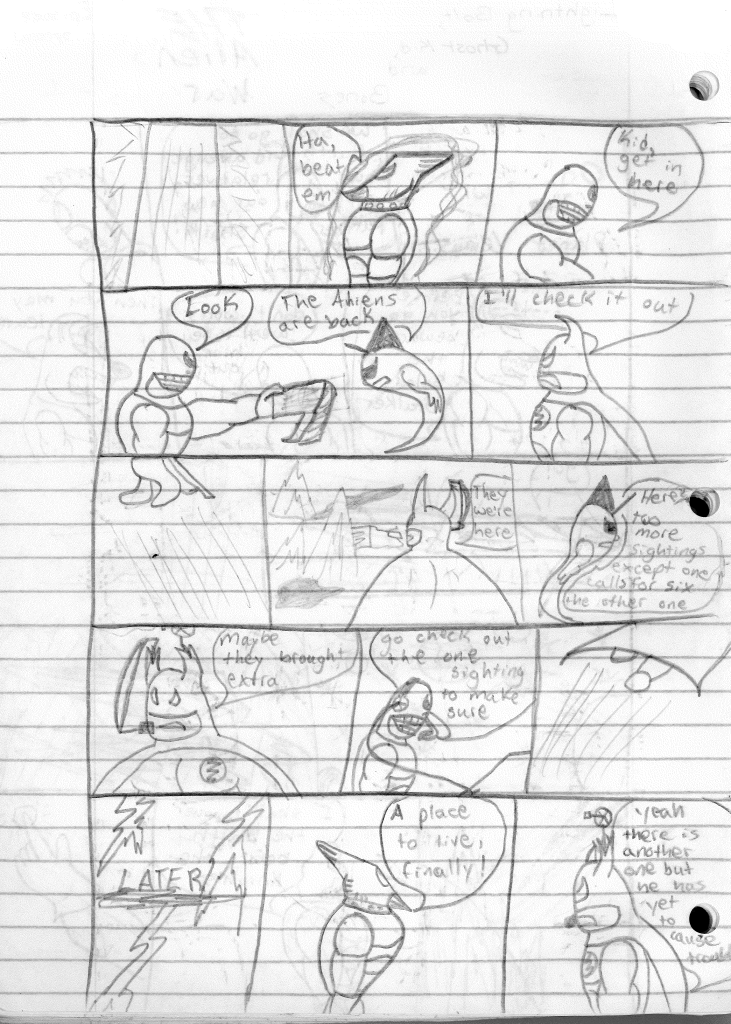 Unlike Robo-Rabbit: The Series, I maintained the title and numbering system for this comic… at first. I have no idea why I felt the need to change things. I do remember when “new” versions of a thing would come out, and how you could get caught up in the “new-ness” of it all. Perhaps that was my line of thinking. Anyway, the story kicks off in space where a spacecraft nears the Earth. Five aliens beam down to Earth with a mission… which we assume is wreaking havoc. You’ll also note that the aliens don’t speak English, but some made up alien language I created. It’s literally gibberish. Hopefully, I didn’t say something in another language by accident.
