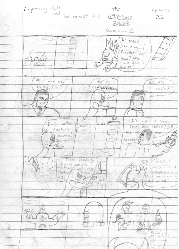 After introducing Bones and adding him to the Destructors team, it would feel as though he would only be featured prominently in The Destructors. However, when the time came to write the second series, I decided to add Bones into the mix and even rename the series Lightning Bolt, the Ghost Kid, and Bones. It’s a bit wordy. Now a trio, the heroes would next face a new threat from beyond the stars… even though the Cyclops Balls are aliens. A fact that I establish some years later.