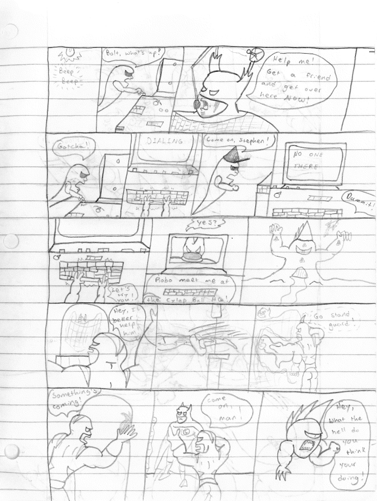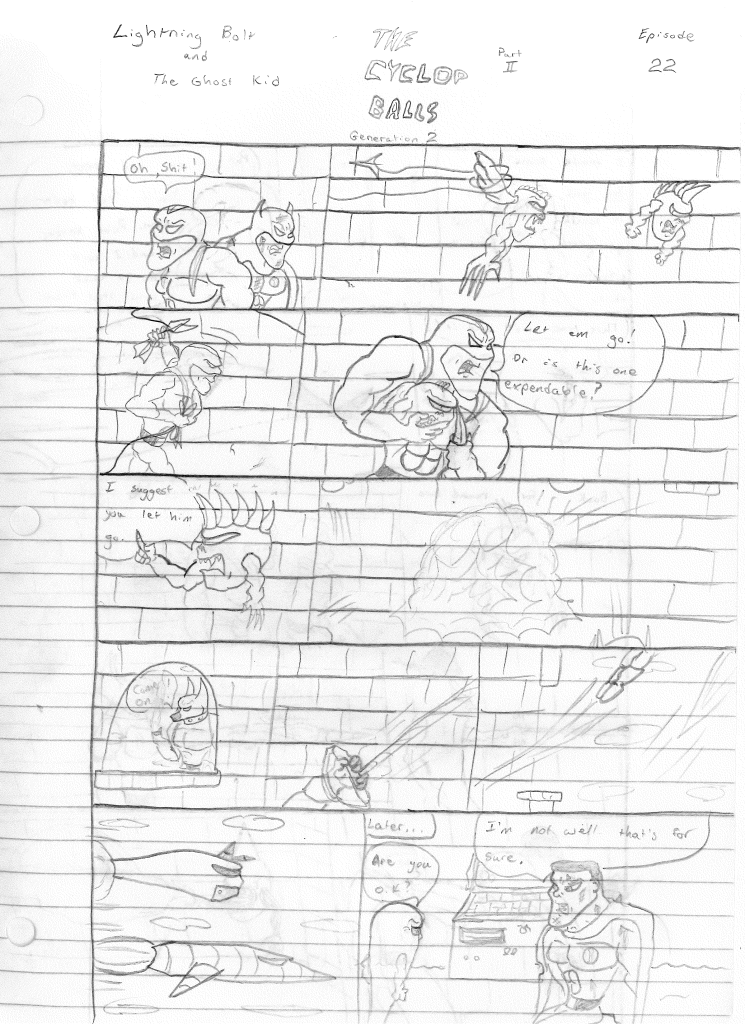 The Ghost Kid answers and Bolt tells him to grab a friend and head over immediately. Kid tries contacting Stephen first but gets no answer. He then turns to Robo-Rabbit who answer and seemingly agrees to help. Luckily, another random hero shows up at the Cyclops Balls headquarters and decides to help. The hero hops inside through a window and creates a clone of himself to stand guard while he attempts to free Lightning Bolt. Unfortunately, the lead Cyclops Ball catches them in the act. The hero grabs Lightning Bolt and heads toward the window. The window is blocked by the winged Cyclops Ball, effectively cornering them. The Ghost Kid and Robo-Rabbit push their ships to the limit as Lightning Bolt and the unnamed hero are surrounded. TO BE CONTINUED…