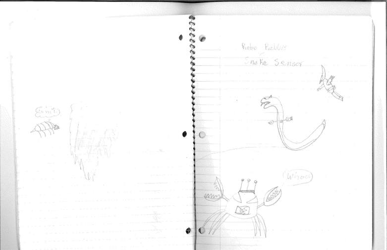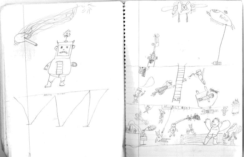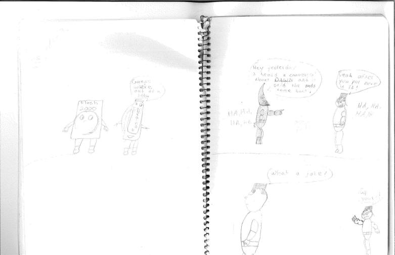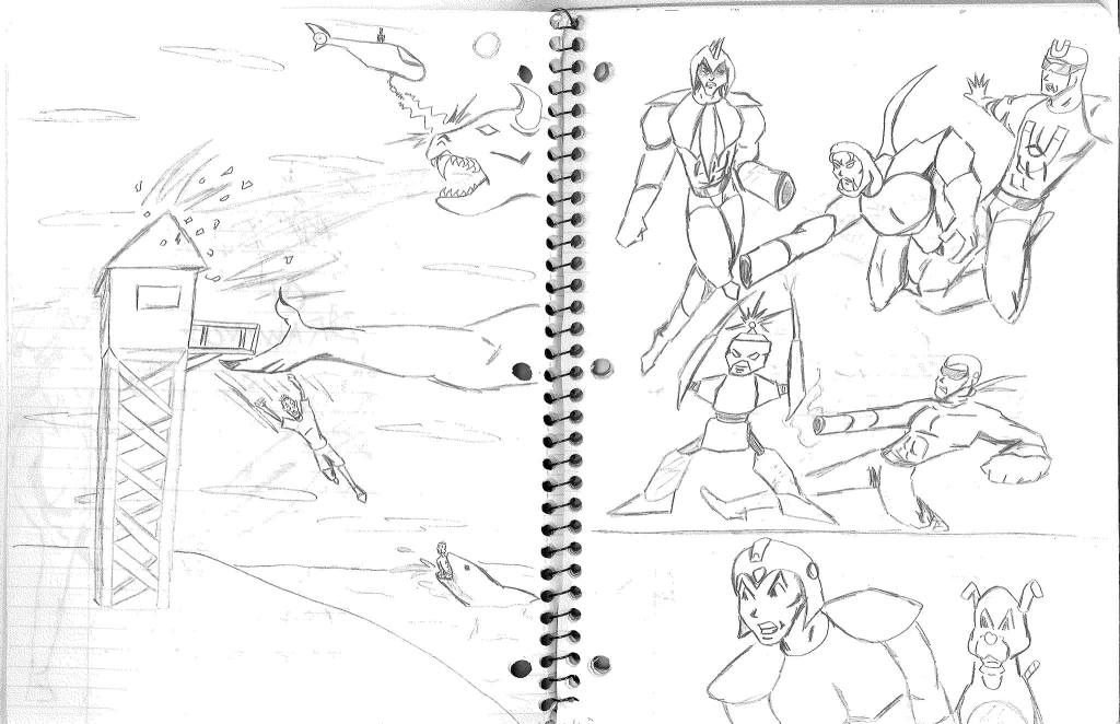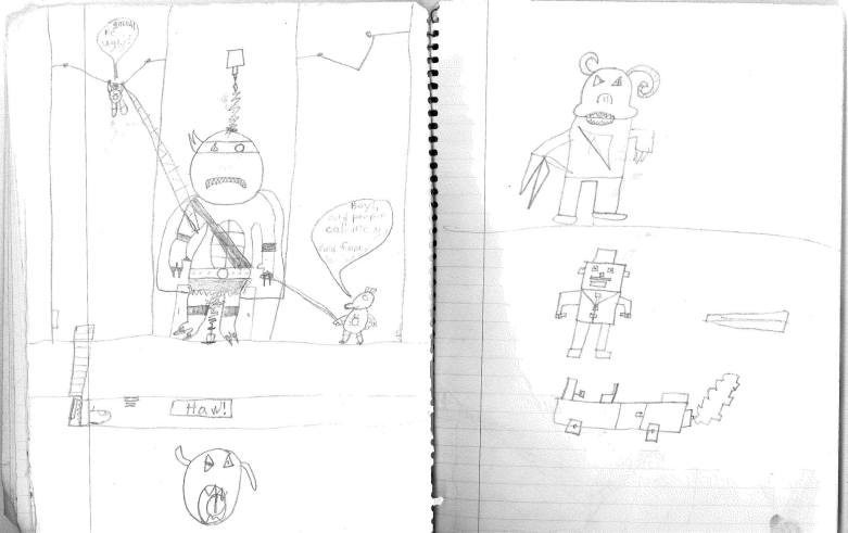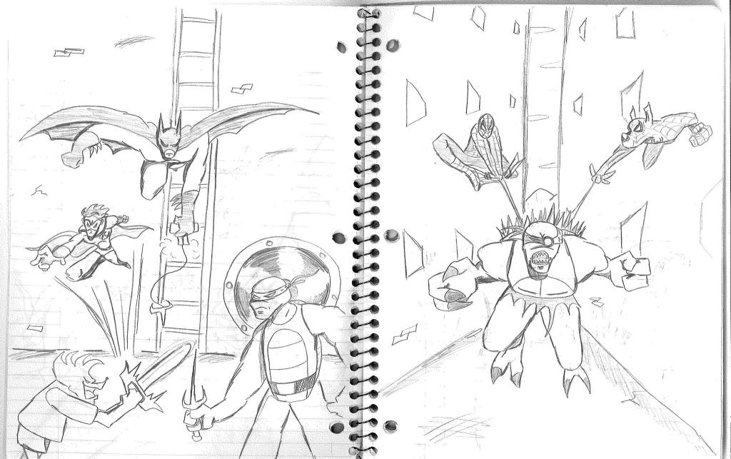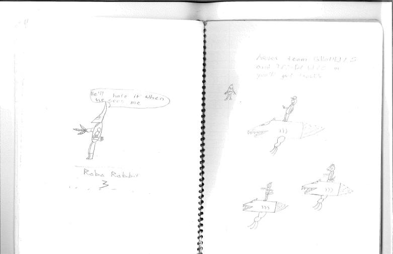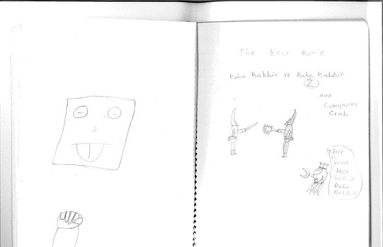 I revamped the idea of the Battles of Fort Destruction that was actually a much darker more personal story about a man overcoming a failure. I never did write the story out but I loved the concept. On the right Computer Crab is orchestrating the fight between Robo Rabbit and Sensor Snake!