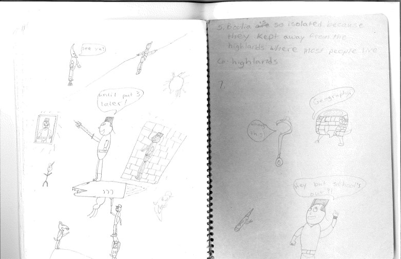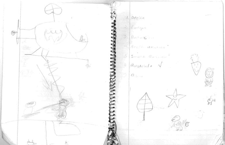 The threat from the last page has been dealt with by Batman and Robin. Then more Mario art and homework…note my spelling of “Austriala”…