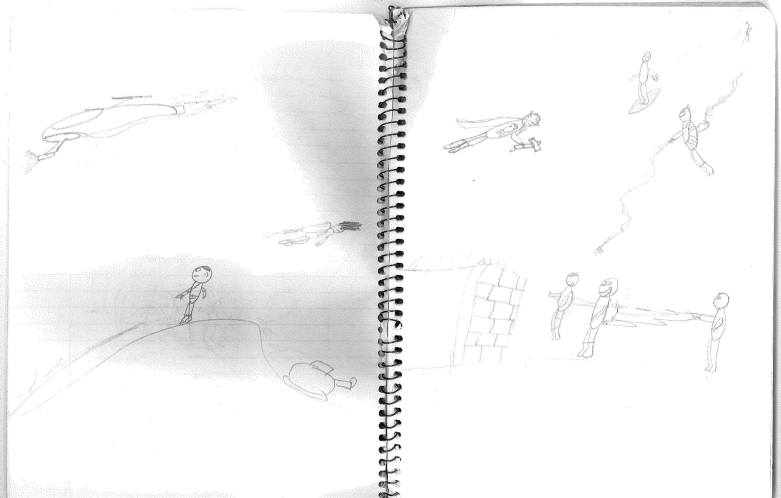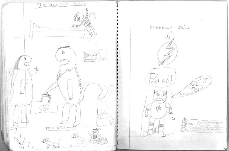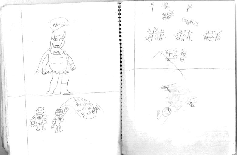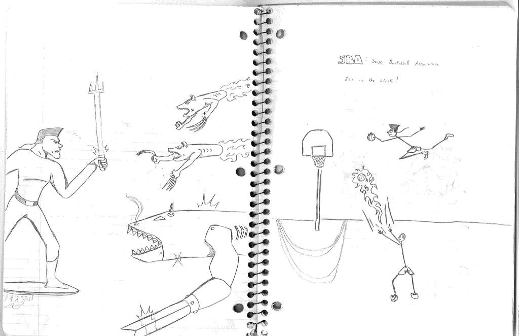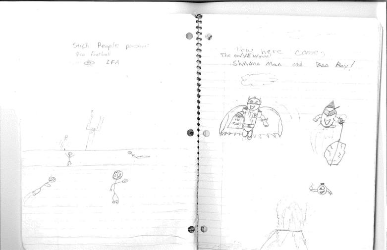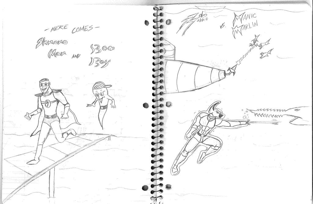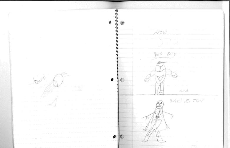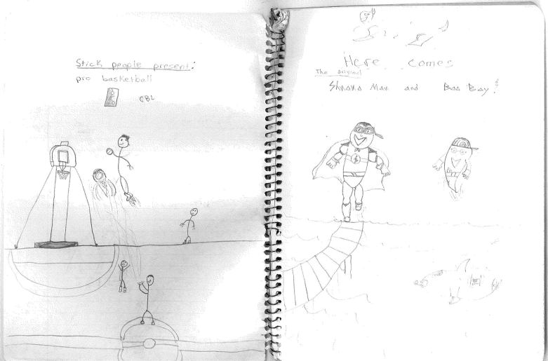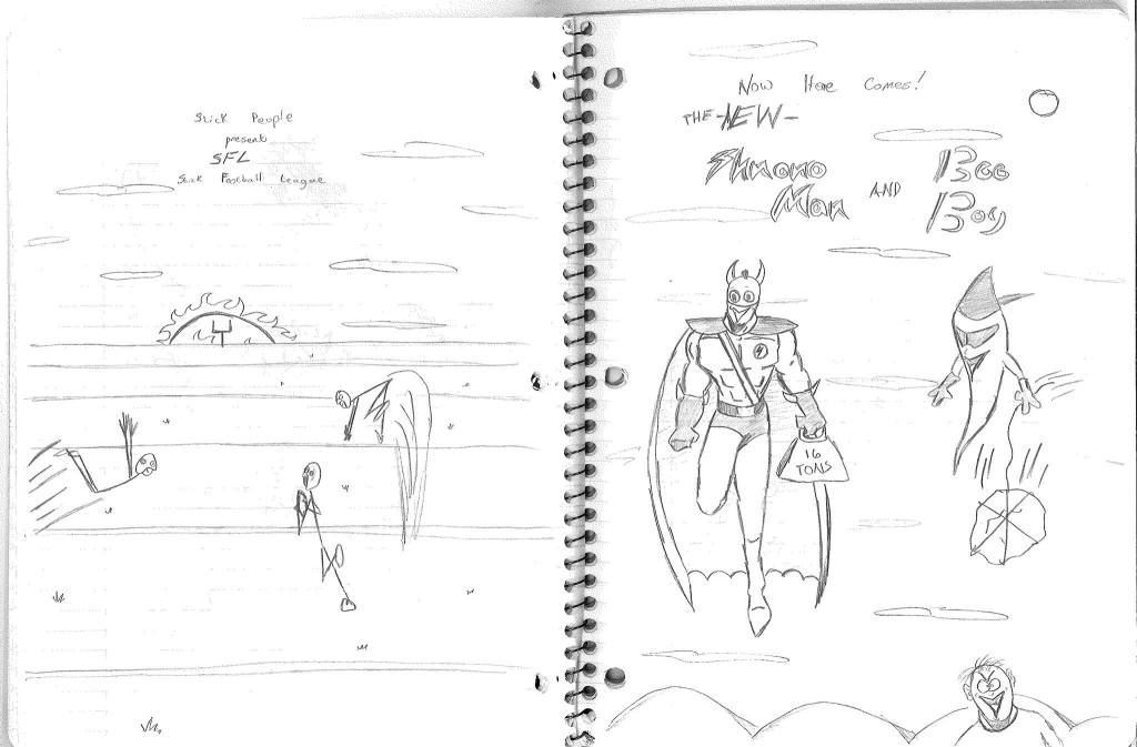 Stick people basketball…an pre-cursor to Jack Stickman perhaps? Shnono Man and Boo Boy…there’s a joke here that really only exists between two people. These were “superheroes” birthed from that joke.