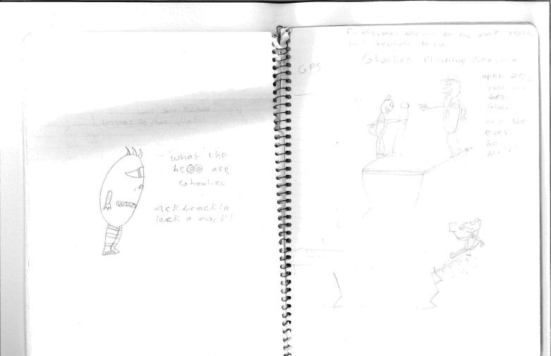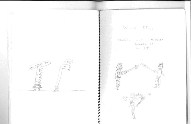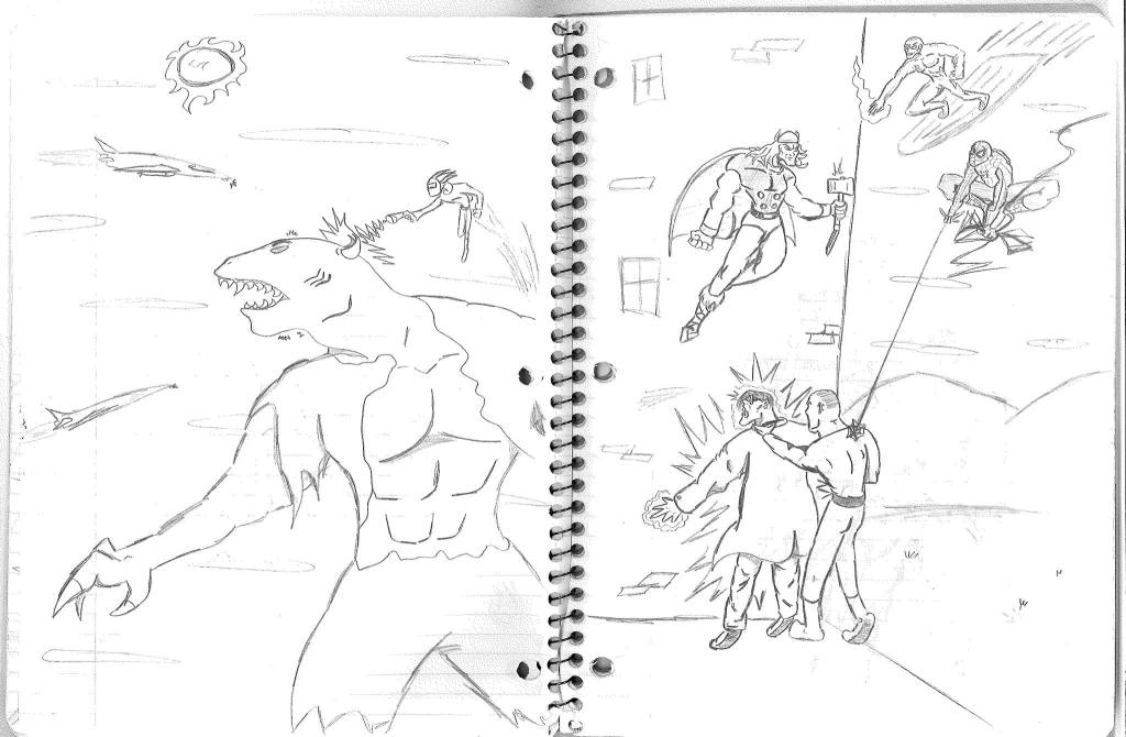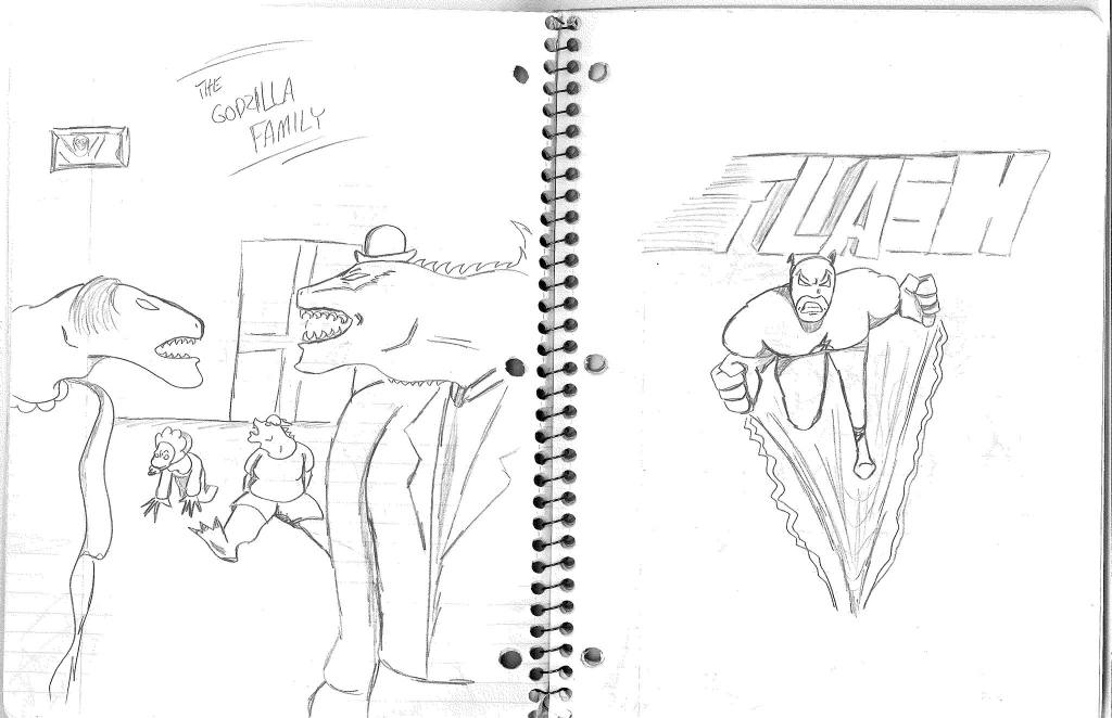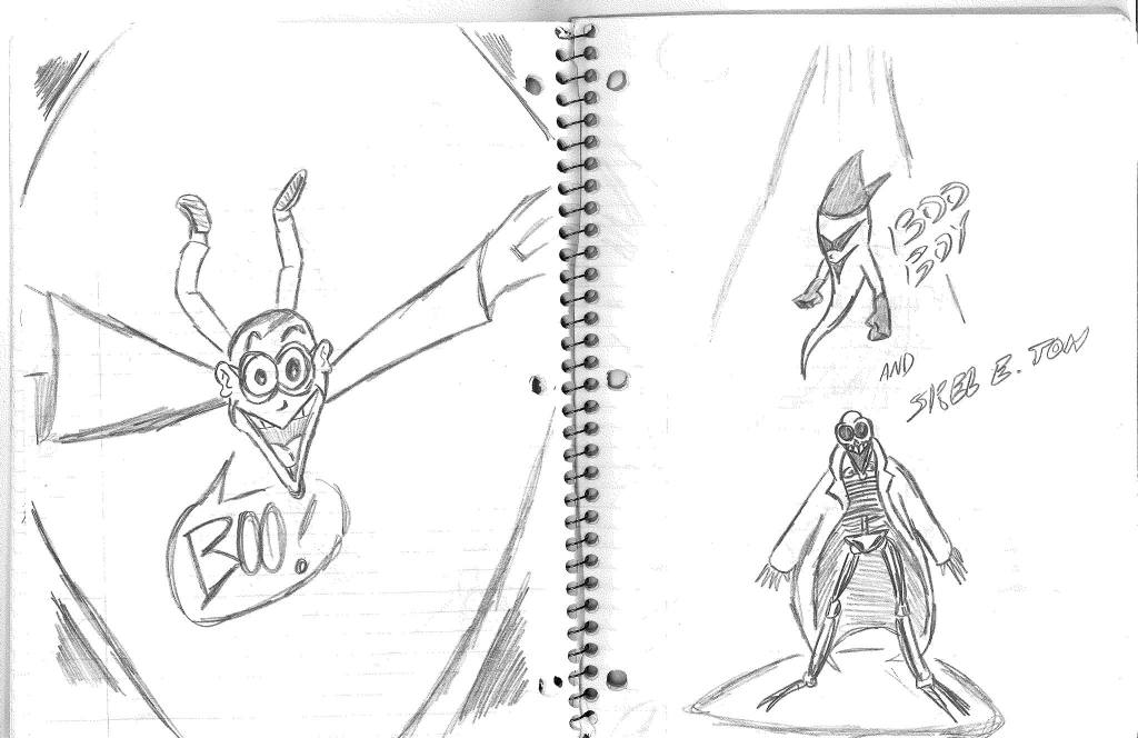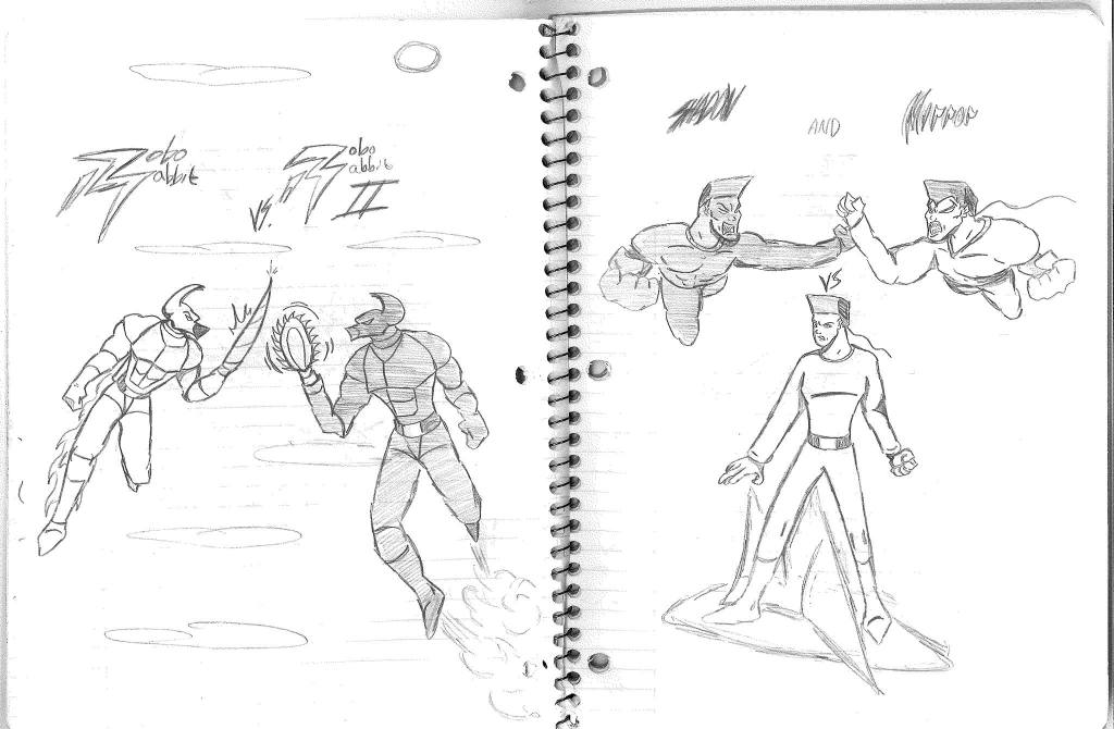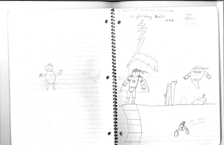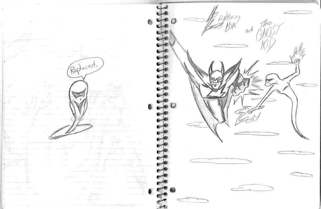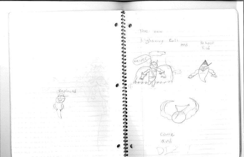 I think the guy on the left is supposed to be intimidated by the Death Dealer. On the right, we see the very first drawing Lightning Bolt and the Ghost Kid. At some point (not sure why), I decided to take the ridiculous premise of Shnono Man and Boo Boy and legitimize the idea. Here, two of my oldest characters were born, albeit in very different outfits.