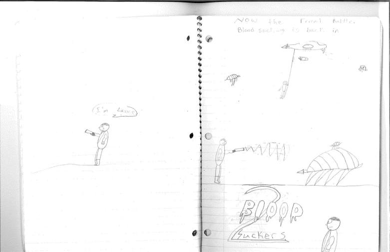 A cape wearing stick figure with bulging eyes thinks it’s cool. You should take his word for it. Blood Suckers was a horror story I had about mutated leeches wreaking havoc on a small town in Michigan. “Bigger by the Blood” was the tag line hinting that the more blood they consumed, the bigger they became. Also this mutation gave them legs, a tail for some reason, and a phallic sucker.