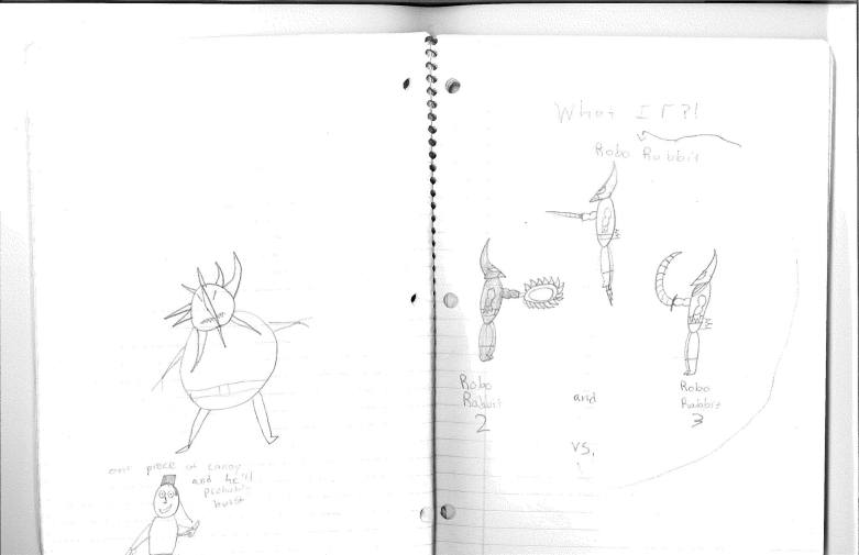 Not sure what the thing on the left is but I chose to make a fat joke with it. It shows how classy I was. On the right, I posed the question of “What If?” Robo Rabbit had to fight both Robo Rabbit 2 AND Robo Rabbit 3!…SPOILER! He did.