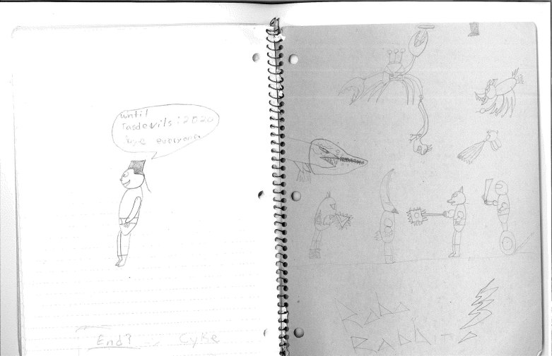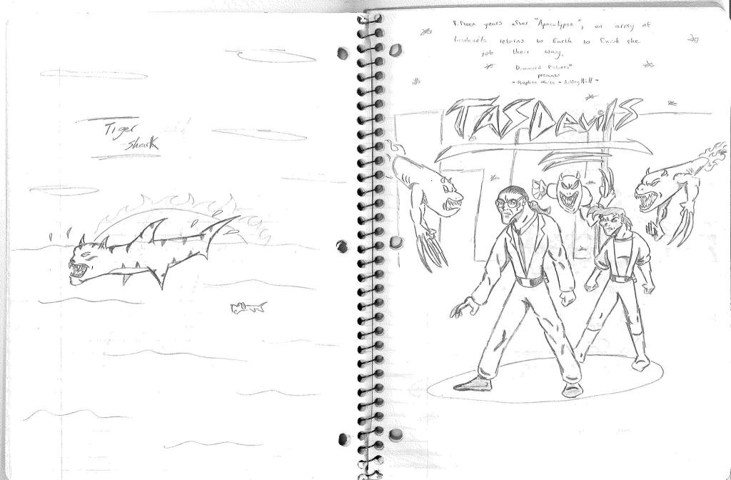 The Invisible Man wasn’t impressed with the tiger. Now…in what I touted as my “greatest comic yet”…Tasdevils may have been at the time, but it aged as well as cheese sitting on the equator at the end of July. I am very aware that the name “Tasdevils” is lame. I wasn’t that original back then. I mean they are basically sharks with arms, Wolverine claws, and flame coming out their ass.