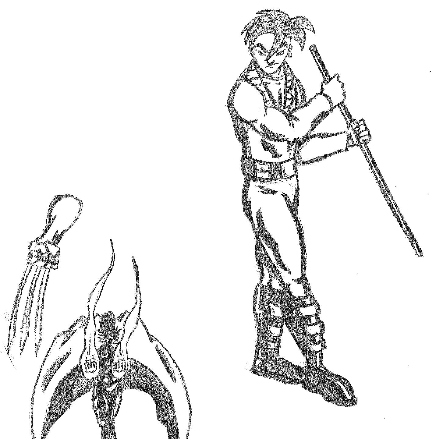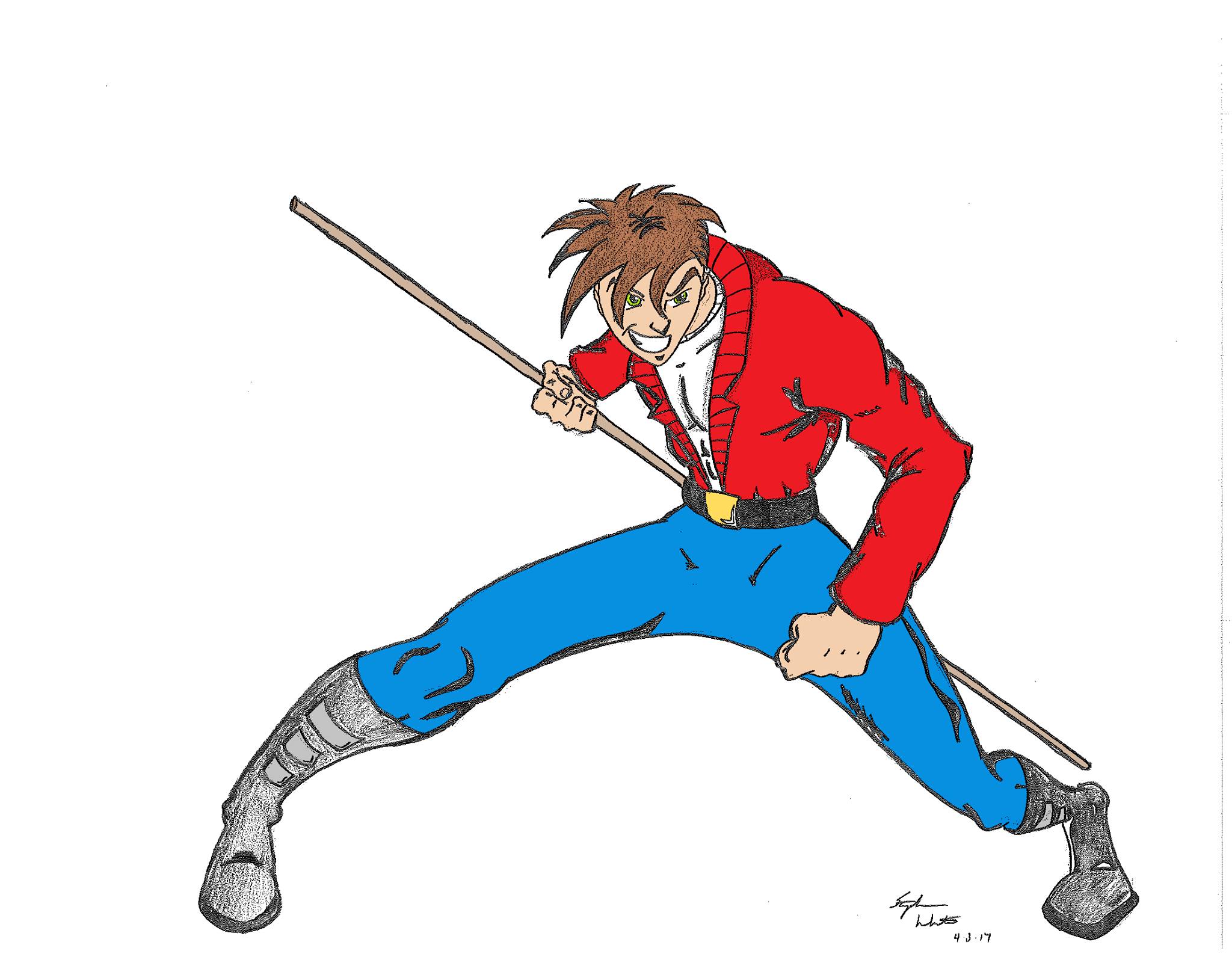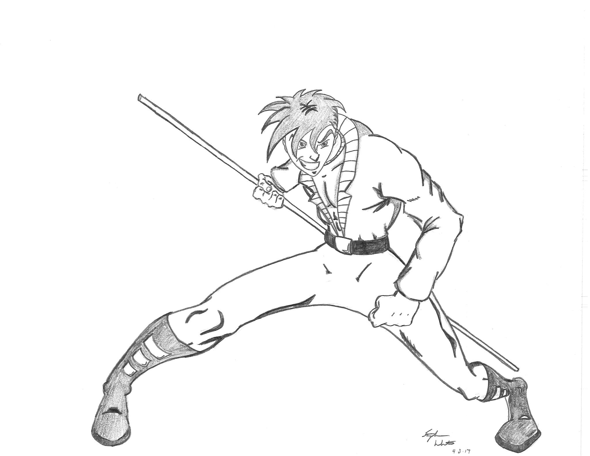 Looking through all of those sketches and doodles, you can probably deduce who’s who. But I also see characters that are a far cry from who they were originally, so I’ll break down my reasonings. First things first, you’ll notice “S” has a similar, but more anime-inspired hair. He’s also sporting a bo staff, as opposed to his traditional (or non-traditional) sword. Furthermore, he is no longer “S” but now A.C. This is a nickname I chose that has two meanings for me. One is that it relates back to one of my favorite things as a kid, The California Raisins. The other is that the letters “A” and “C” were the initials of my son. I thought since I named the original character after myself, it felt appropriate to name the remake after my son. Granted, we never referred to him as such but the initials are there.