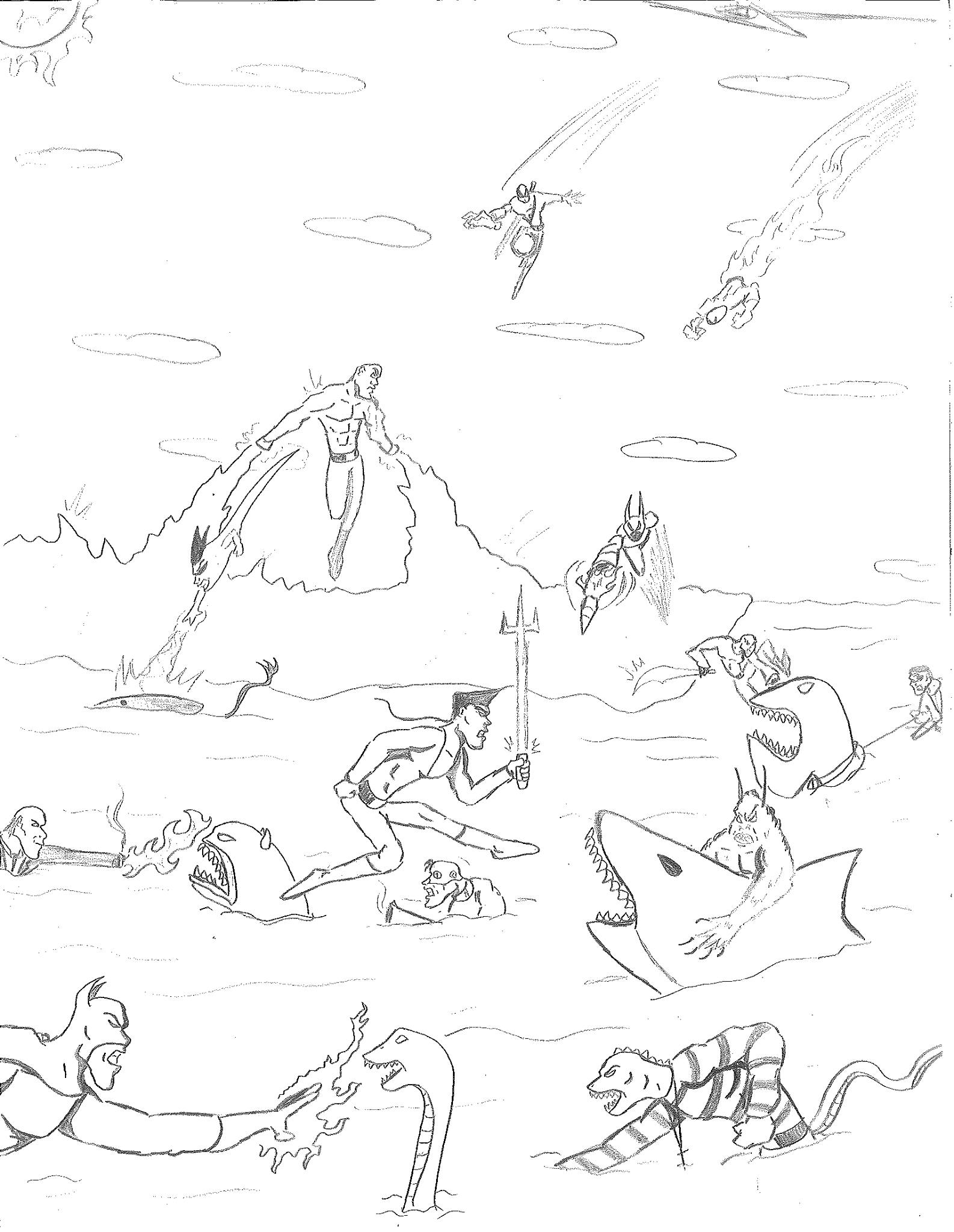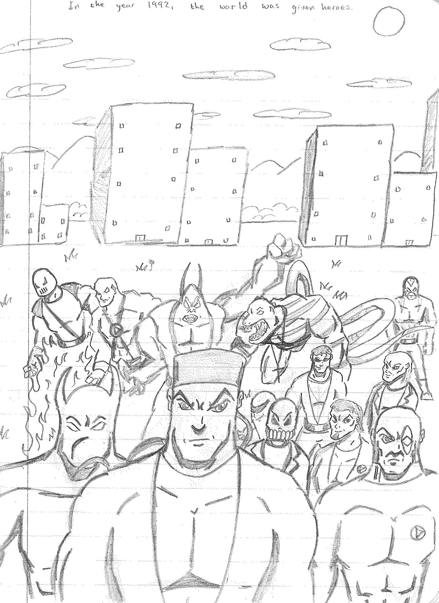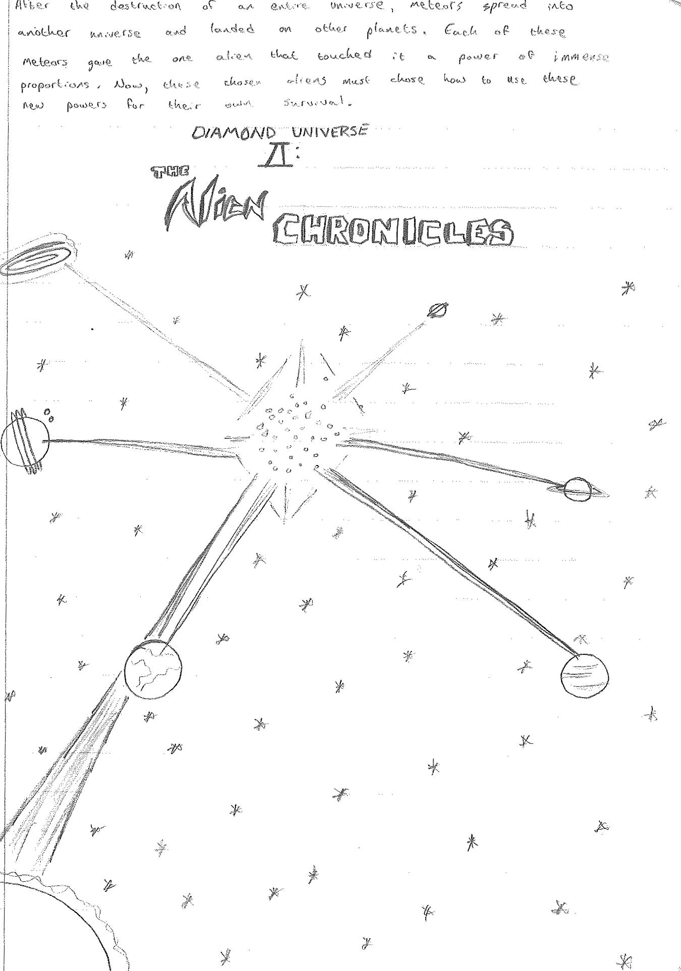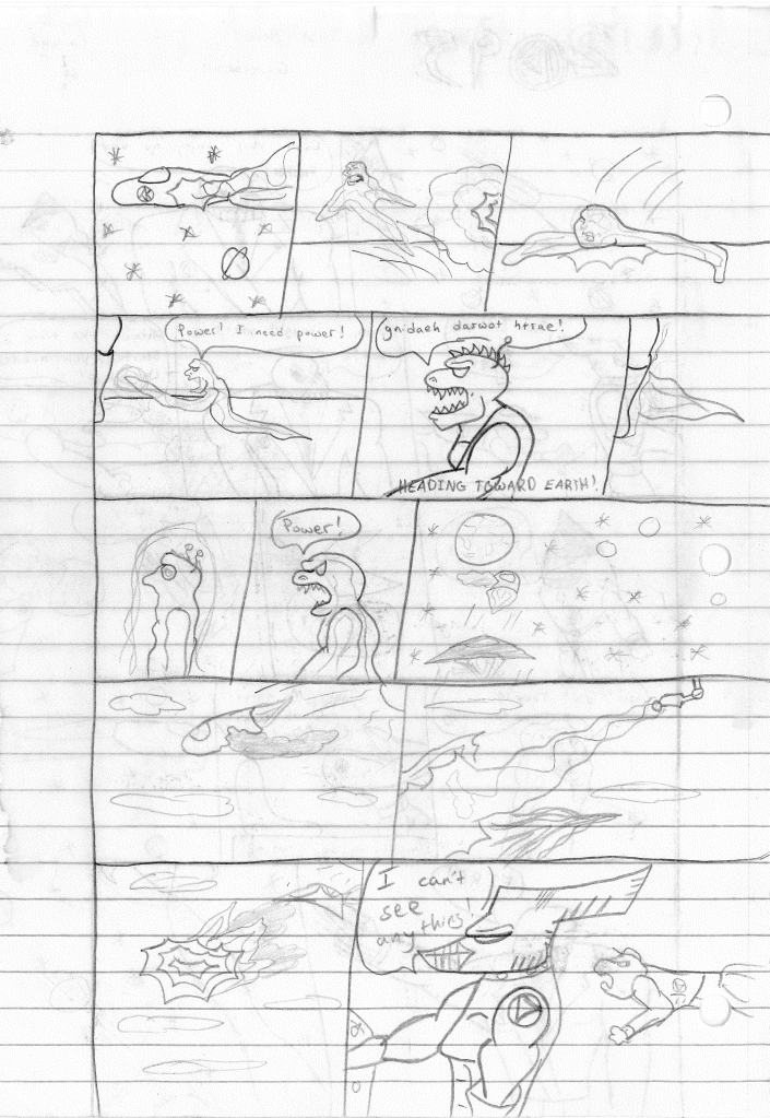 Since I drew a picture of the Earth (but actually a diamond if you look closer) exploding, I started thinking about debris. Since Superman could be affected by Kryptonite, a mineral from his home world, how would Earth debris affect other planets in the overall universe? I’m not sure how Earth debris would affect any planet outside of bombarding it with meteorites. In any case, using some pseudo-science conjured up by others, I began imagining the debris of Earth floating to other planets in other galaxies. Meteor showers would then affect a number of different planets, and on those planets, certain aliens would be imbued with superpowers that were parallel to the heroes of Earth. Almost as if the meteorites were carrying the essence of the dead heroes.
