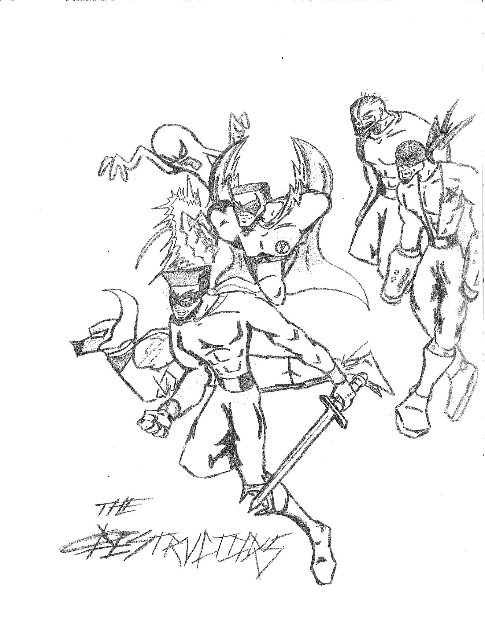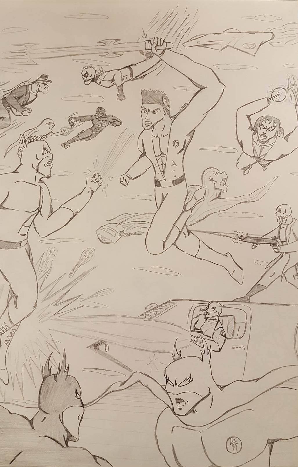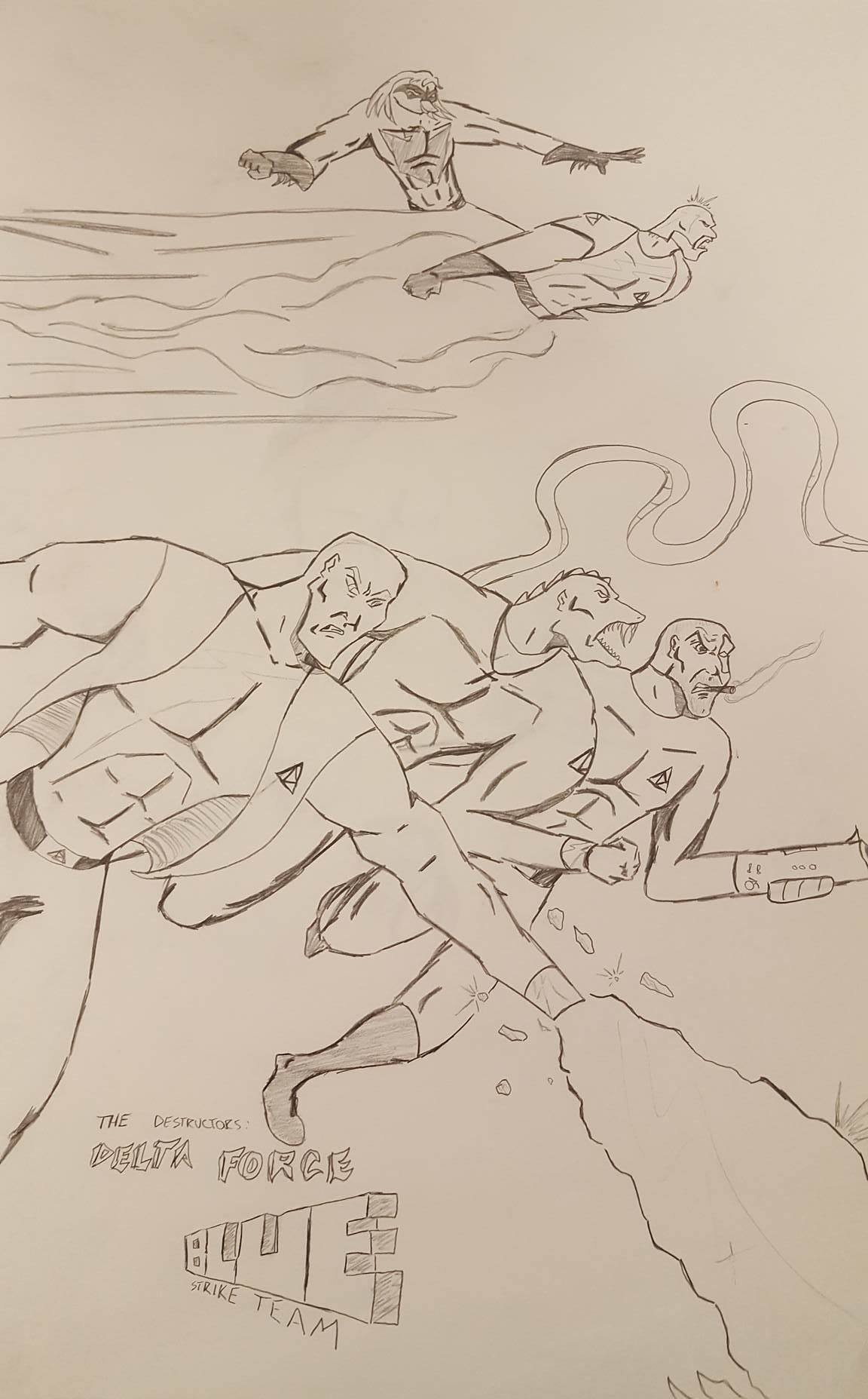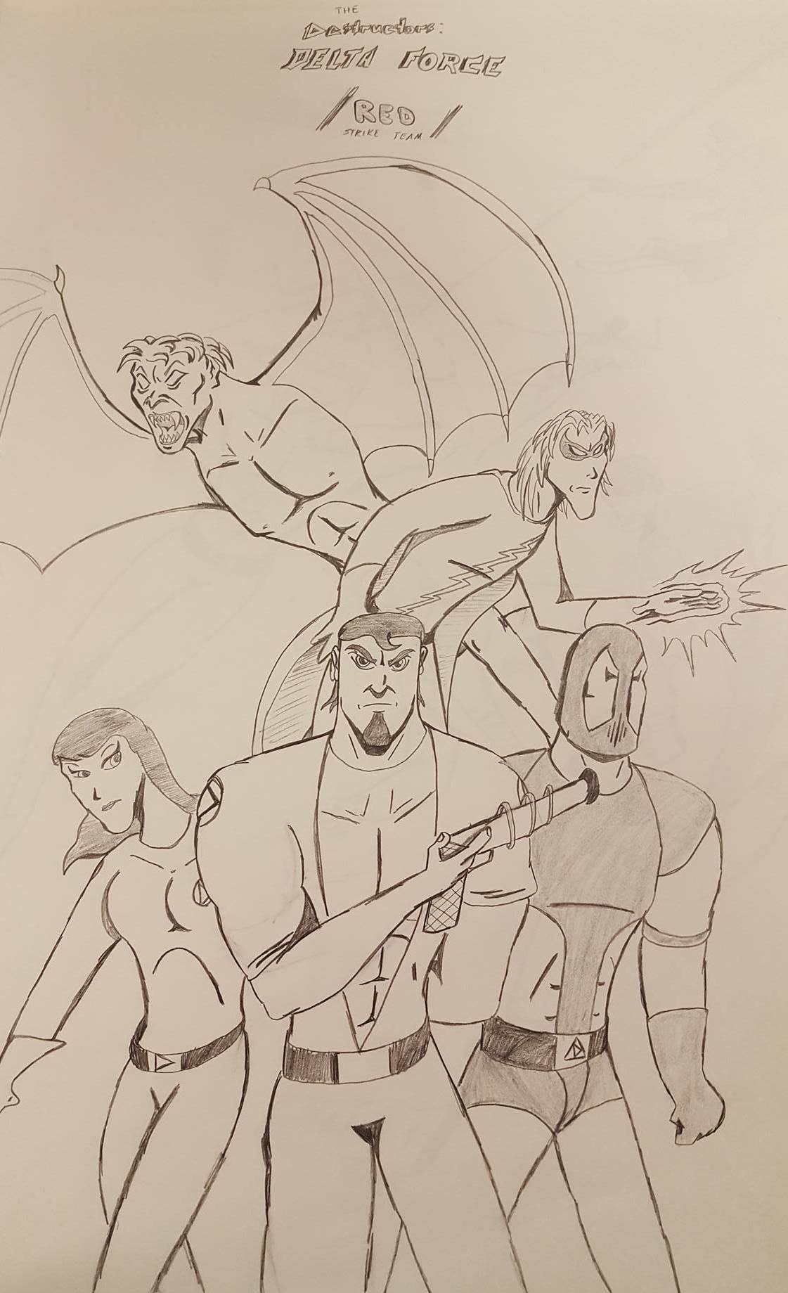 These first three drawings were my initial team rosters. Lance would lead the Red Strike Team along with his wife Holli, who would finally become an active Destructor. I had her in the comics for three seasons, and she was nothing more than window dressing. Such a waste. Additionally, Pitchfork aka Jamin Sponaugle, would officially become a Destructor, leaving behind the Eliminators. That leaves an open question regarding the fate of the other team members. The Xenogenesis would have also joined, bridging the gap between the Vigilantes and the Destructors. Lastly is Lightning Volt, aka Cedric Ryan, who was an alternate Lightning Bolt creation I came up with. I’m not quite sure why I did since he has no relation to Harold Cane. I’m sure there is a reason somewhere in my head. But he’s like a Miles Morales-type character in a sense.