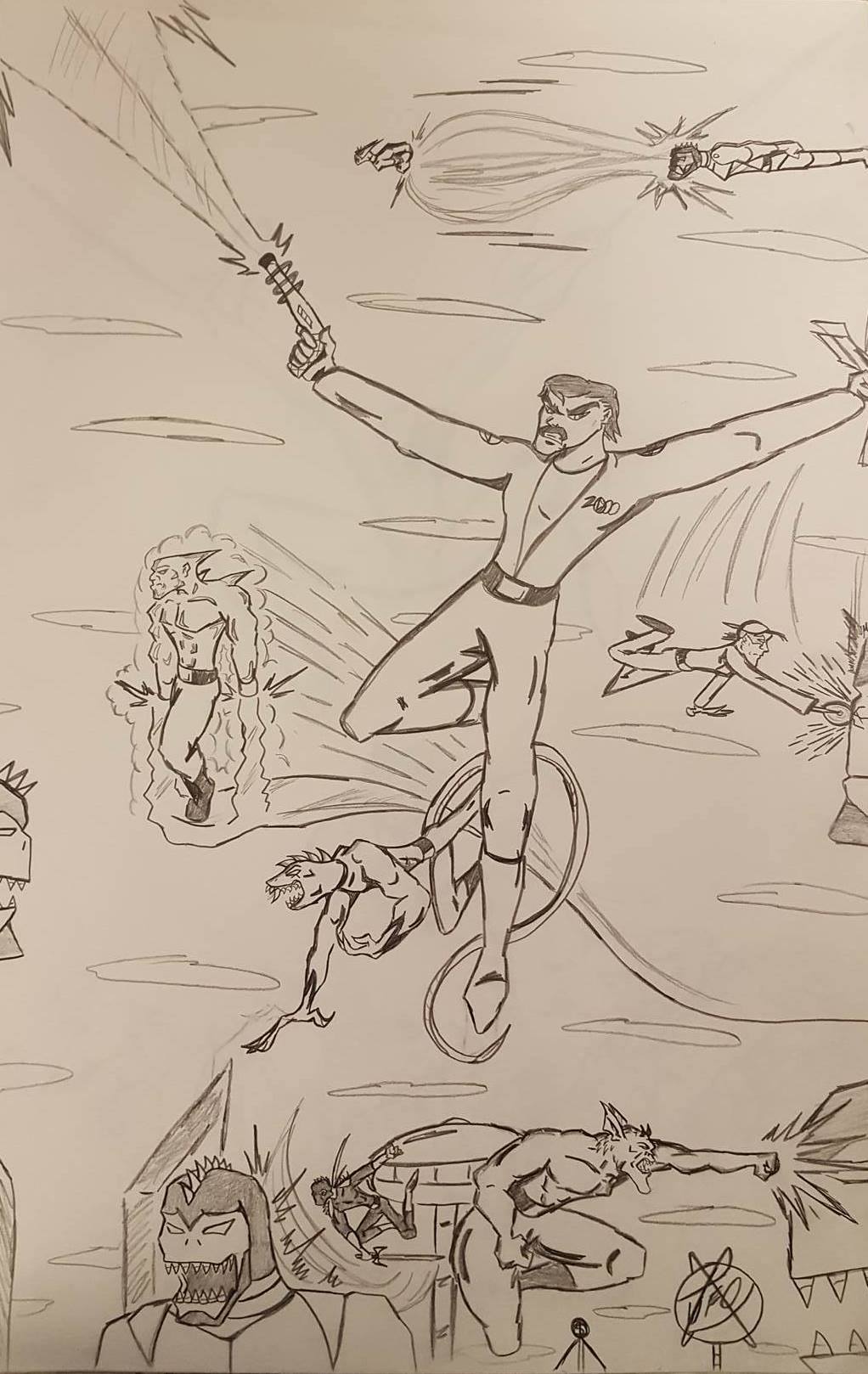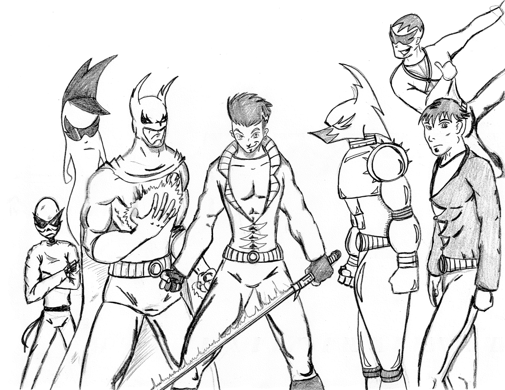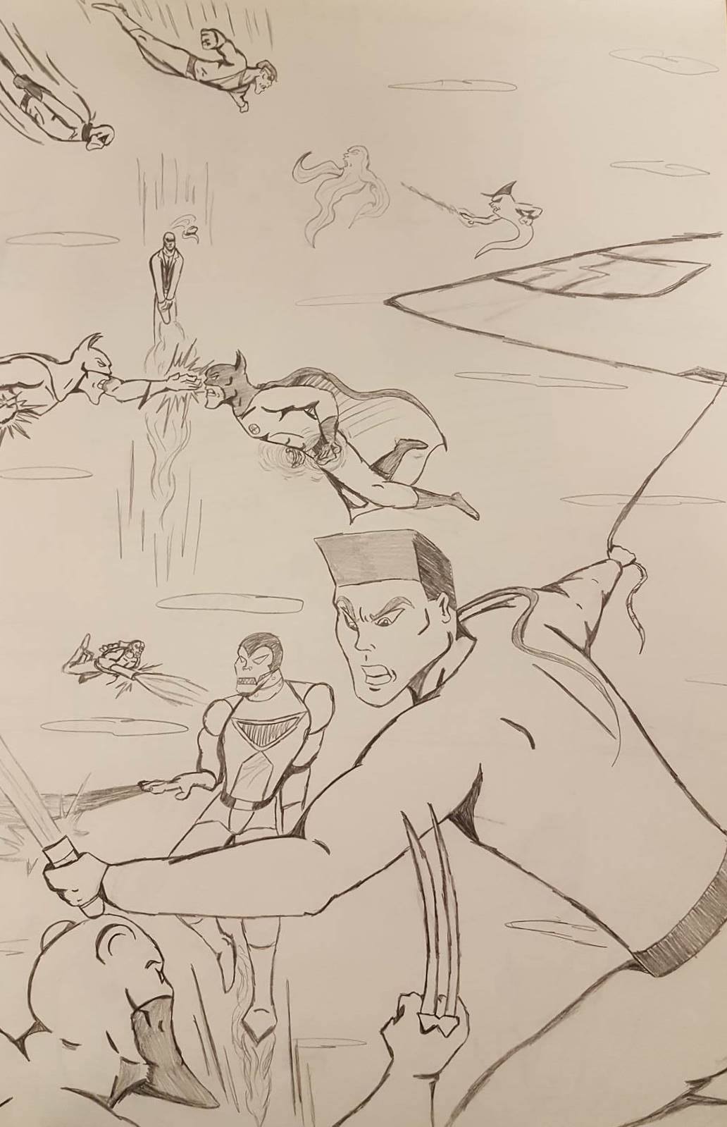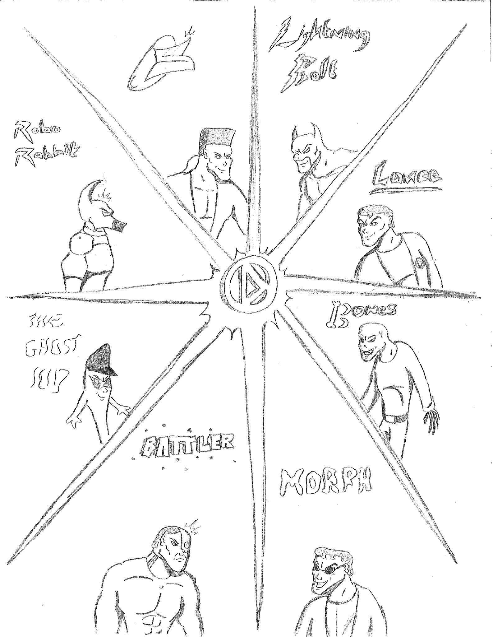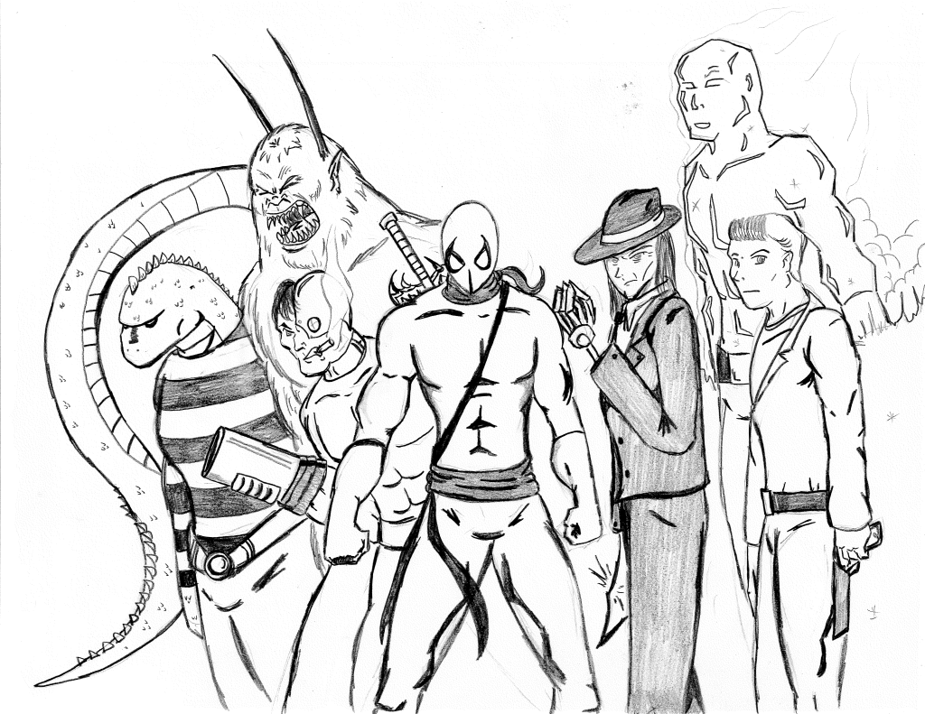 These first three drawings were my initial team rosters. Lance would lead the Red Strike Team along with his wife Holli, who would finally become an active Destructor. I had her in the comics for three seasons, and she was nothing more than window dressing. Such a waste. Additionally, Pitchfork aka Jamin Sponaugle, would officially become a Destructor, leaving behind the Eliminators. That leaves an open question regarding the fate of the other team members. The Xenogenesis would have also joined, bridging the gap between the Vigilantes and the Destructors. Lastly is Lightning Volt, aka Cedric Ryan, who was an alternate Lightning Bolt creation I came up with. I’m not quite sure why I did since he has no relation to Harold Cane. I’m sure there is a reason somewhere in my head. But he’s like a Miles Morales-type character in a sense.