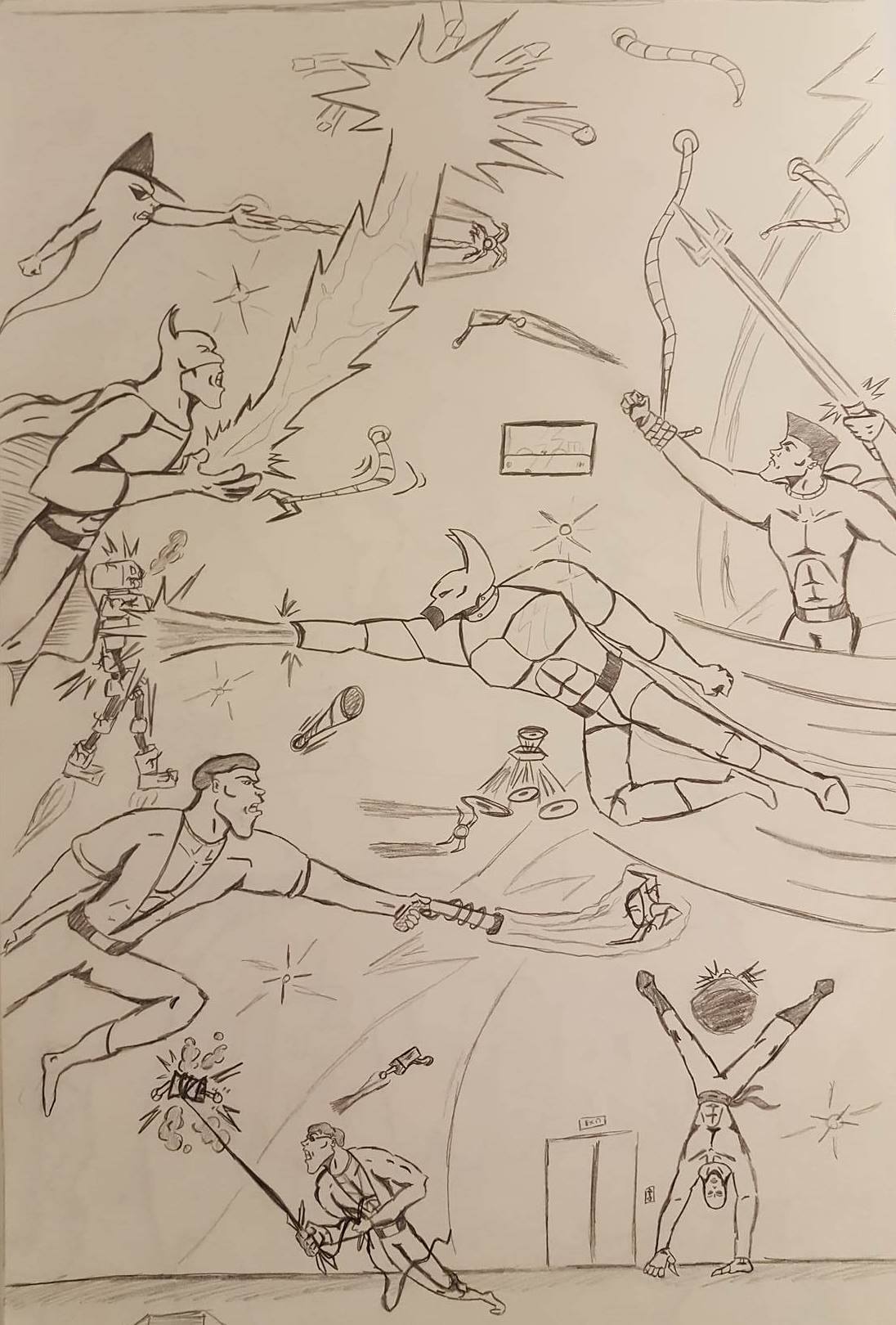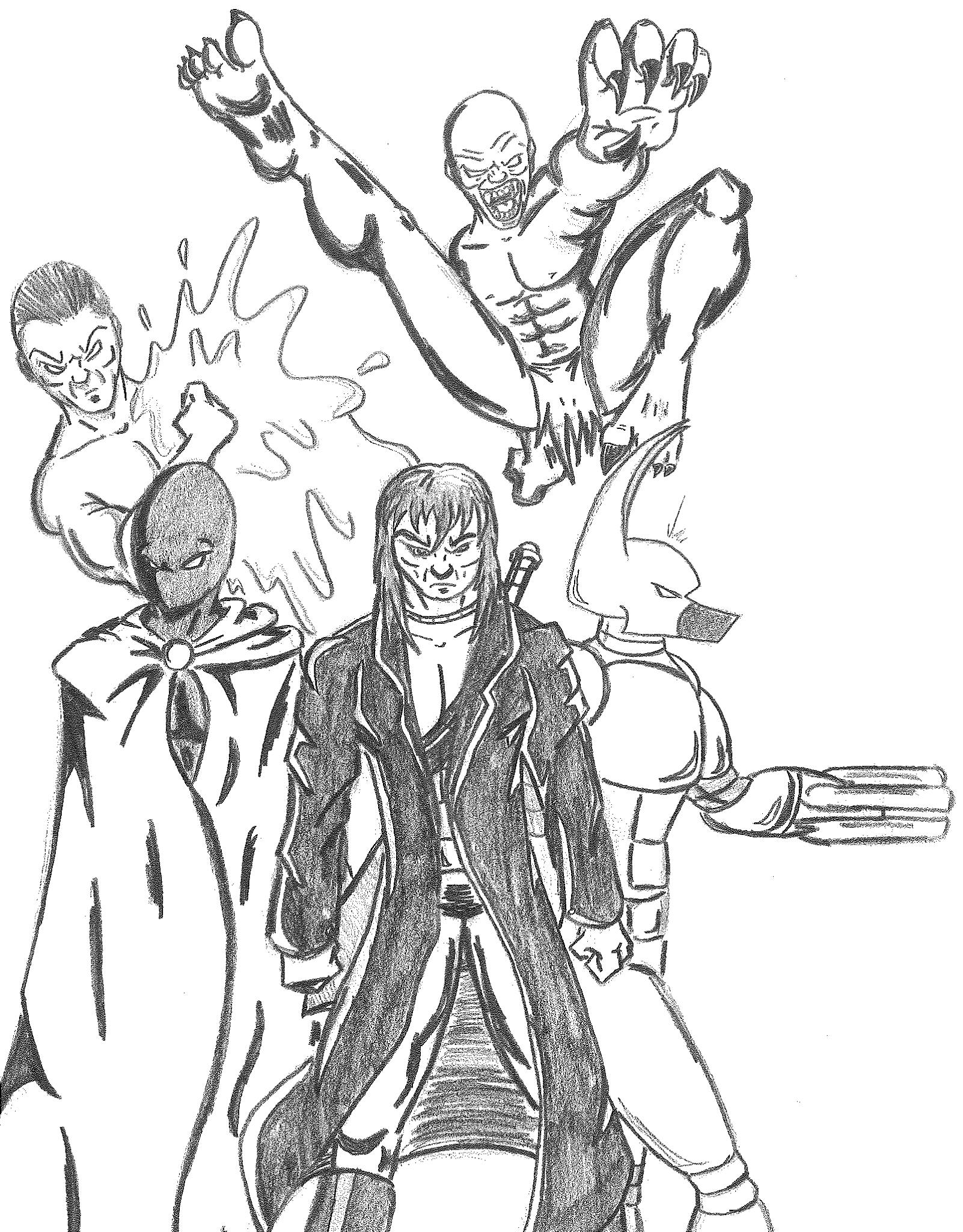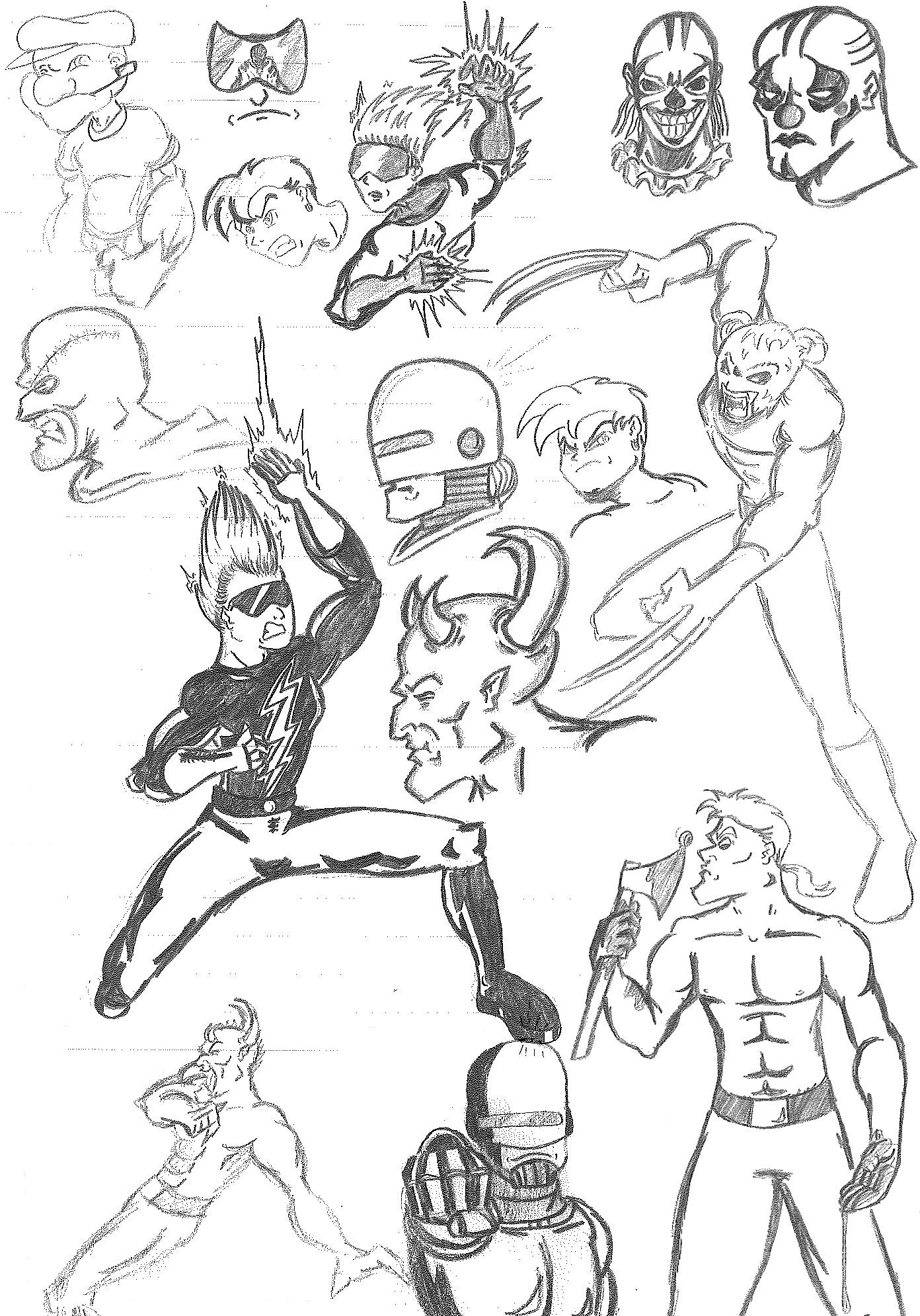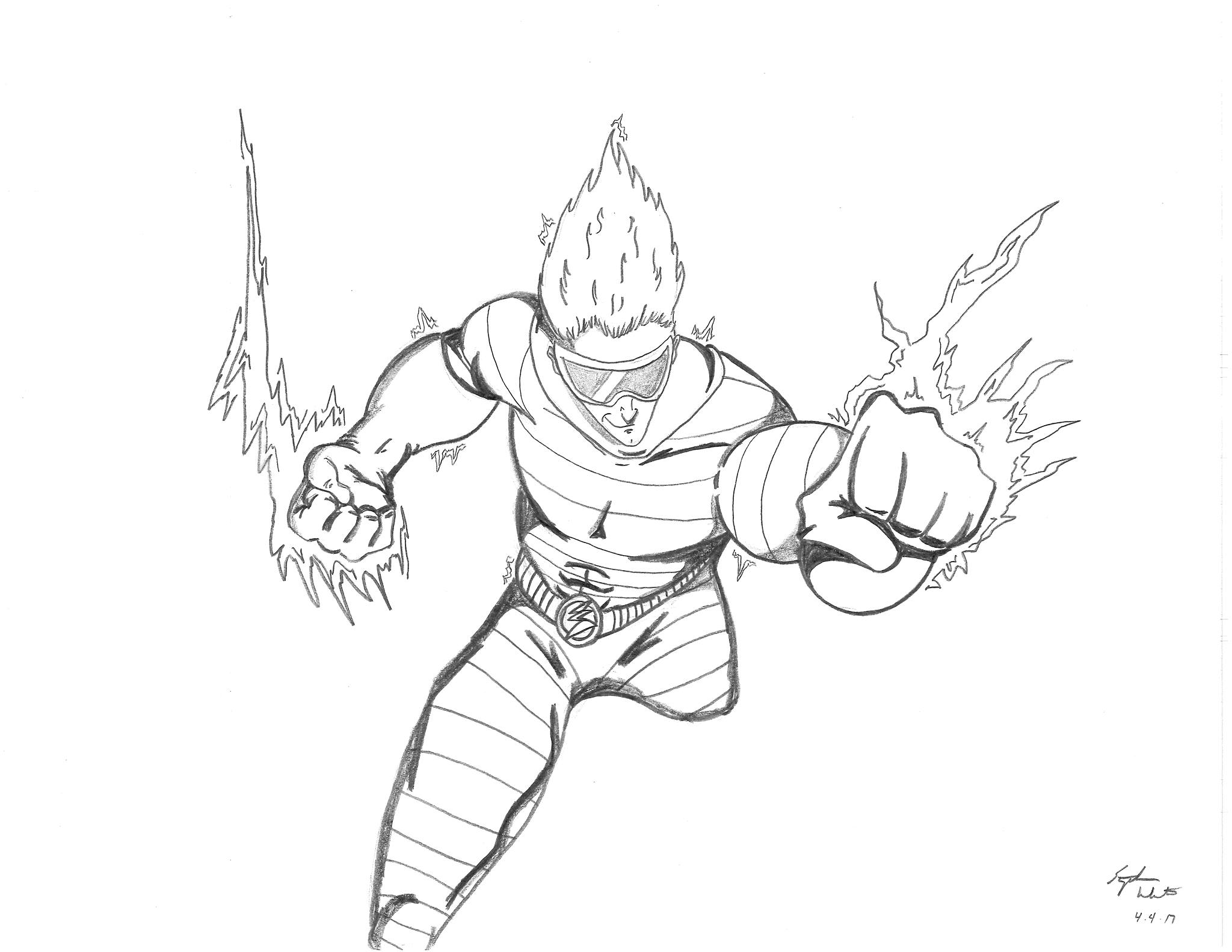 These first three drawings were my initial team rosters. Lance would lead the Red Strike Team along with his wife Holli, who would finally become an active Destructor. I had her in the comics for three seasons, and she was nothing more than window dressing. Such a waste. Additionally, Pitchfork aka Jamin Sponaugle, would officially become a Destructor, leaving behind the Eliminators. That leaves an open question regarding the fate of the other team members. The Xenogenesis would have also joined, bridging the gap between the Vigilantes and the Destructors. Lastly is Lightning Volt, aka Cedric Ryan, who was an alternate Lightning Bolt creation I came up with. I’m not quite sure why I did since he has no relation to Harold Cane. I’m sure there is a reason somewhere in my head. But he’s like a Miles Morales-type character in a sense.