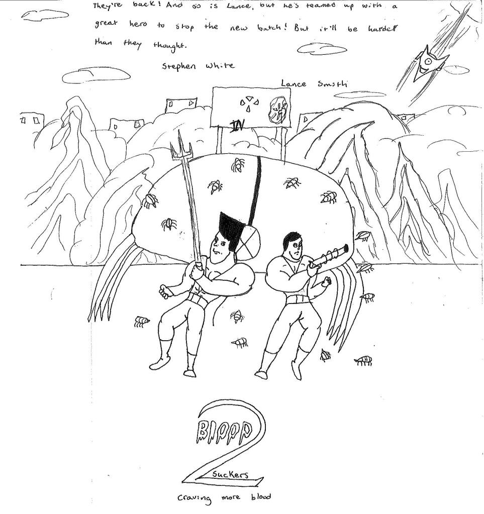 To establish a connection, I wrote a sequel to Blood Suckers that would feature Stephen coming to Detroit, Michigan and helping with a second invasion of leeches. While I did not indicate any formation of a team within the sequel, the heroes had met. So, in my head, when Lance shows up in Lightning Bolt & the Ghost Kid, it doesn’t feel completely random. I’m sure I could have done more to establish these connections, but as I’ve stated many times on other pages, I was just a kid.