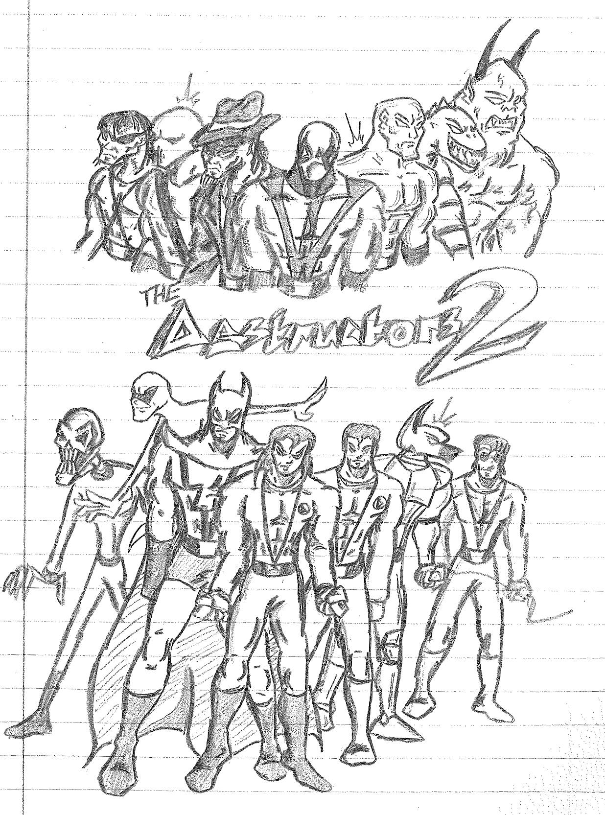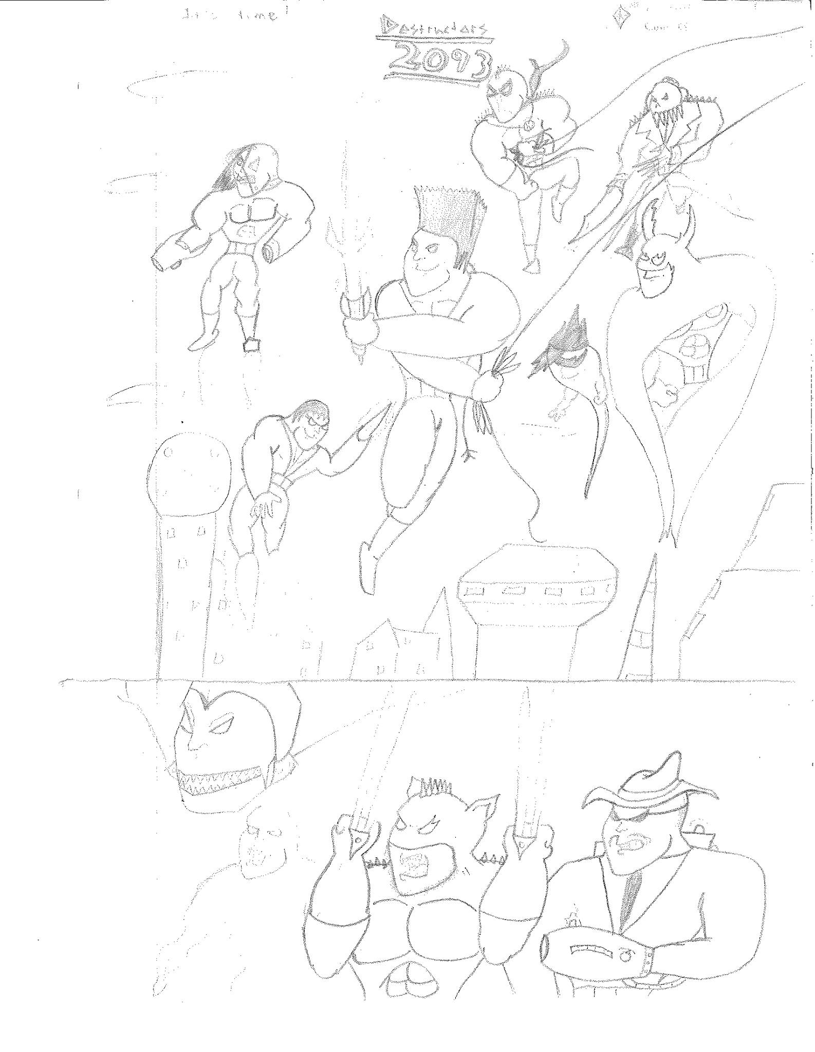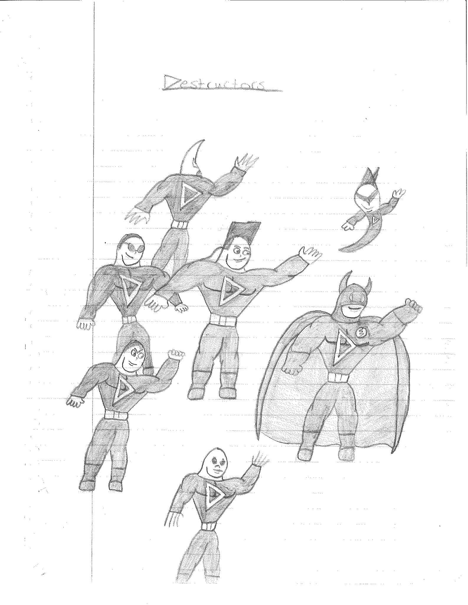 Eventually, I began to restructure the teams a bit in different drawings. The one on the left swaps D. Vice and Pitchfork, which doesn’t makes sense to me. You’d think you’d want veteran members leading a team. The picture on the right is a rare sight since it is in color. Not sure I dig all of the colors I chose, but I never did think about them too much. It does seem like the teams are still stacked together in a way. However, in this interpretation, Lance has a new weapon while Holli has a whole new look AND a weapon. Xerox got a trench coat because that was trend for a bit. Jack got an official outfit. Lightning Volt has a new costume while Nightbird has been removed entirely in place of a character that looks like the original Lightning Bolt. However, I believe this was meant to be Harold’s son from the Electric Duo. Rocket’s new helmet also makes me think that is Rocket’s kid, Blaster. But if that’s the case, then where is Junior and the rest? That’s a pretty important question when you see “S” at the top. He was meant to serve as director of the Destructors. So, basically dealing with all the politics that I never touched on.