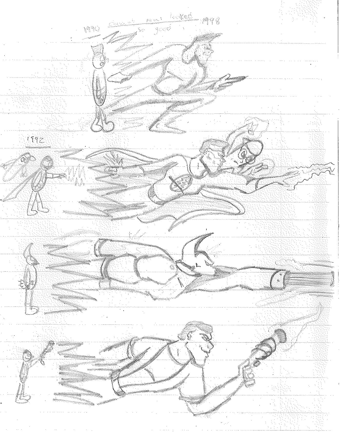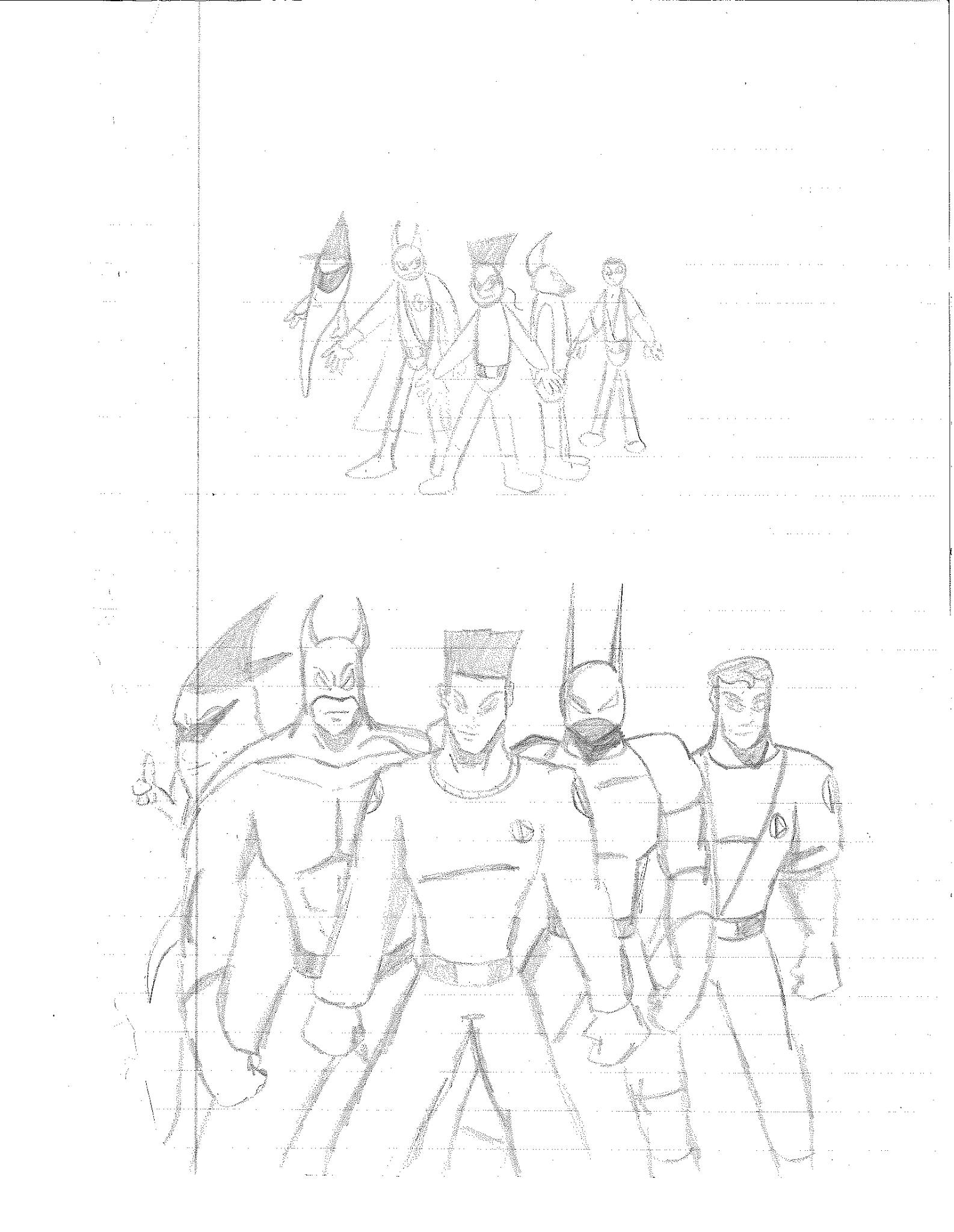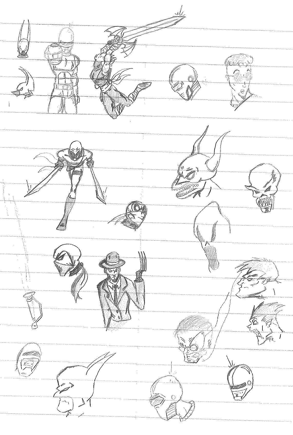 Eventually, I began to restructure the teams a bit in different drawings. The one on the left swaps D. Vice and Pitchfork, which doesn’t makes sense to me. You’d think you’d want veteran members leading a team. The picture on the right is a rare sight since it is in color. Not sure I dig all of the colors I chose, but I never did think about them too much. It does seem like the teams are still stacked together in a way. However, in this interpretation, Lance has a new weapon while Holli has a whole new look AND a weapon. Xerox got a trench coat because that was trend for a bit. Jack got an official outfit. Lightning Volt has a new costume while Nightbird has been removed entirely in place of a character that looks like the original Lightning Bolt. However, I believe this was meant to be Harold’s son from the Electric Duo. Rocket’s new helmet also makes me think that is Rocket’s kid, Blaster. But if that’s the case, then where is Junior and the rest? That’s a pretty important question when you see “S” at the top. He was meant to serve as director of the Destructors. So, basically dealing with all the politics that I never touched on.