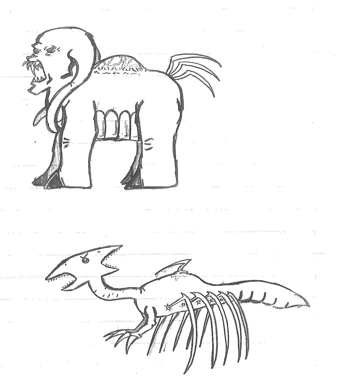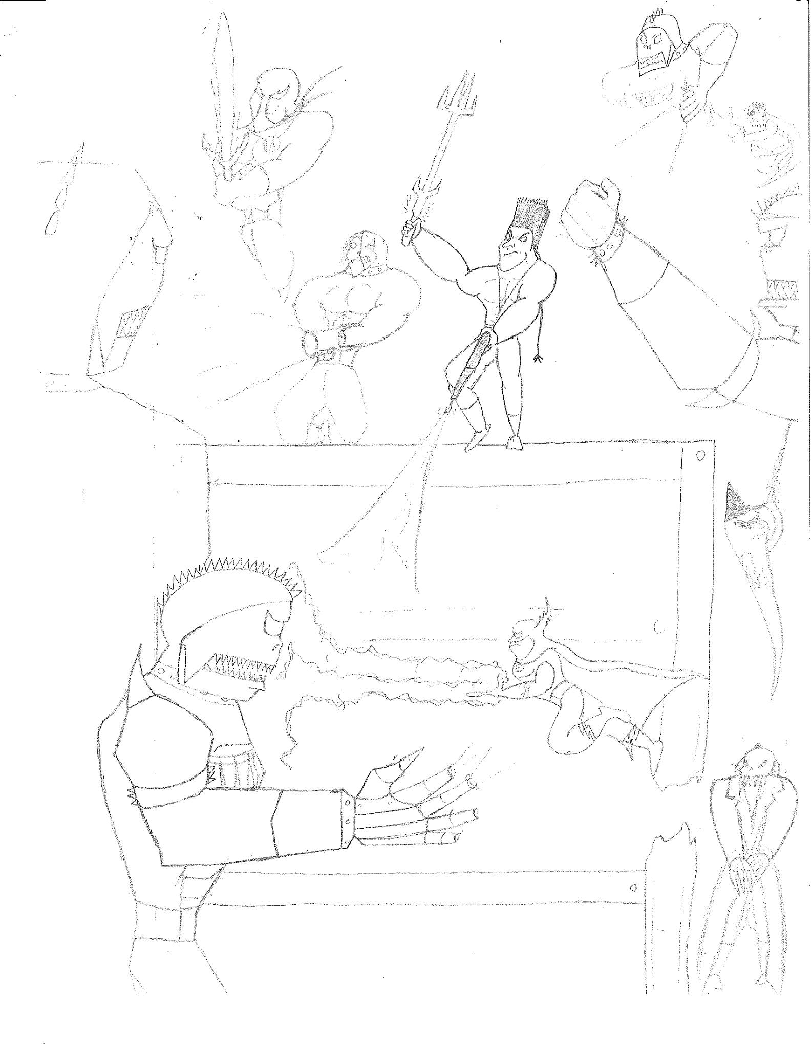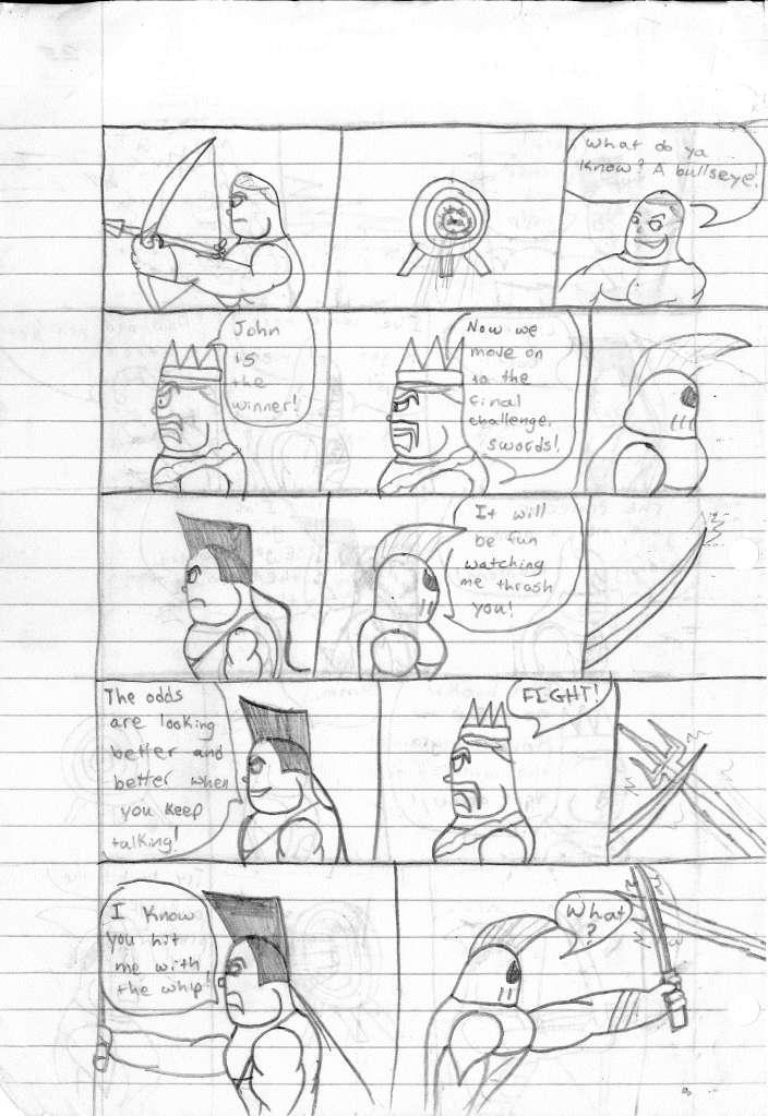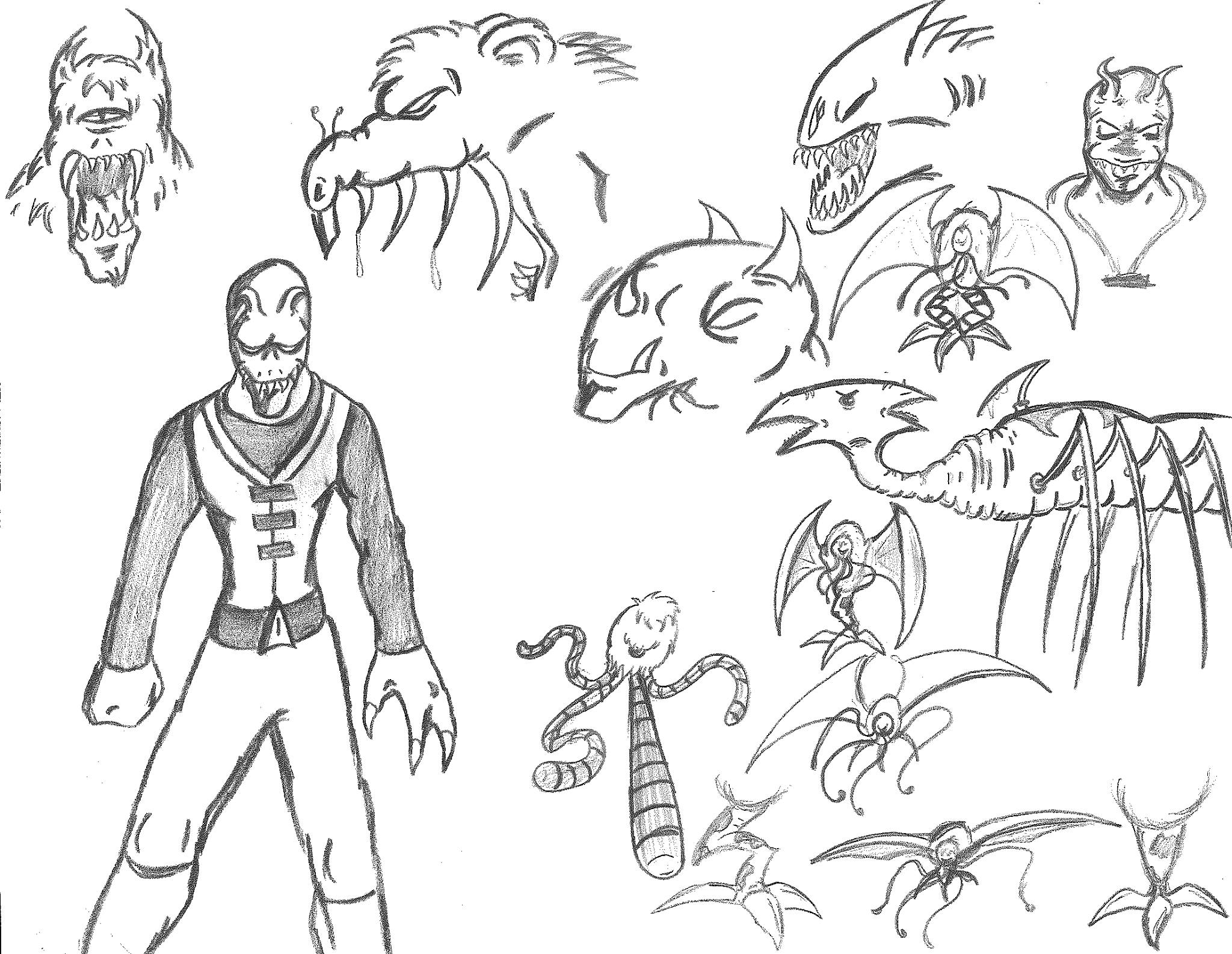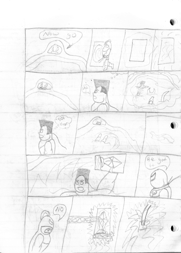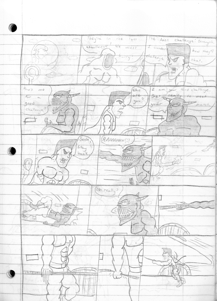 The creature that Stephen fought in his strength trial was actually designed for a different project. At one point in time, I had considered writing a sequel series to Stephen’s Wacky Maze. However, as I planned the concept, I struggled to figure out what the plot was. I didn’t want to rehash the same series but in the future. I really worked to make it stand apart, complete with its own versions of the baddies from the first series. One of those baddies was a creature named Poison, which was meant to be some mish-mash of a snake and a spider. The preliminary design does not reflect that, but eventually did design THAT version of him. Poison was also featured in Stephen’s Wacky Maze II: Trouble in Wackyland as one of the primary baddies.