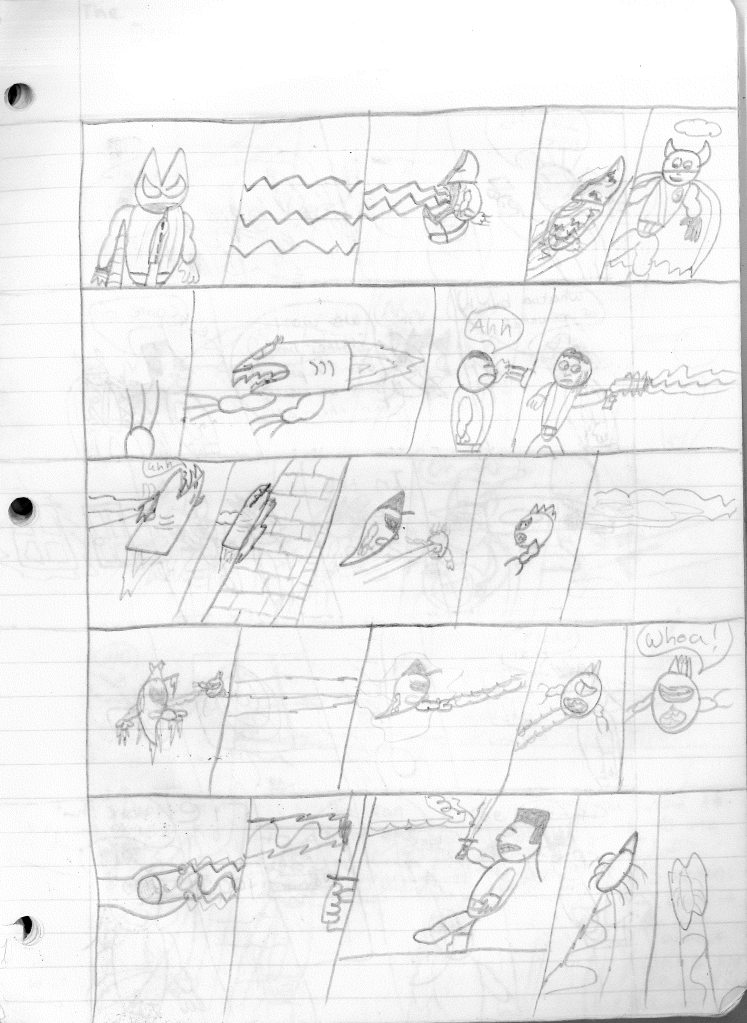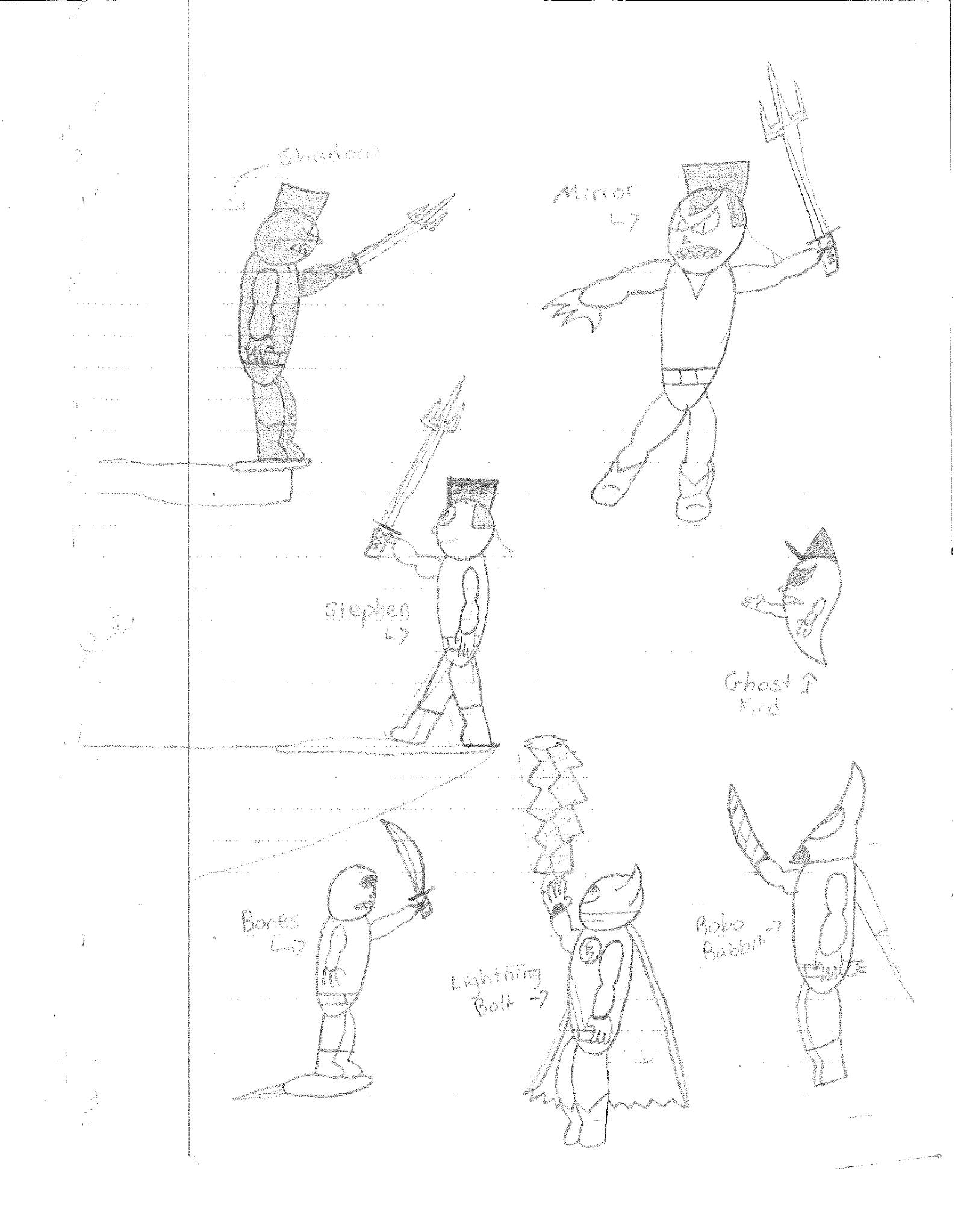 While most series featuring a team of heroes would go on to encounter a number of original villains over the course of a season, I apparently could only think of one which was that shape-shifting doctor that died unceremoniously back in episode three. Everything else, minus the three-part Ghost Kid special, features a doppelganger. And then I upped the ante and made doppelgangers out of doppelgangers. Not very original on my part, but as I said, I was obsessed. I will say that I have considered different designs for both Robo-Rabbit 4 and Mirror’s Shadow, mainly because I feel like they would look more bastardized than how I drew them.