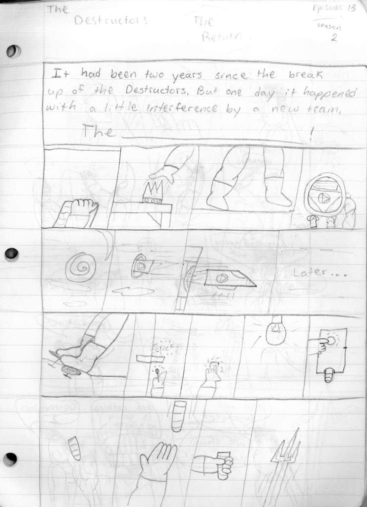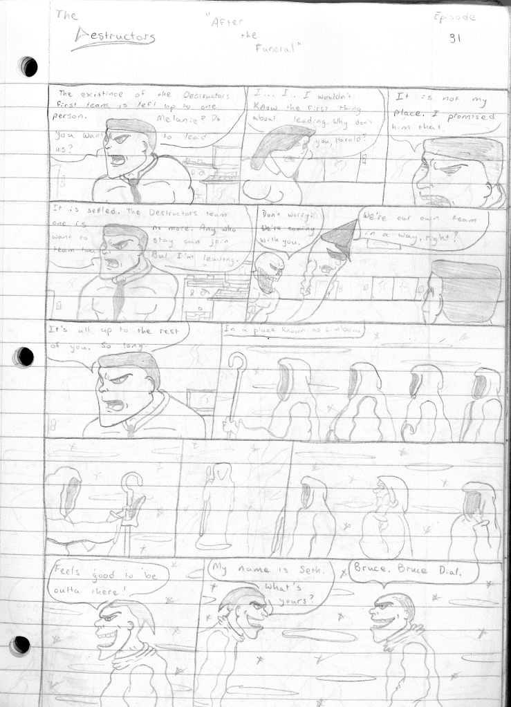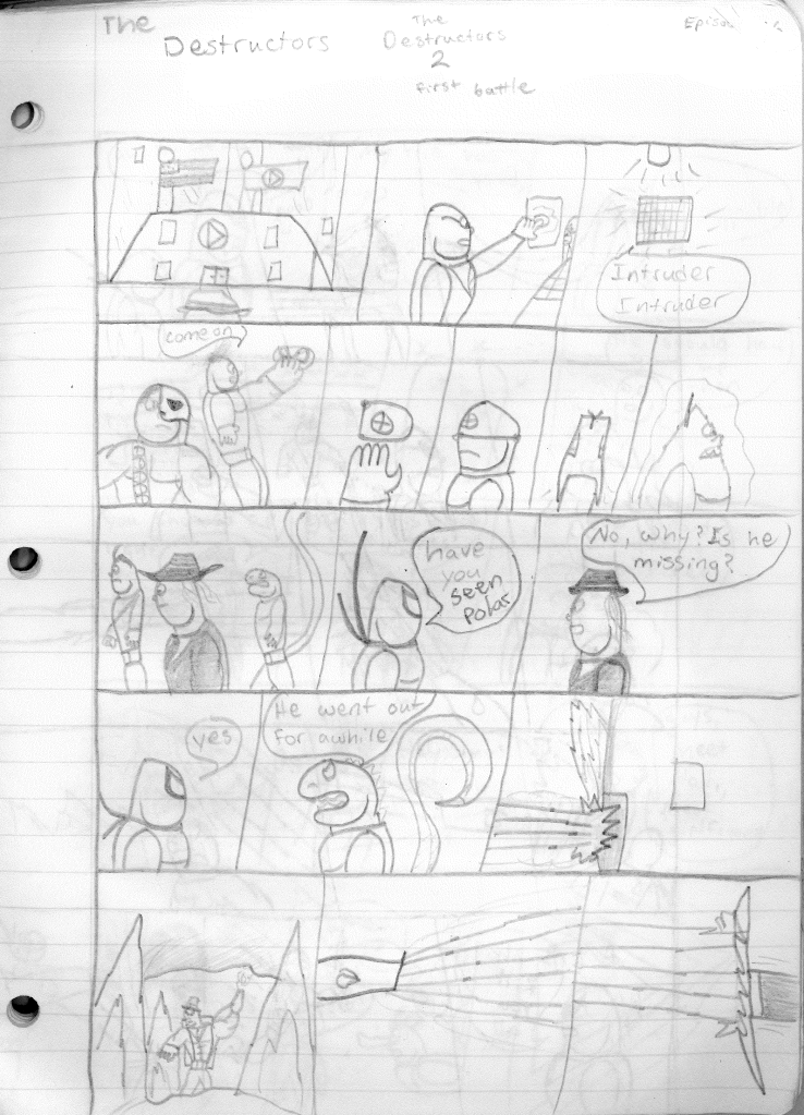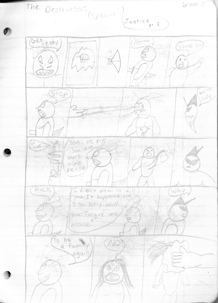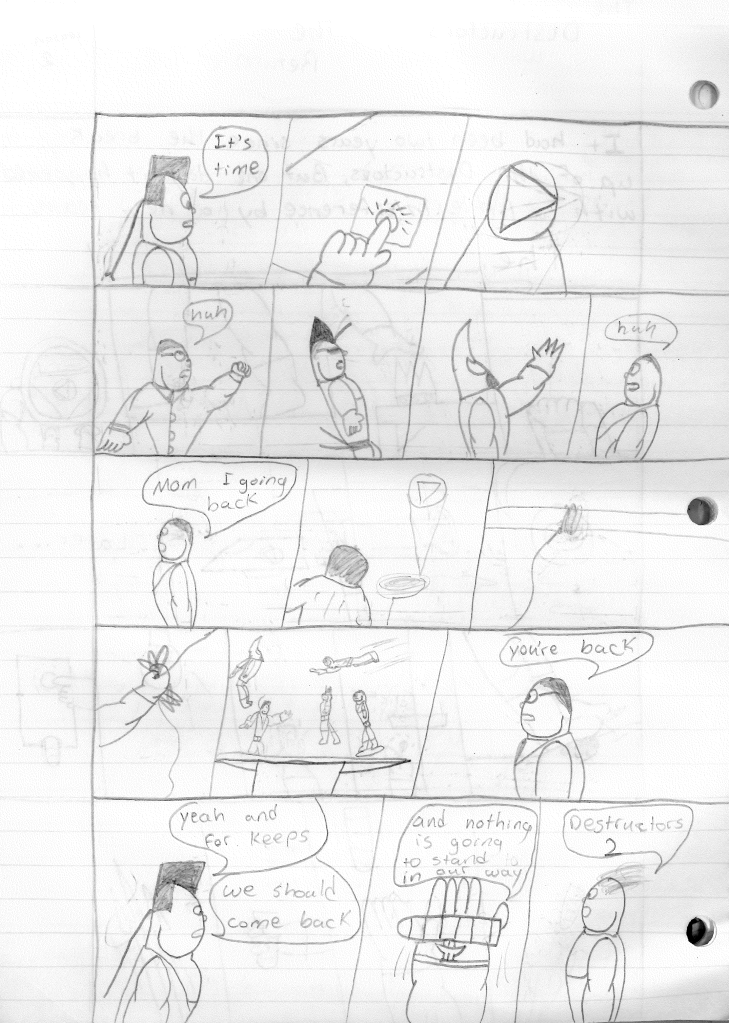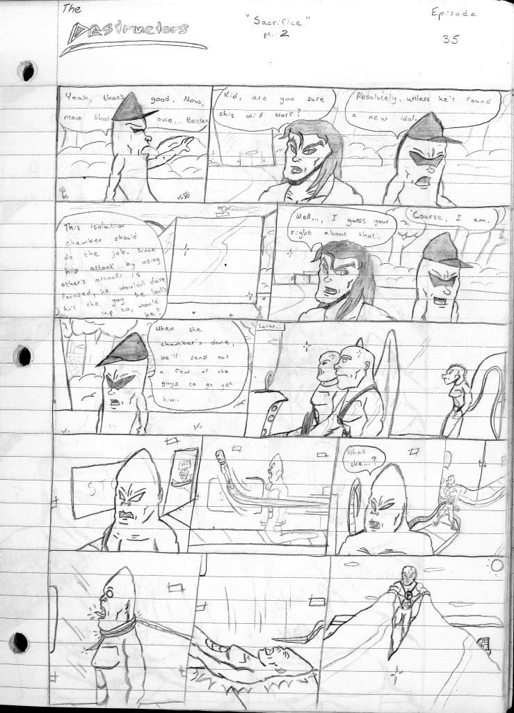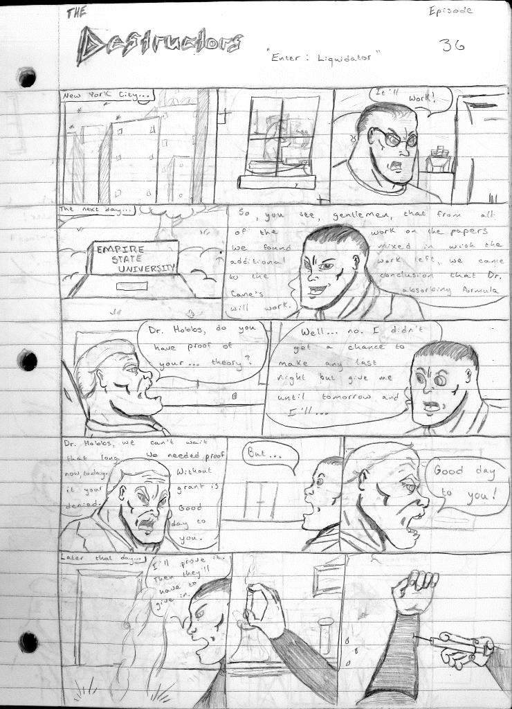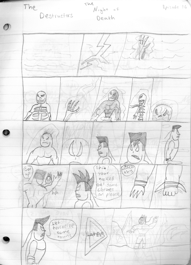 This was the last Destructors story that I wrote to completion. Which is really sad that I ended it on a cliffhanger. Furthermore, this episode showcases the growth I was having as a writer since the Destructors did not show up once. I say this showcases growth, because I’m focused on getting to know our villain. If you go back to the previous episode, it was page five before Lightning Bolt and his gang show up to investigate. I feel like this story should not have been split into two parts since I was basically working up to the same amount of story pages, if not less. But for dramatic purposes (and probably a lack of ideas), I ended this episode here.