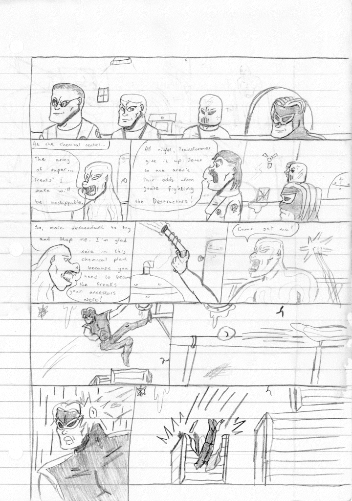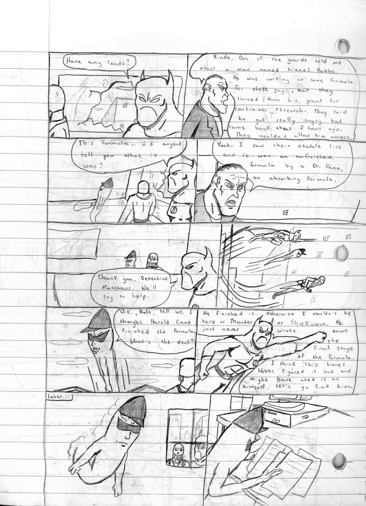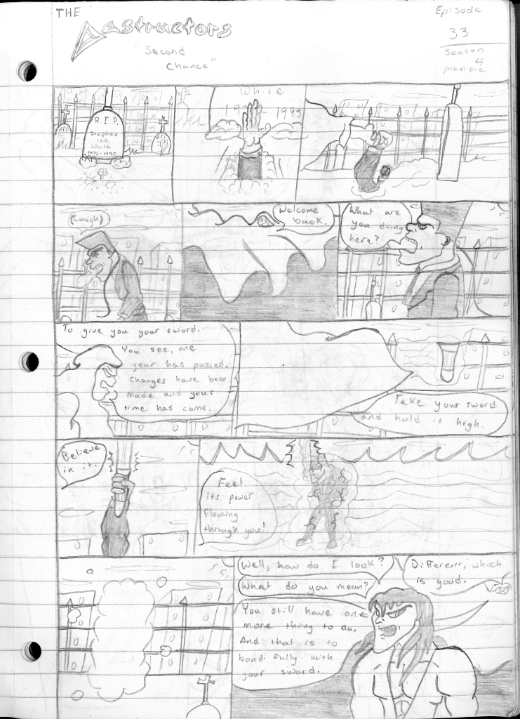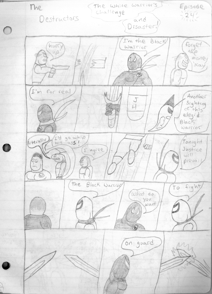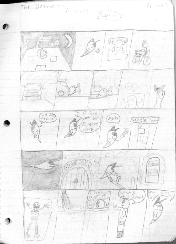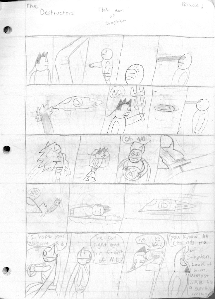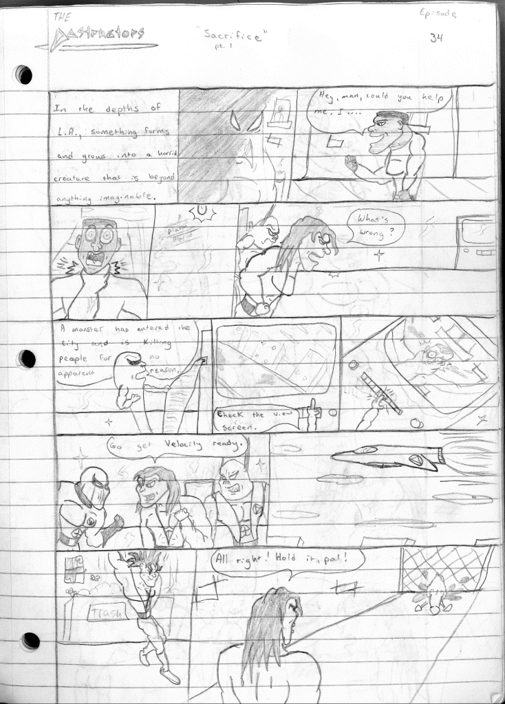 This was the last Destructors story that I wrote to completion. Which is really sad that I ended it on a cliffhanger. Furthermore, this episode showcases the growth I was having as a writer since the Destructors did not show up once. I say this showcases growth, because I’m focused on getting to know our villain. If you go back to the previous episode, it was page five before Lightning Bolt and his gang show up to investigate. I feel like this story should not have been split into two parts since I was basically working up to the same amount of story pages, if not less. But for dramatic purposes (and probably a lack of ideas), I ended this episode here.