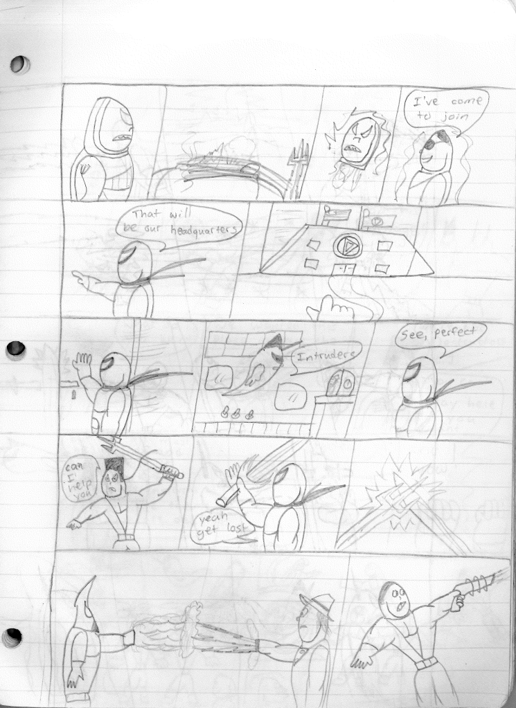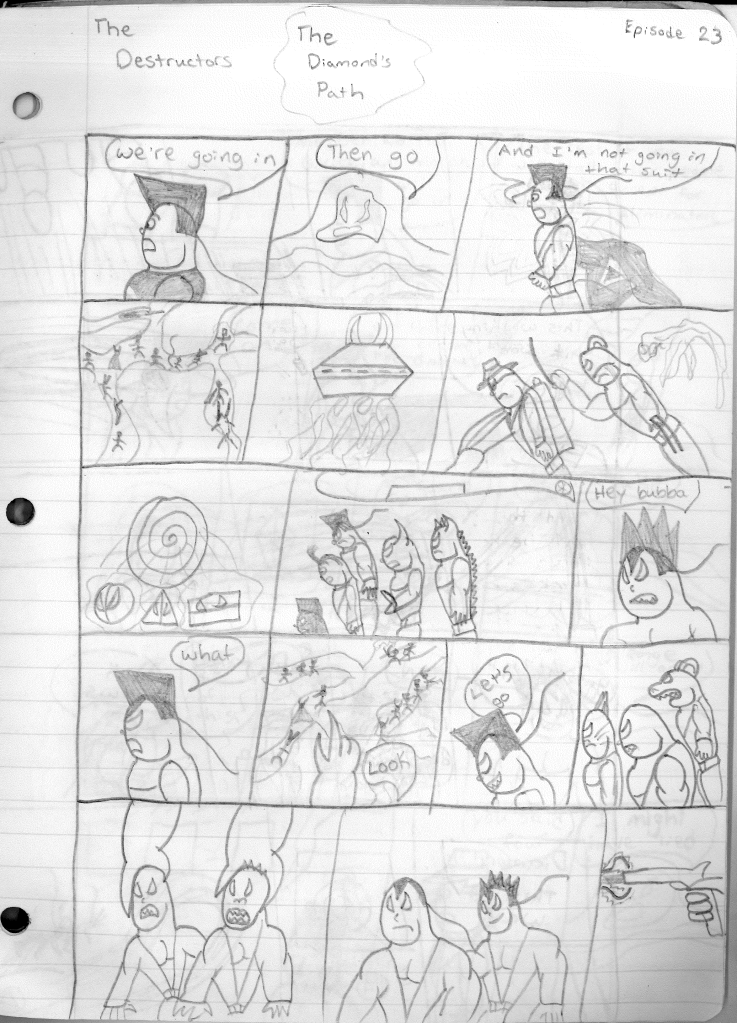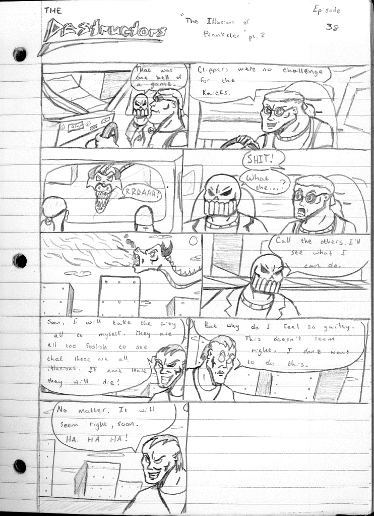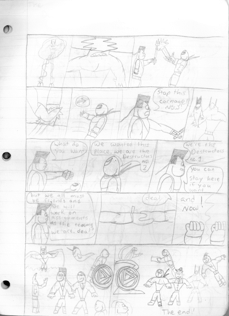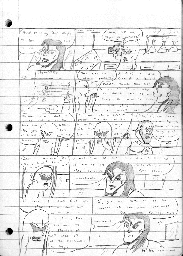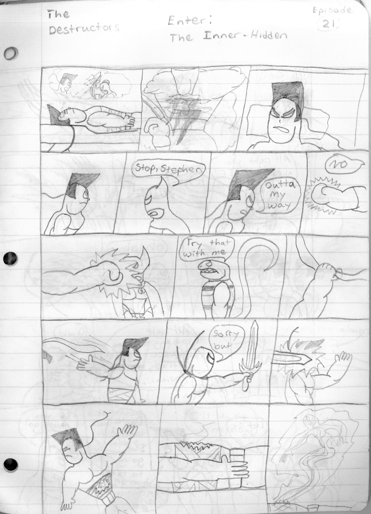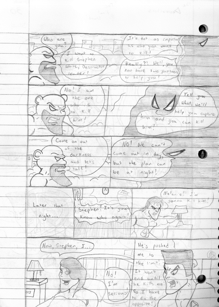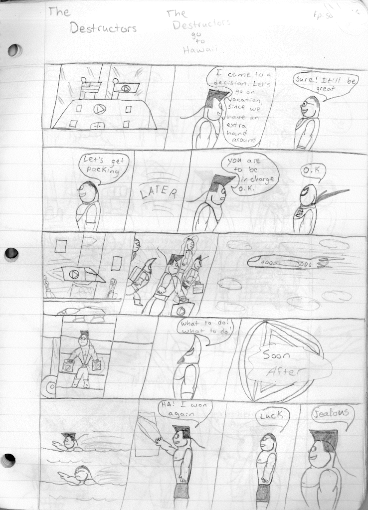 This was the last Destructors story that I wrote to completion. Which is really sad that I ended it on a cliffhanger. Furthermore, this episode showcases the growth I was having as a writer since the Destructors did not show up once. I say this showcases growth, because I’m focused on getting to know our villain. If you go back to the previous episode, it was page five before Lightning Bolt and his gang show up to investigate. I feel like this story should not have been split into two parts since I was basically working up to the same amount of story pages, if not less. But for dramatic purposes (and probably a lack of ideas), I ended this episode here.