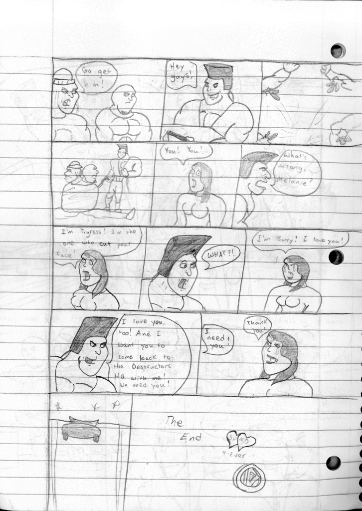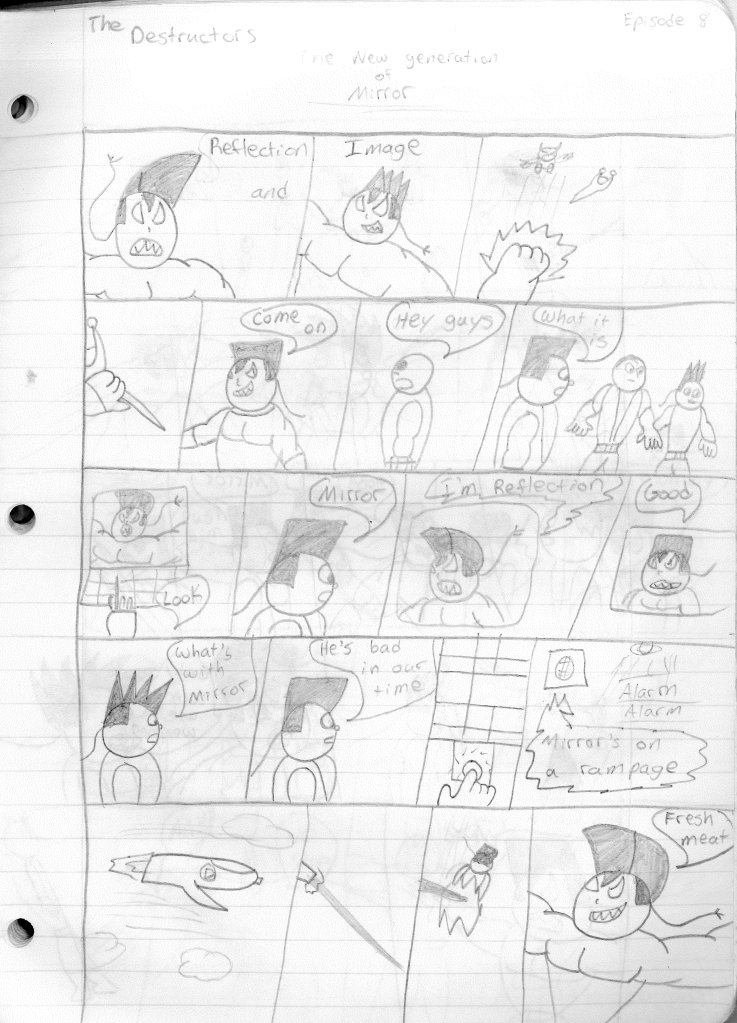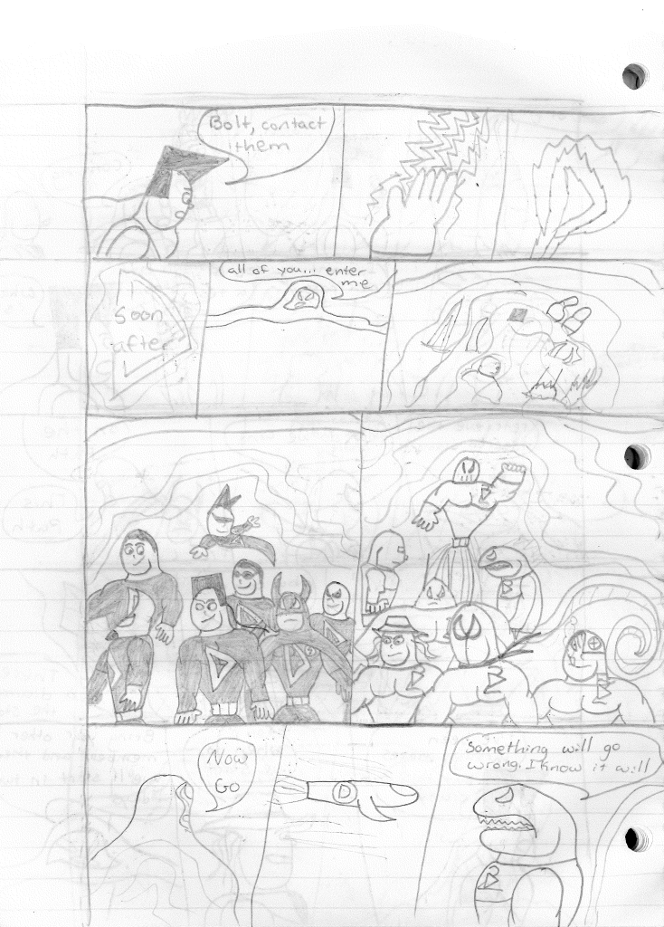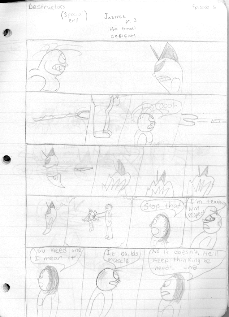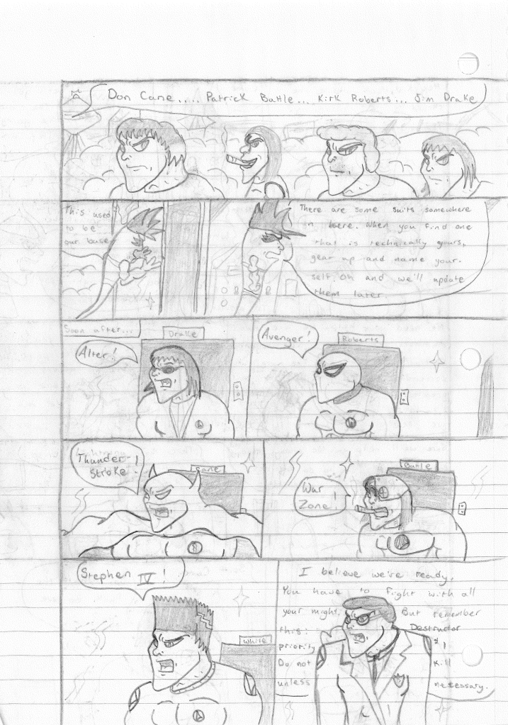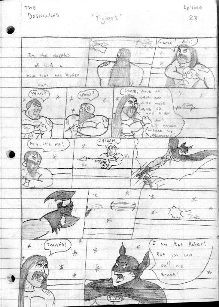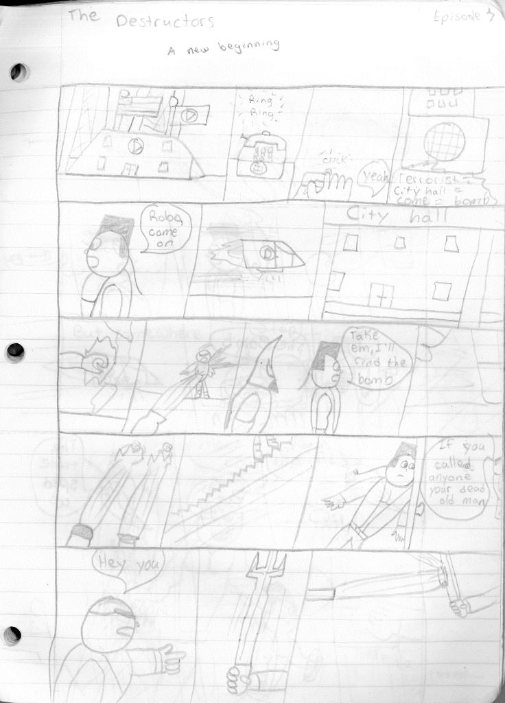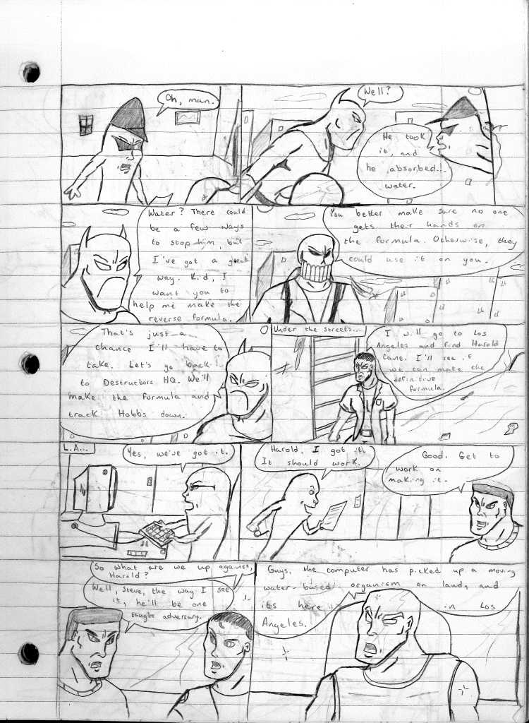 This was the last Destructors story that I wrote to completion. Which is really sad that I ended it on a cliffhanger. Furthermore, this episode showcases the growth I was having as a writer since the Destructors did not show up once. I say this showcases growth, because I’m focused on getting to know our villain. If you go back to the previous episode, it was page five before Lightning Bolt and his gang show up to investigate. I feel like this story should not have been split into two parts since I was basically working up to the same amount of story pages, if not less. But for dramatic purposes (and probably a lack of ideas), I ended this episode here.