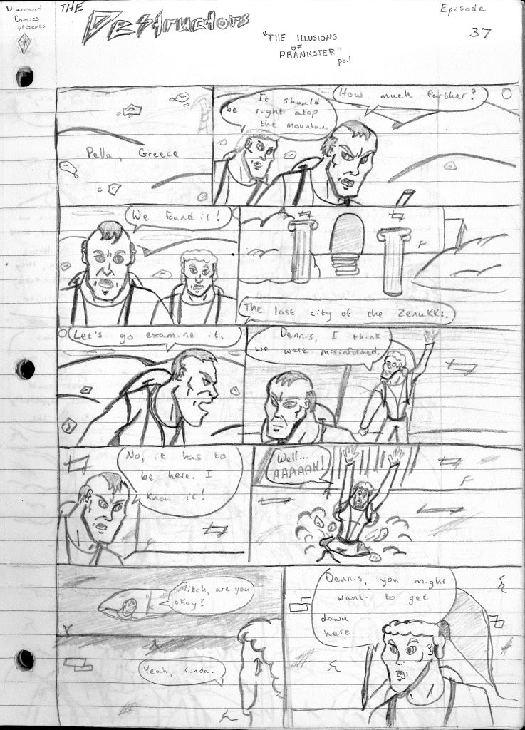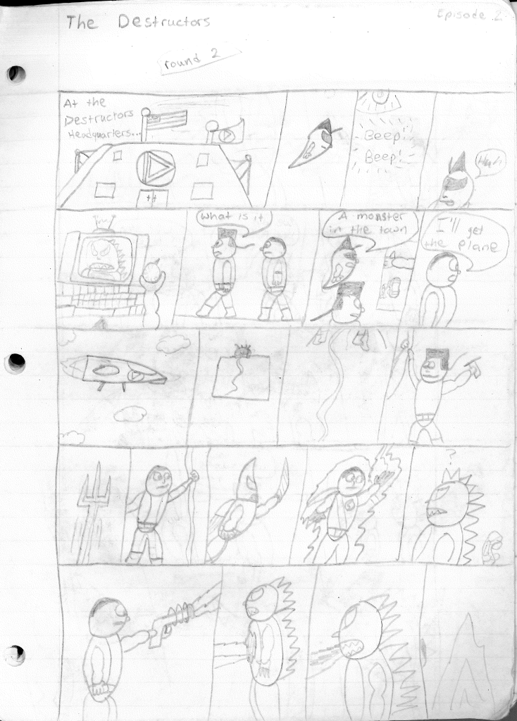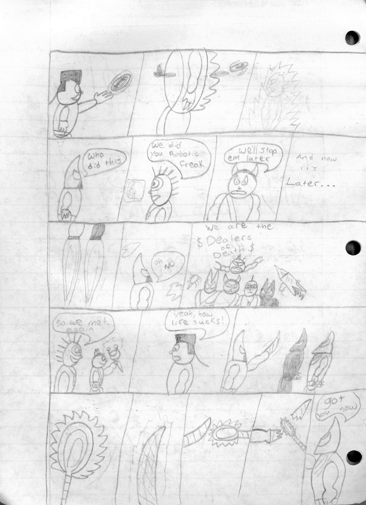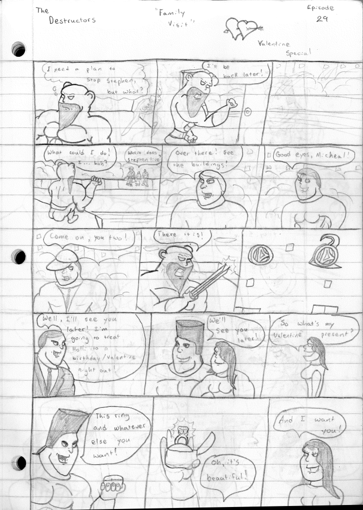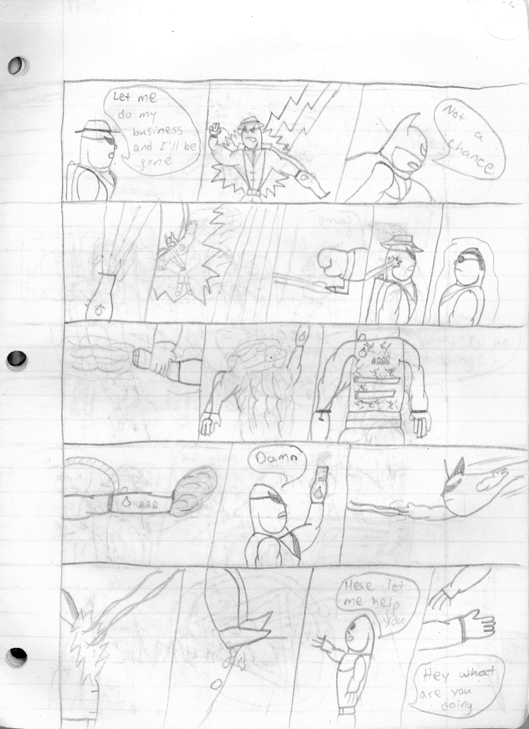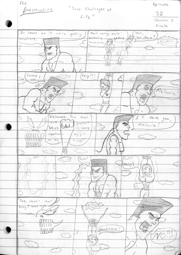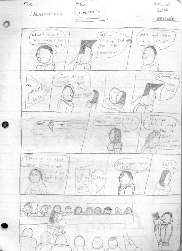 This was the last Destructors story that I wrote to completion. Which is really sad that I ended it on a cliffhanger. Furthermore, this episode showcases the growth I was having as a writer since the Destructors did not show up once. I say this showcases growth, because I’m focused on getting to know our villain. If you go back to the previous episode, it was page five before Lightning Bolt and his gang show up to investigate. I feel like this story should not have been split into two parts since I was basically working up to the same amount of story pages, if not less. But for dramatic purposes (and probably a lack of ideas), I ended this episode here.